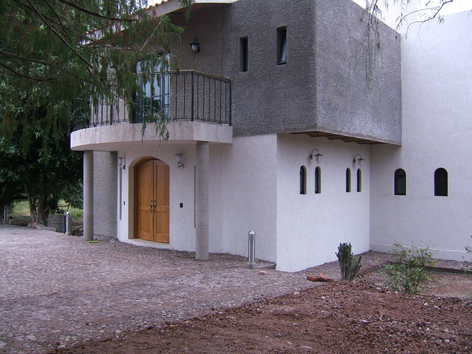 El frente de afuera con las puertas de la entrada. El área del patio de cerca de 300m2 y el camino a la casa de depósito ahora se están repavimentando con piedras del río en concreto.