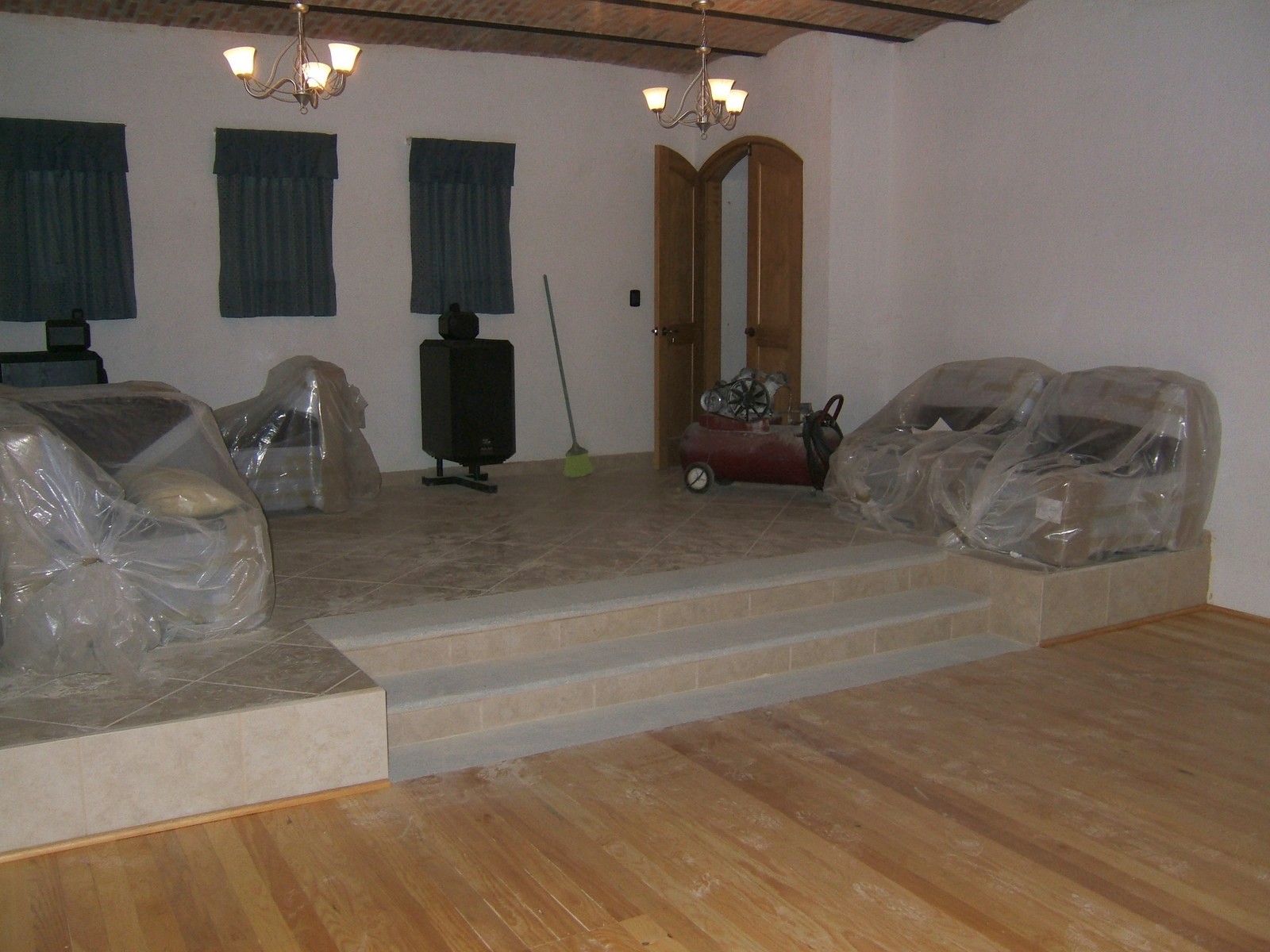 El piso de la estancia casi está terminado después de varios días de trabajo. La máquina por la puerta es un compresor de aire para una lijadora neumática; hay polvo por todas partes.