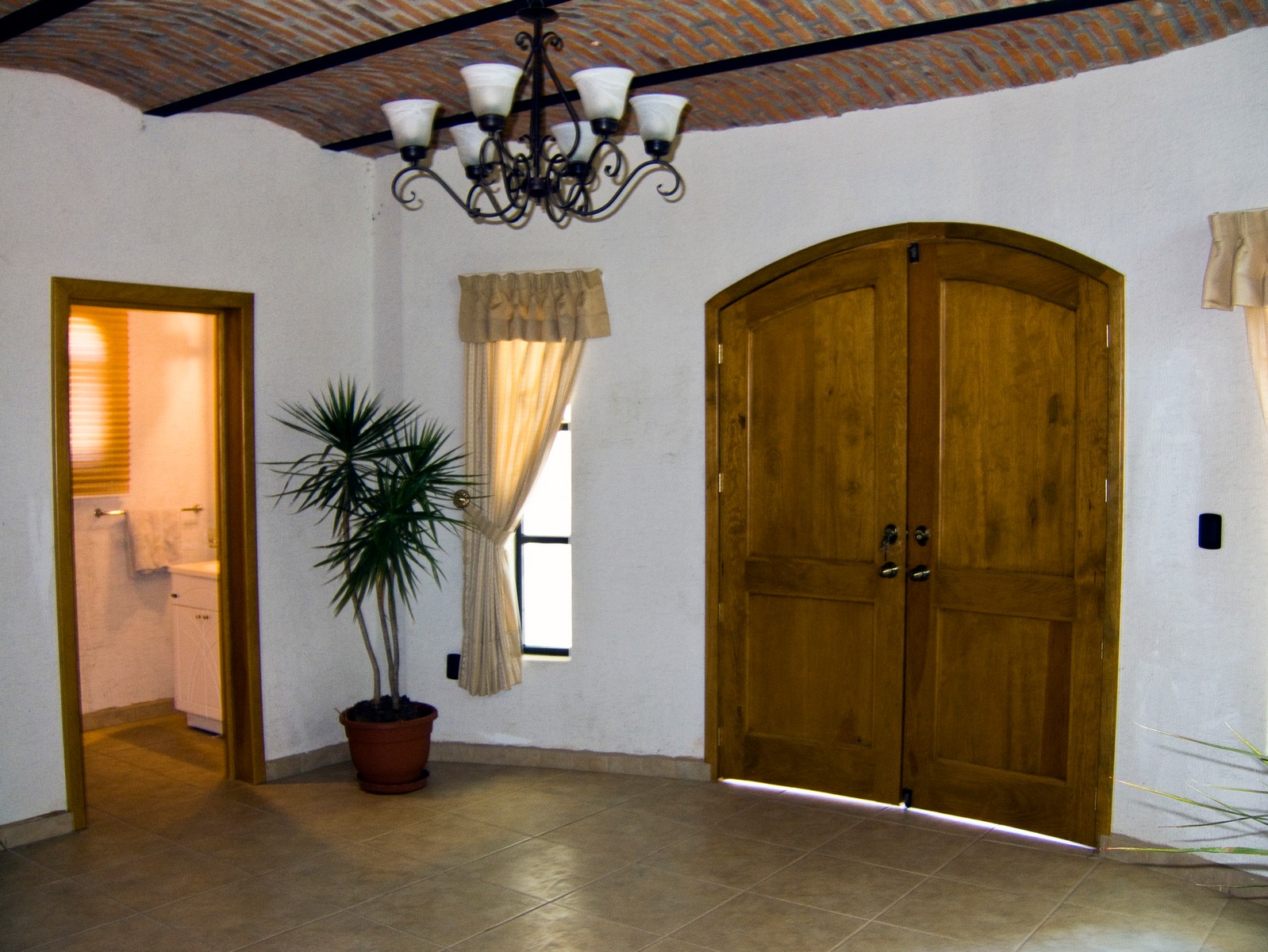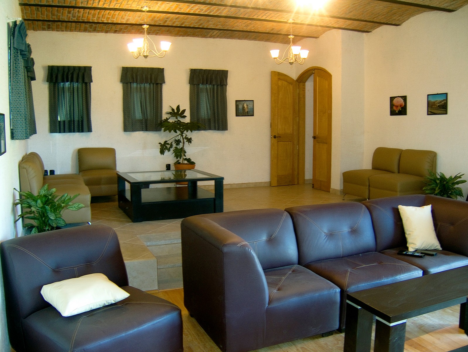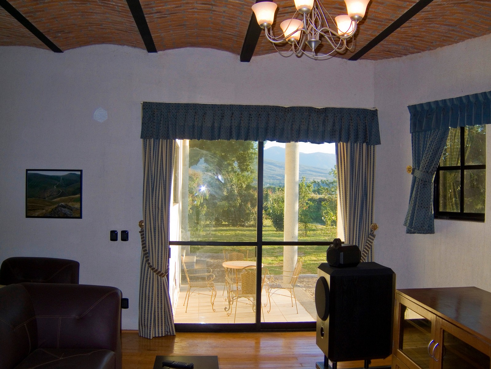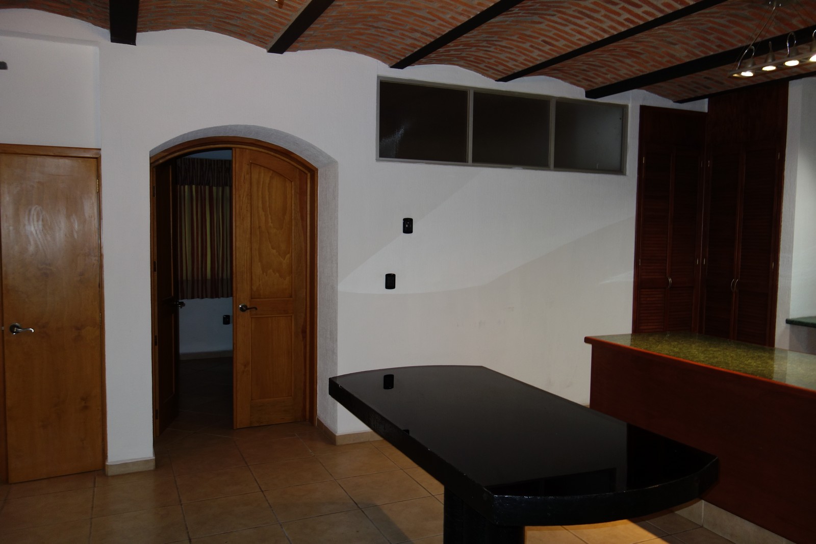 The living room is intended for audio and video entertainment; it has excellent acoustics due largely to the boveda ceiling, split level and curved front wall.