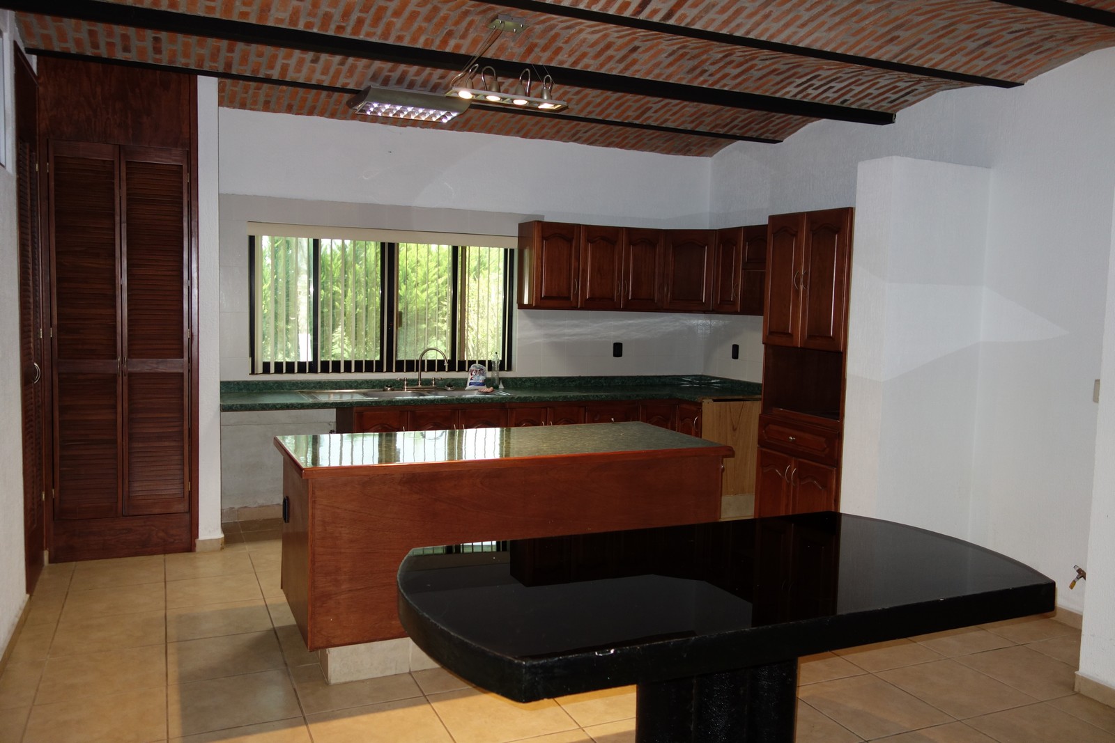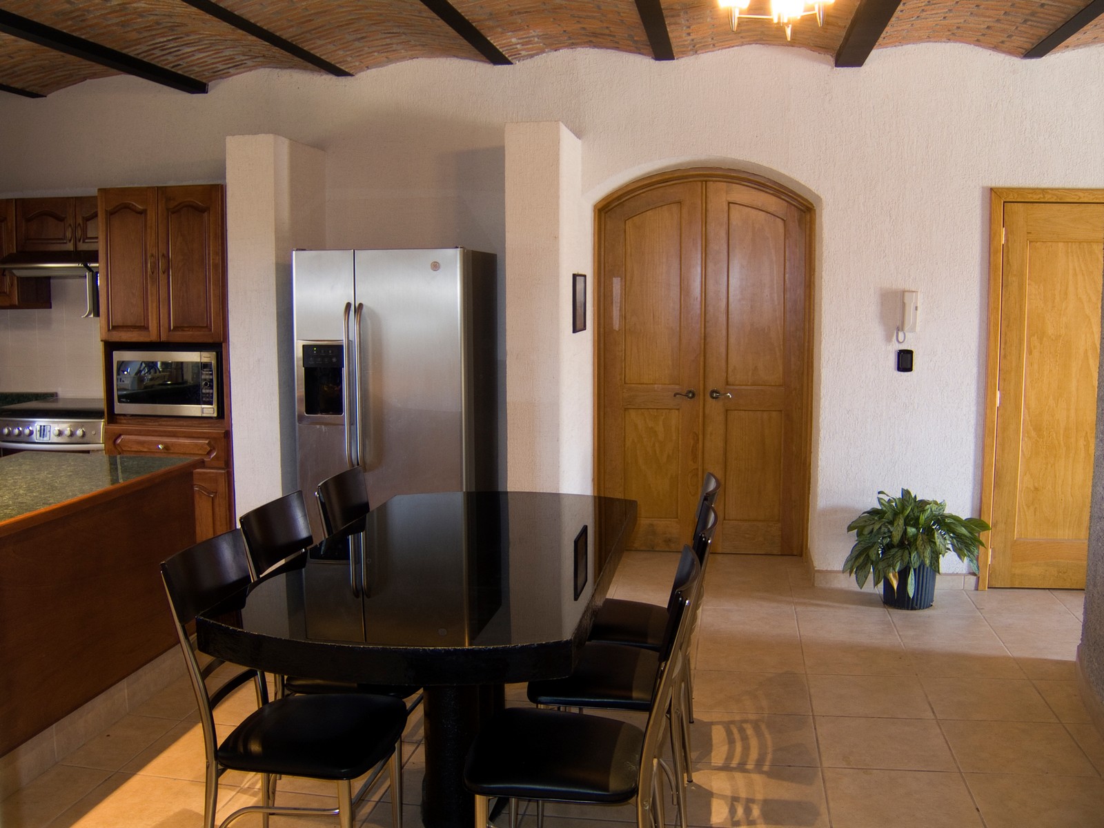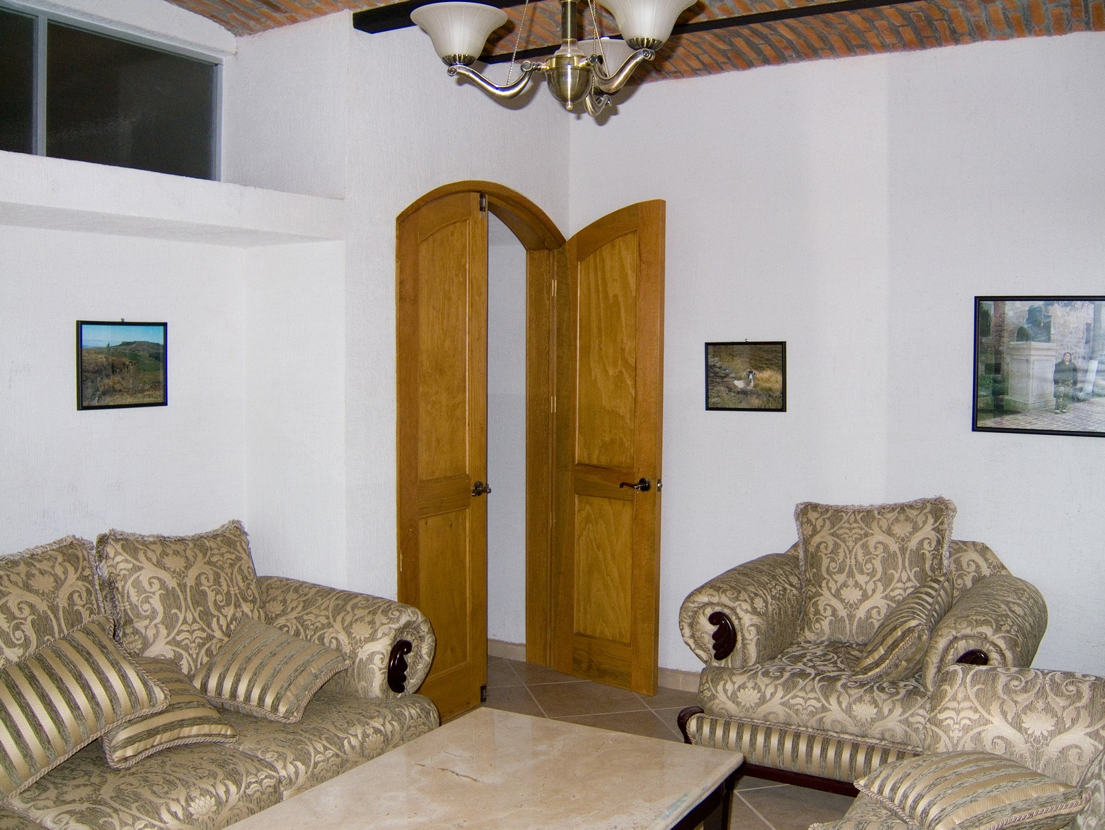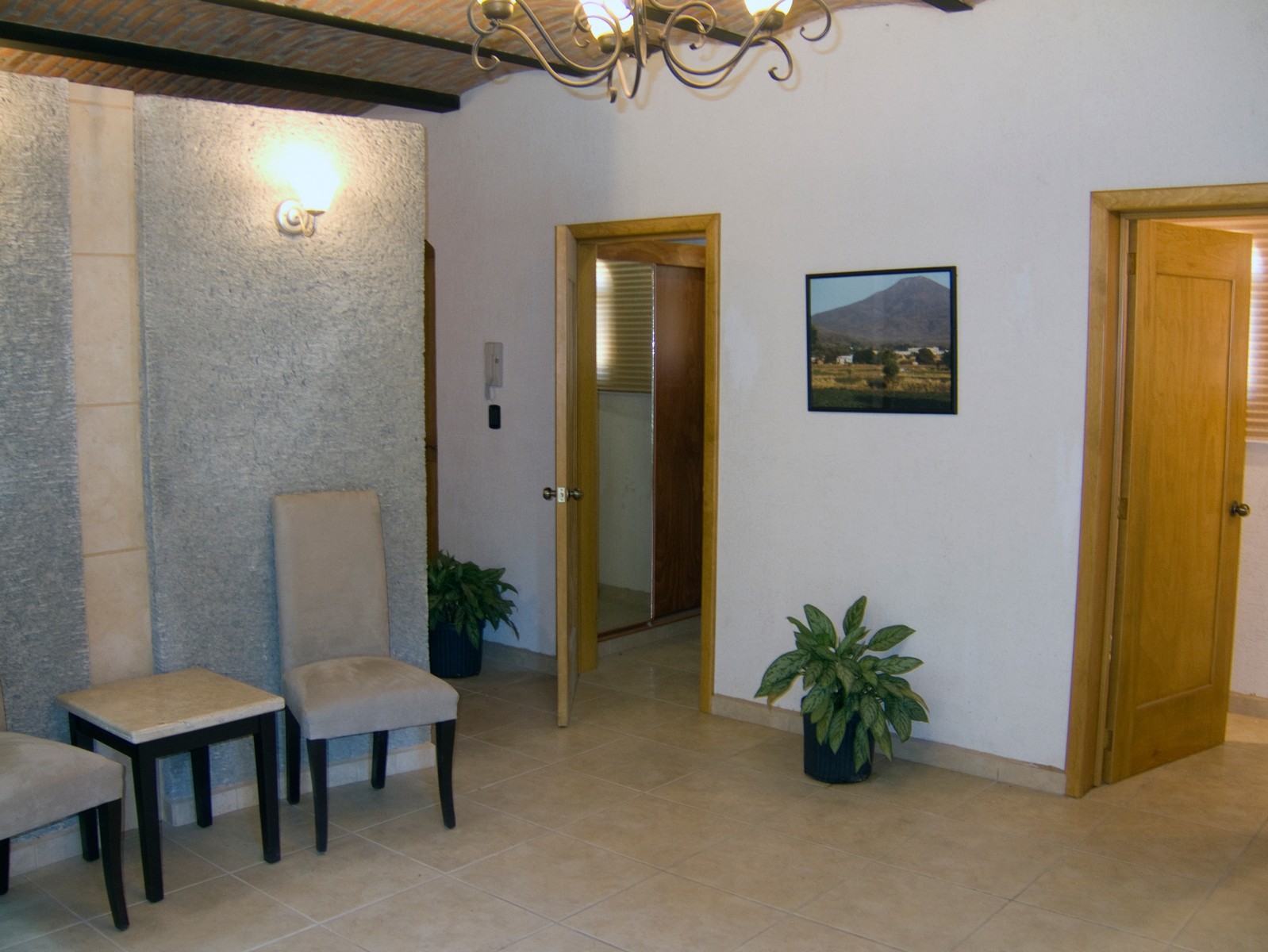 The living room is intended for audio and video entertainment; it has excellent acoustics due largely to the boveda ceiling, split level and curved front wall.
