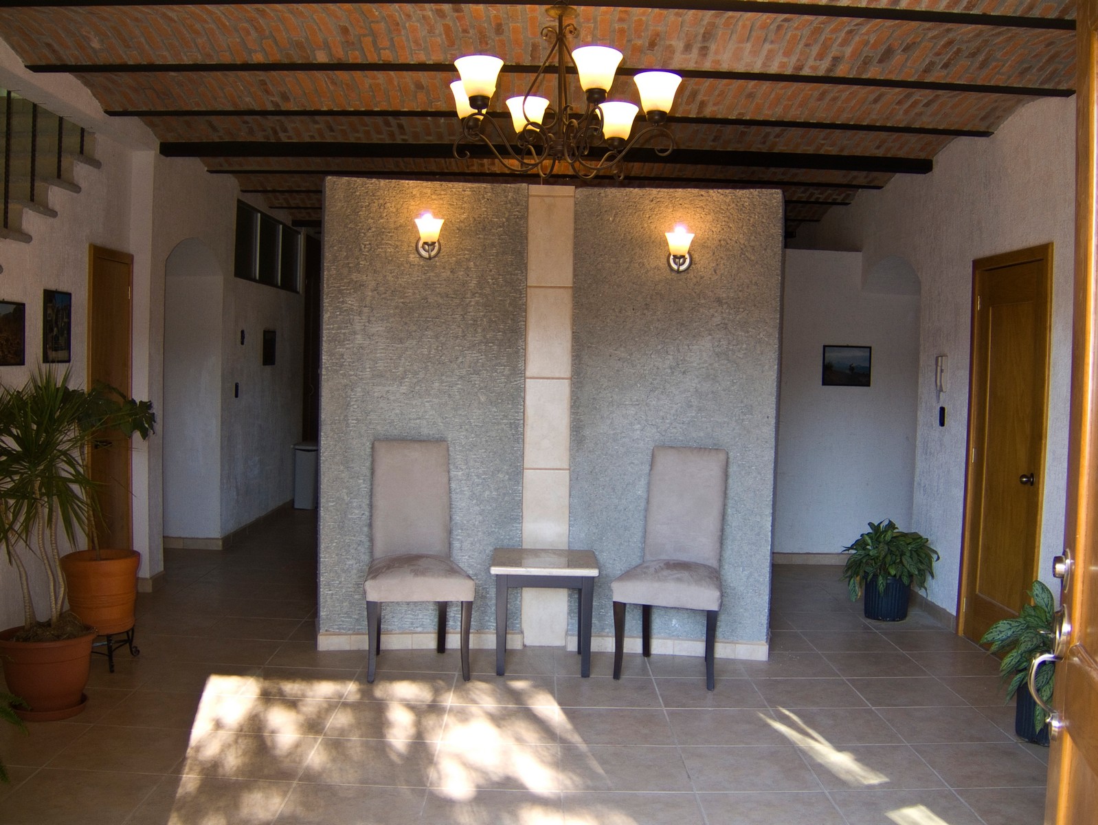 The entrance hall viewed from the front doorway. Behind the screen are the kitchen and dining area (for privacy, these are hidden from anyone near the entrance door). The arched doorways to the left and right lead to the family room and main living room, respectively.