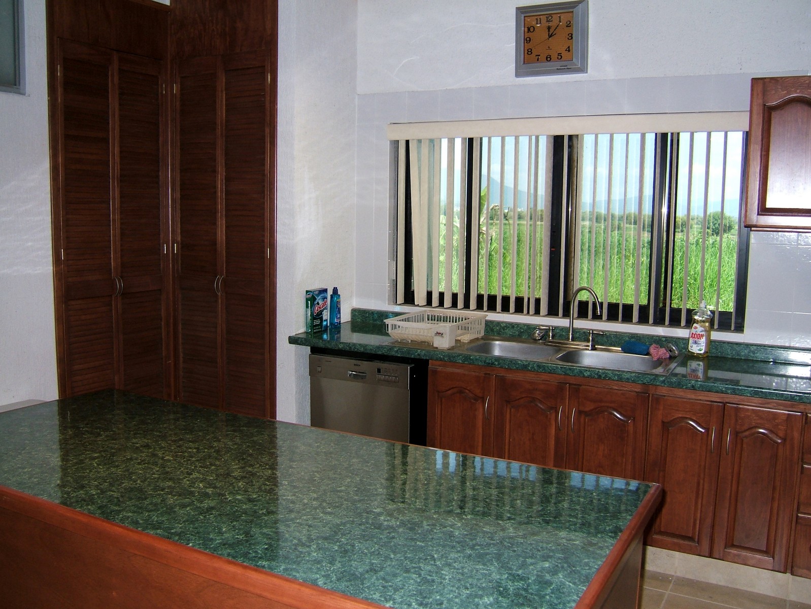 The kitchen features a large alcove with power point and water supply for the refrigerator, an extensive range of built-in units, and two built-in pantries. There are spaces for an oven/stove, microwave oven, and a dishwasher with plenty of power outlets. There is a large island unit with halogen lighting above, with a rectangular fluorescent light unit to the front. A large window with tinted mirror glass opens out onto the covered patio.