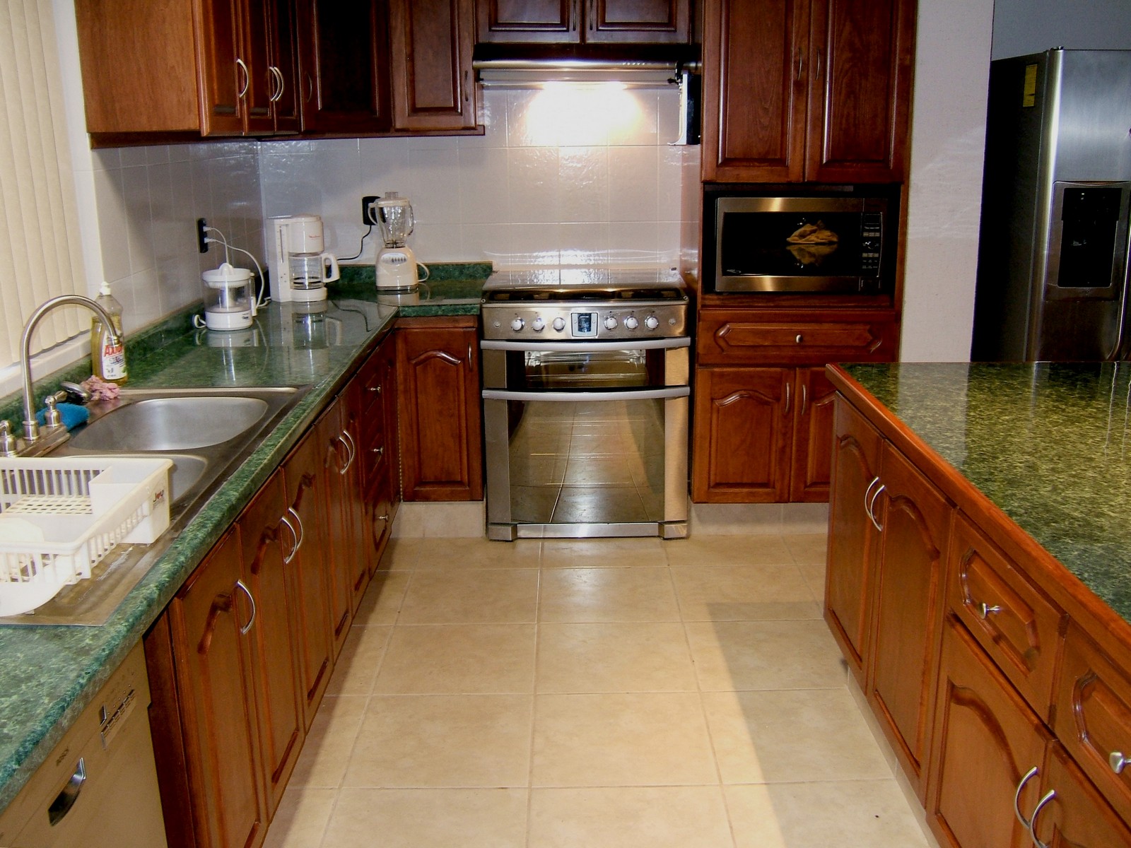 An overview of the kitchen units. The wide aisle provides plenty of room for opening dishwasher and floor unit doors.