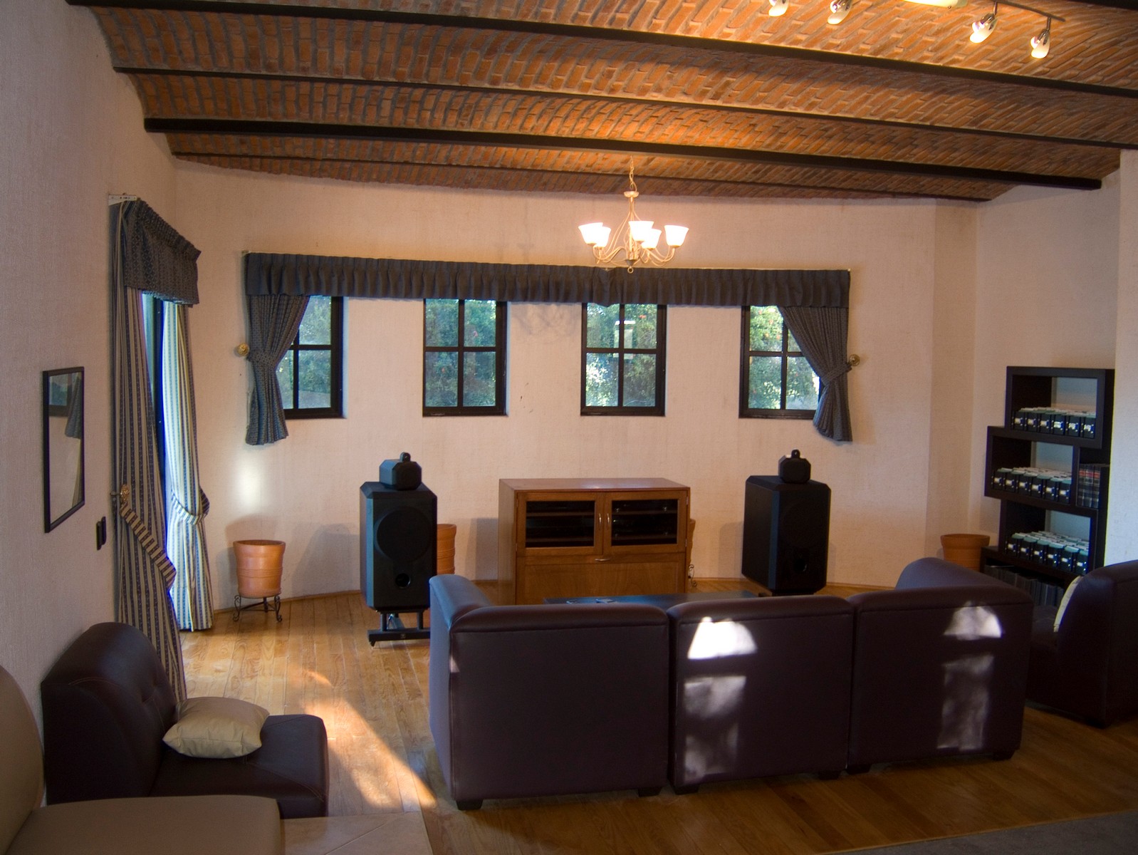 All lighting in this room operates via dimmer switches. Its shape and size give it excellent acoustic properties for a home entertainment system.