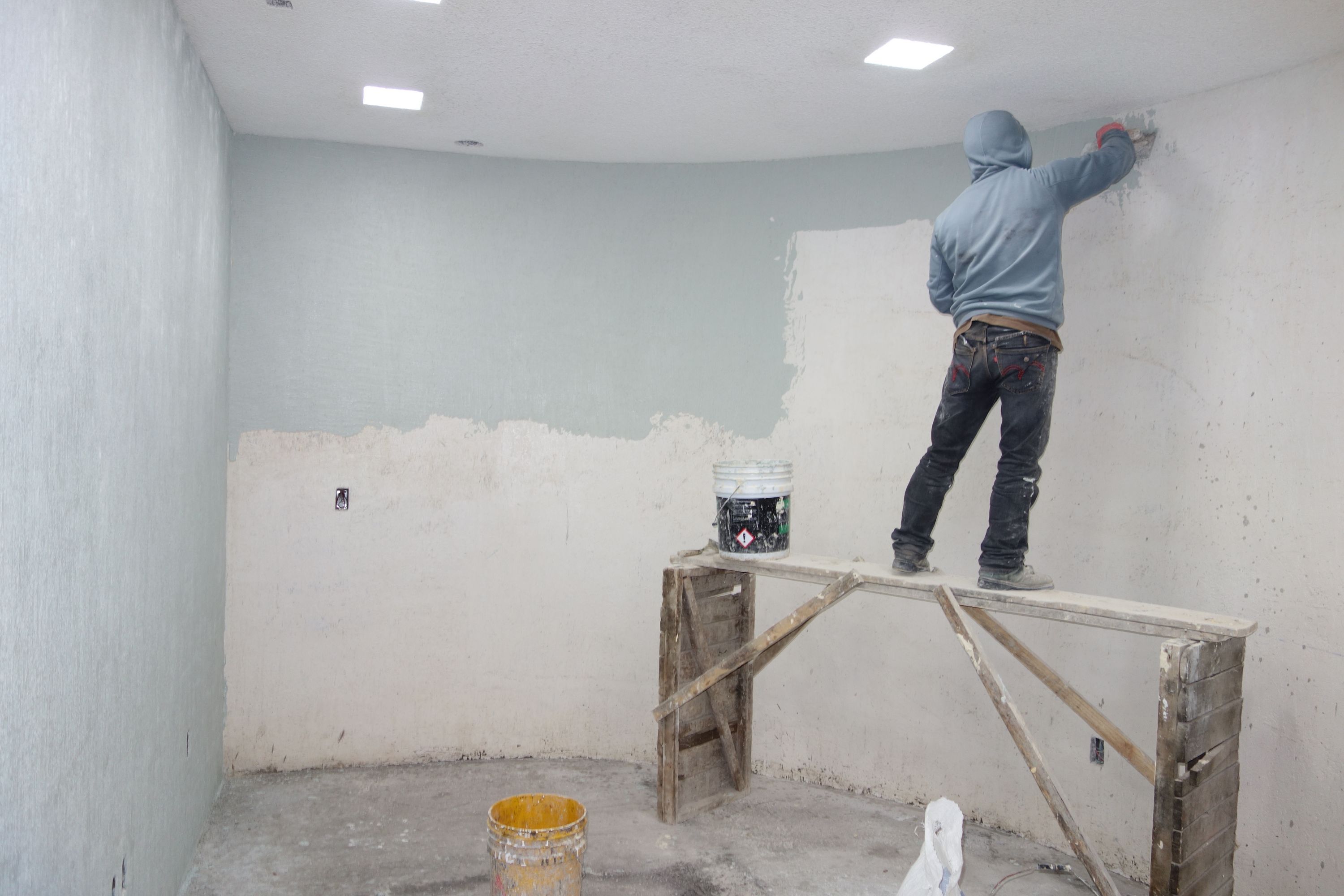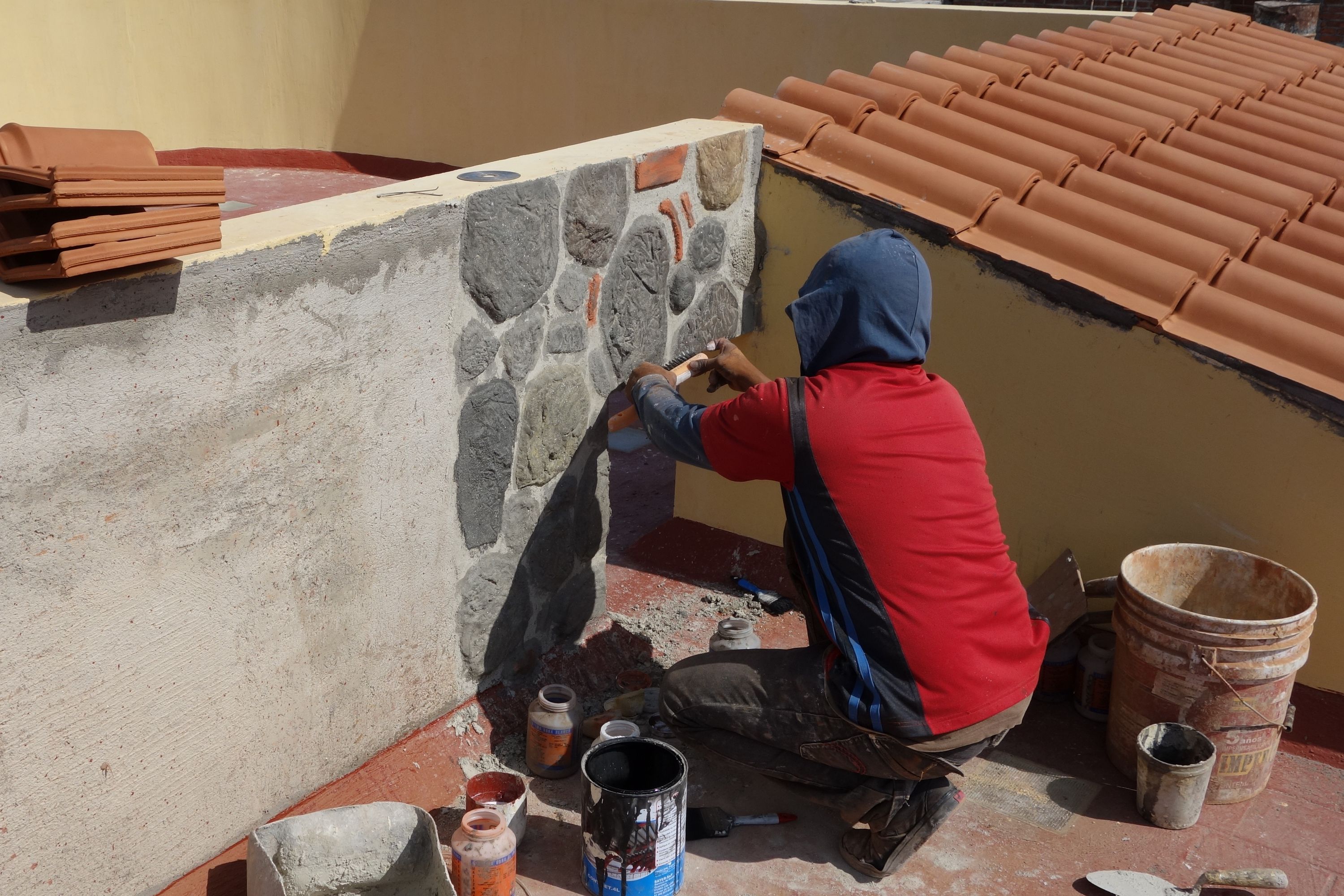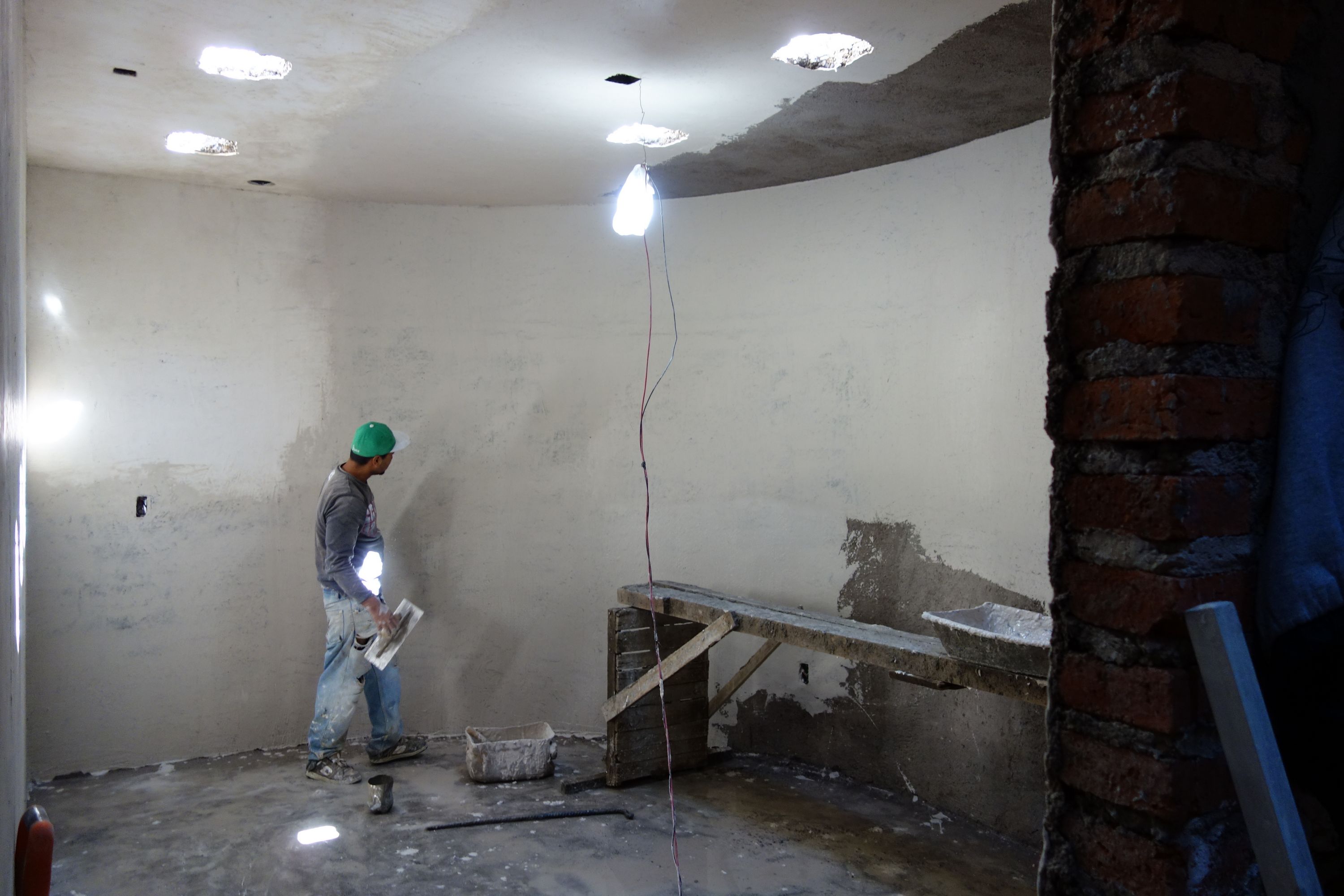 - Work continues on the aplanado, and also sealant on walls and ceilings prior to applying the texture. The structural work on the steps is complete, as are the dining and bar tables. Bases are being made for the kitchen units.