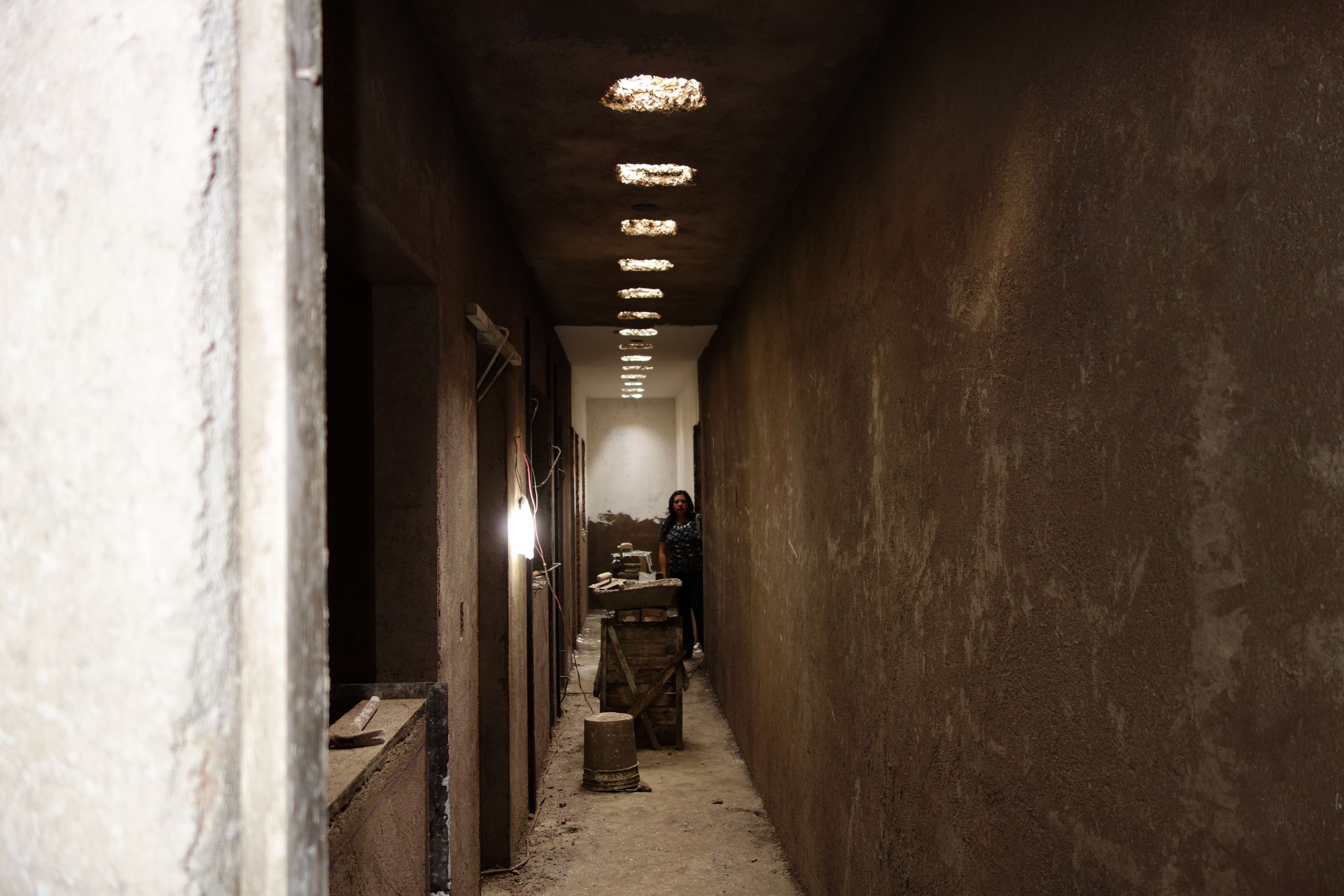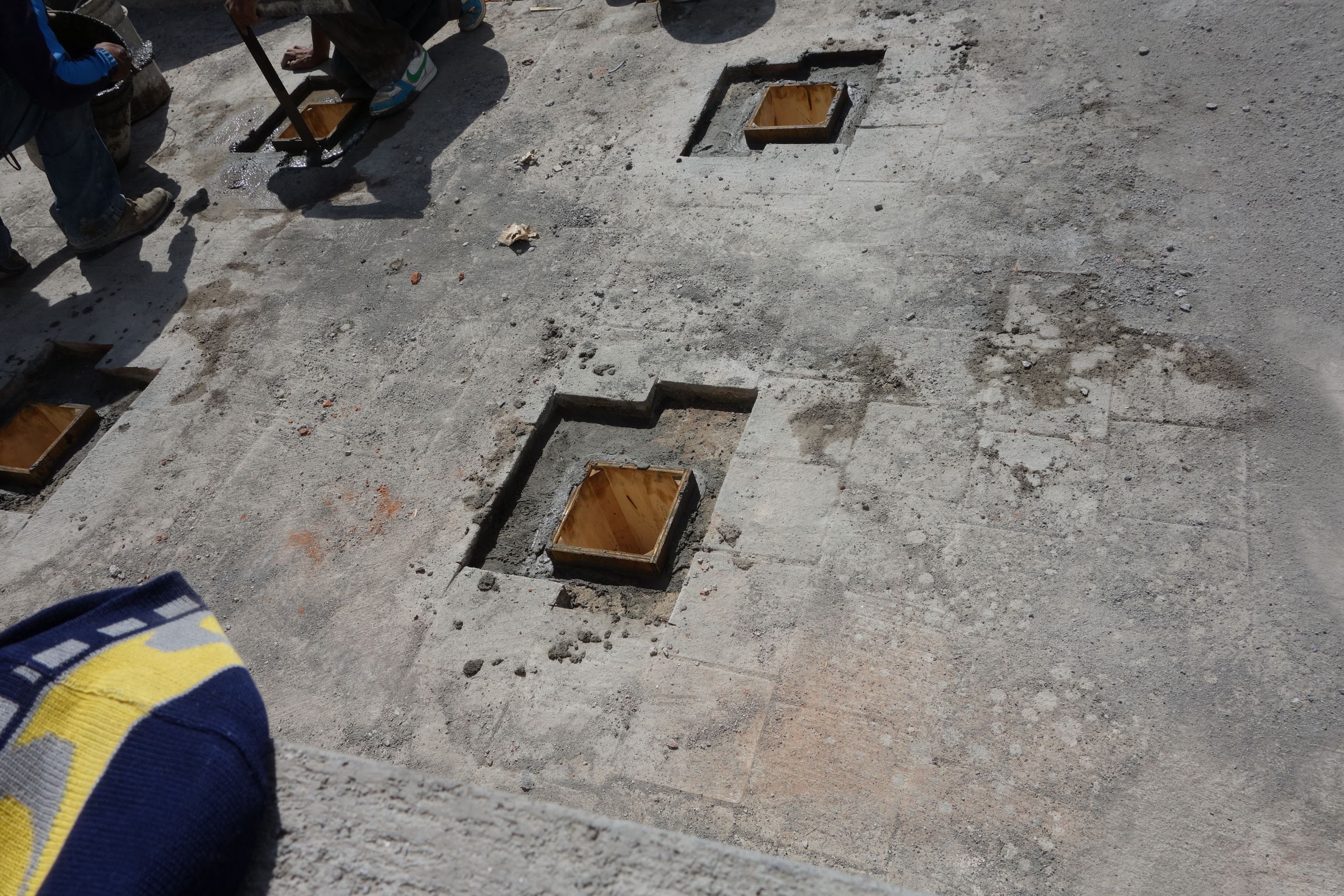 Inside too, aplanado has pretty much finished, and they are covering it with the primer. The holes for the skylights were roughly formed using polystryrene blocks before pouring the roof; they must be properly shaped before the glass blocks can be fitted. |