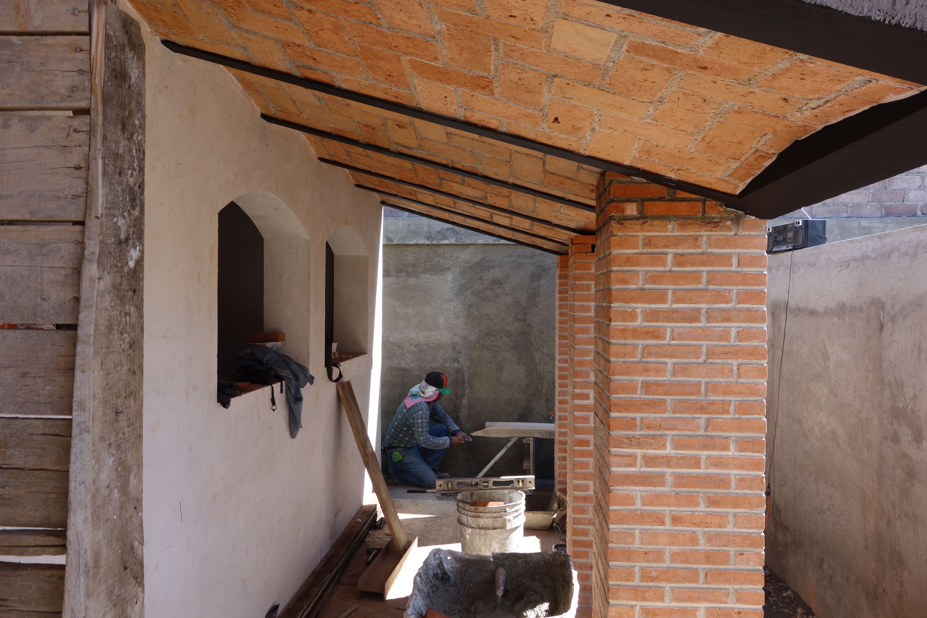 In the terrace, the tops of the brick columns are being filled in to avoid birds' nests and other issues. The bricks in both the columns and the bóveda have been cleaned, and the spaces between the arches and beams are being filled in and painted black. Warm colors will predominate in this area, as the floor tile will be a terracotta style, and the walls will be a warm yellow. |