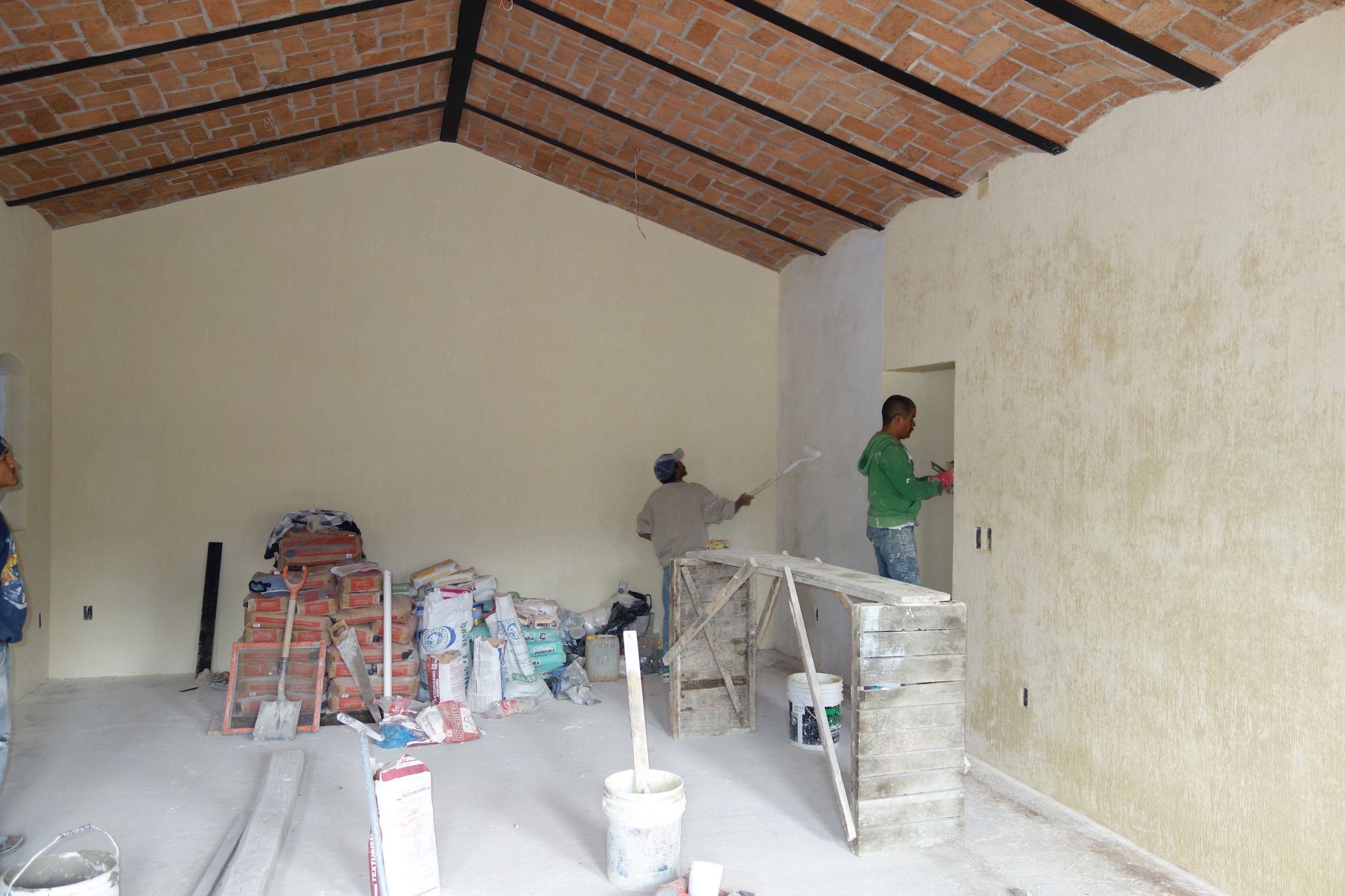 Inside the living room, they are painting the beams and cleaning the brickwork. The spaces between the beams and the bóveda arches have been filled in with white cement; two here await painting. |