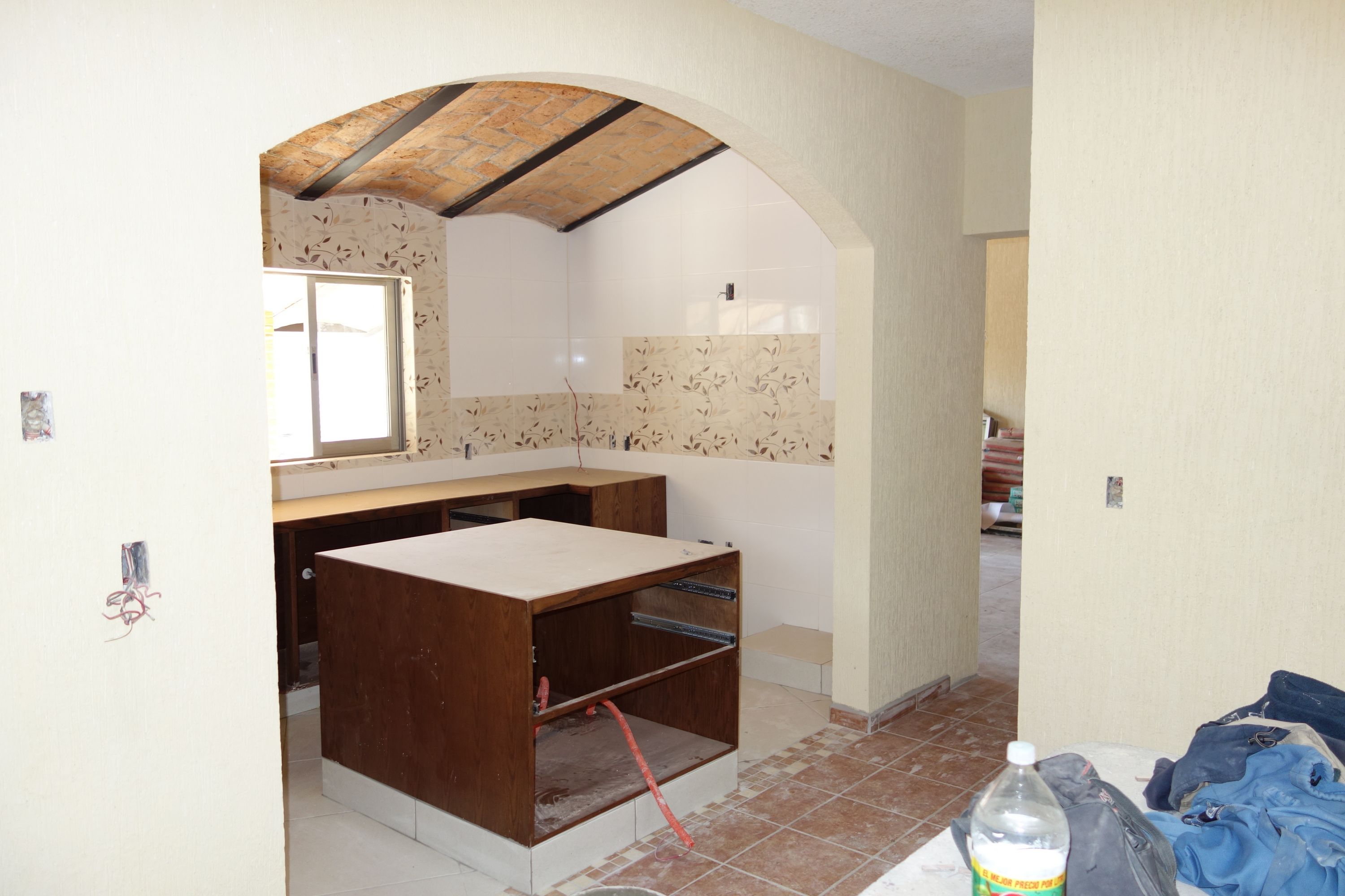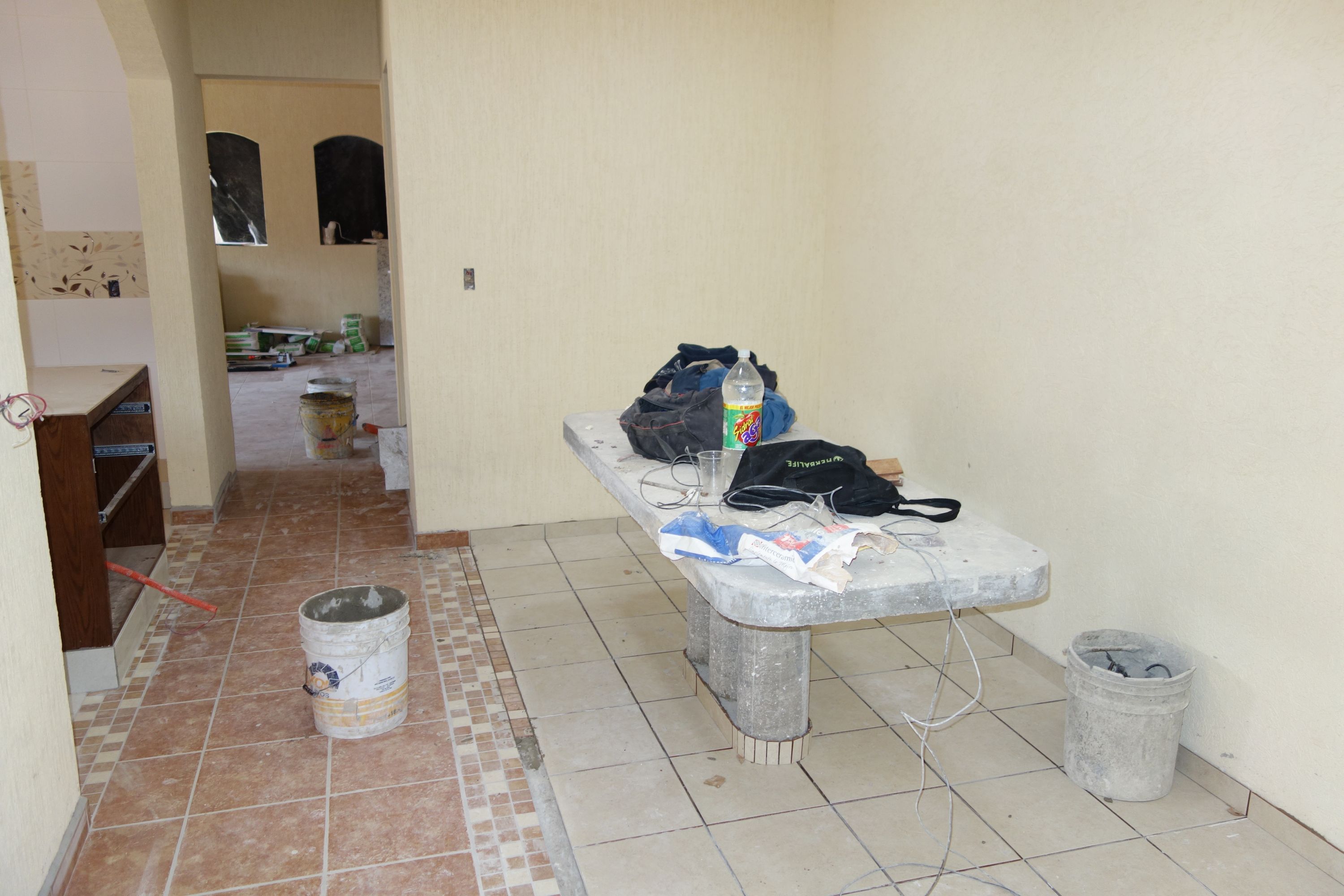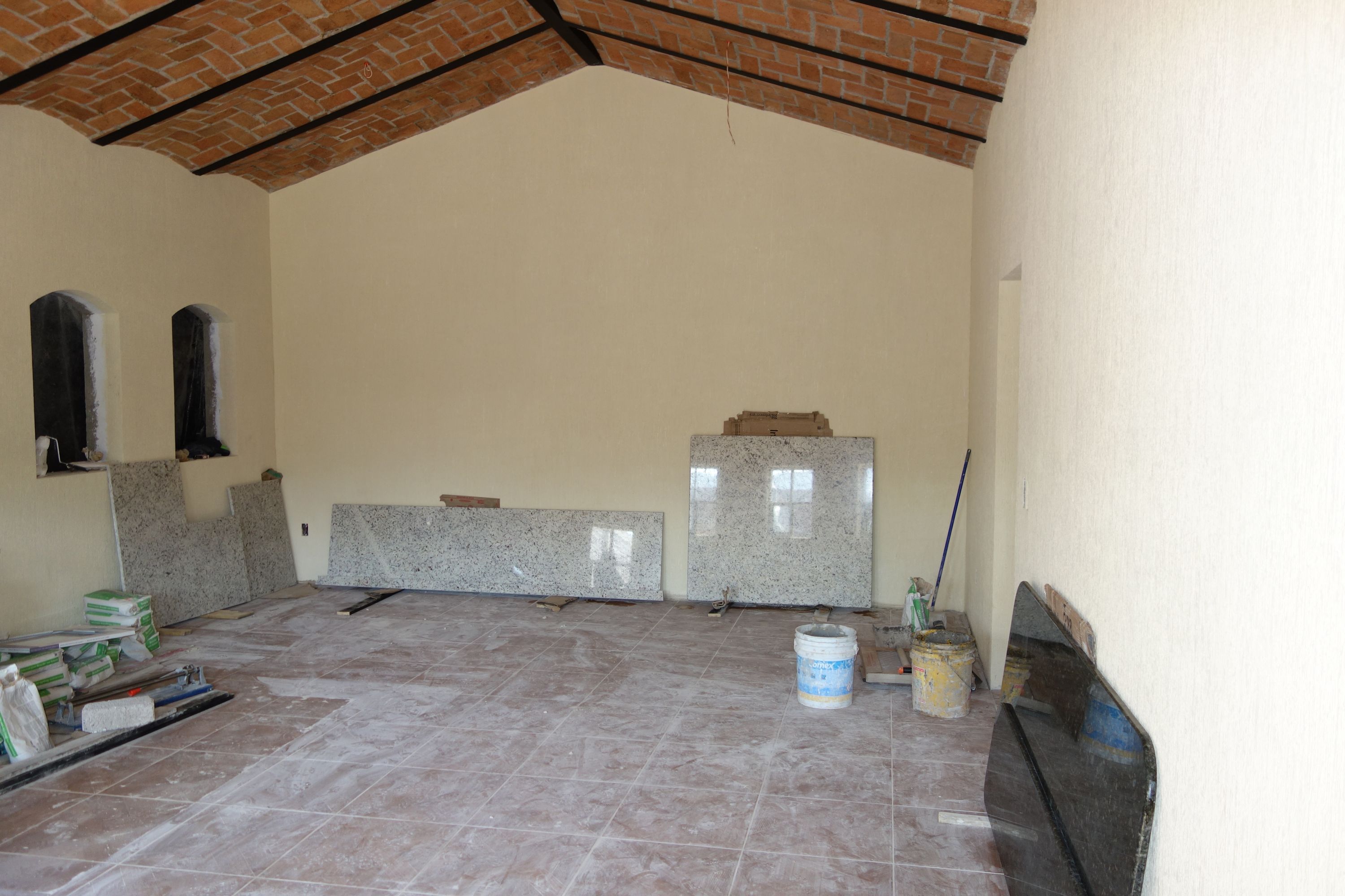 Aplanado has been completed in the kitchen and here in the dining area/bar; they are now working on the built-in dining and bar tables. These will be finished in the "Green Butterfly" granite. |