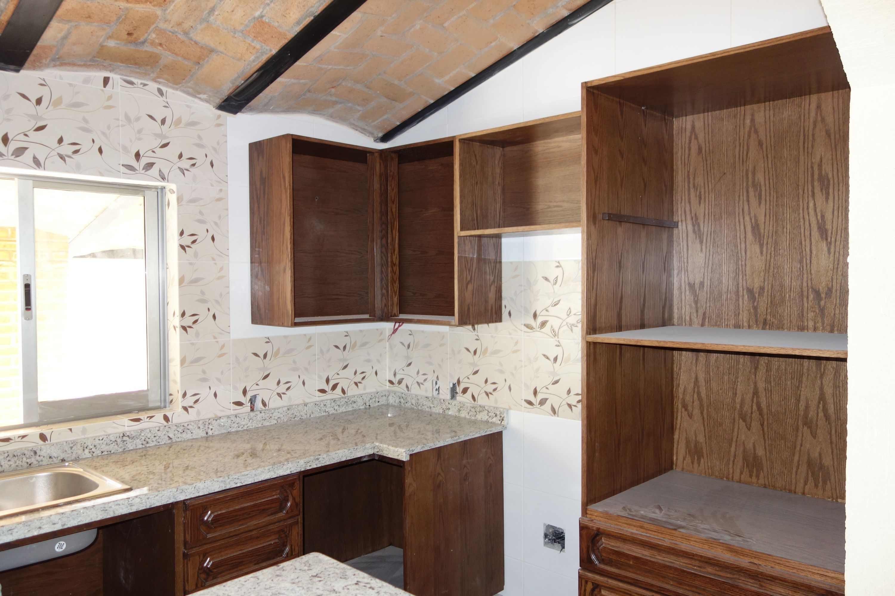 Work is now in progress on the storage room, with aplanado and a wall being built to house the gas tank. Provision is also being made for proper drainage of this roof. As can be seen, the shoddy brickwork of "maestro" X has been covered over; but we are thinking of leaving uncovered Rubén's brickwork above. On arriving here today, we were relieved to find that the windows and side door had been refitted correctly. The small door for the bathtub motor was in place, and they were working on fitting the shower cubicles. Said clinically-certifiable idiot had made his version of one of the medicine chests; it was merely a face plate with two doors featuring ridiculous-looking external hinges. This will go in the bin, and the manager will hopefully ensure we get what we want. The carpenters were also here today, and were fitting handles on the kitchen units and bathroom sink units, and finalizing work on the closets. |