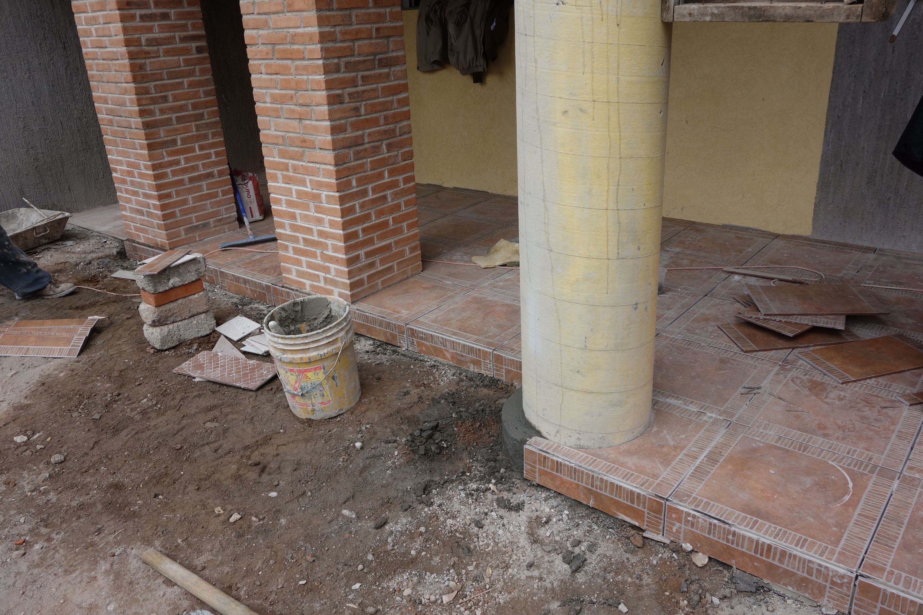 The terrace is being tiled, including the zoclo here at the edges. There will be a path from here across the garden to the parking area. They are making round edges for the columns, and they will be fluted with ornamental bases and capitals; I am still not quite sure about the design of this, and to some degree am leaving it in Rubén's hands. |