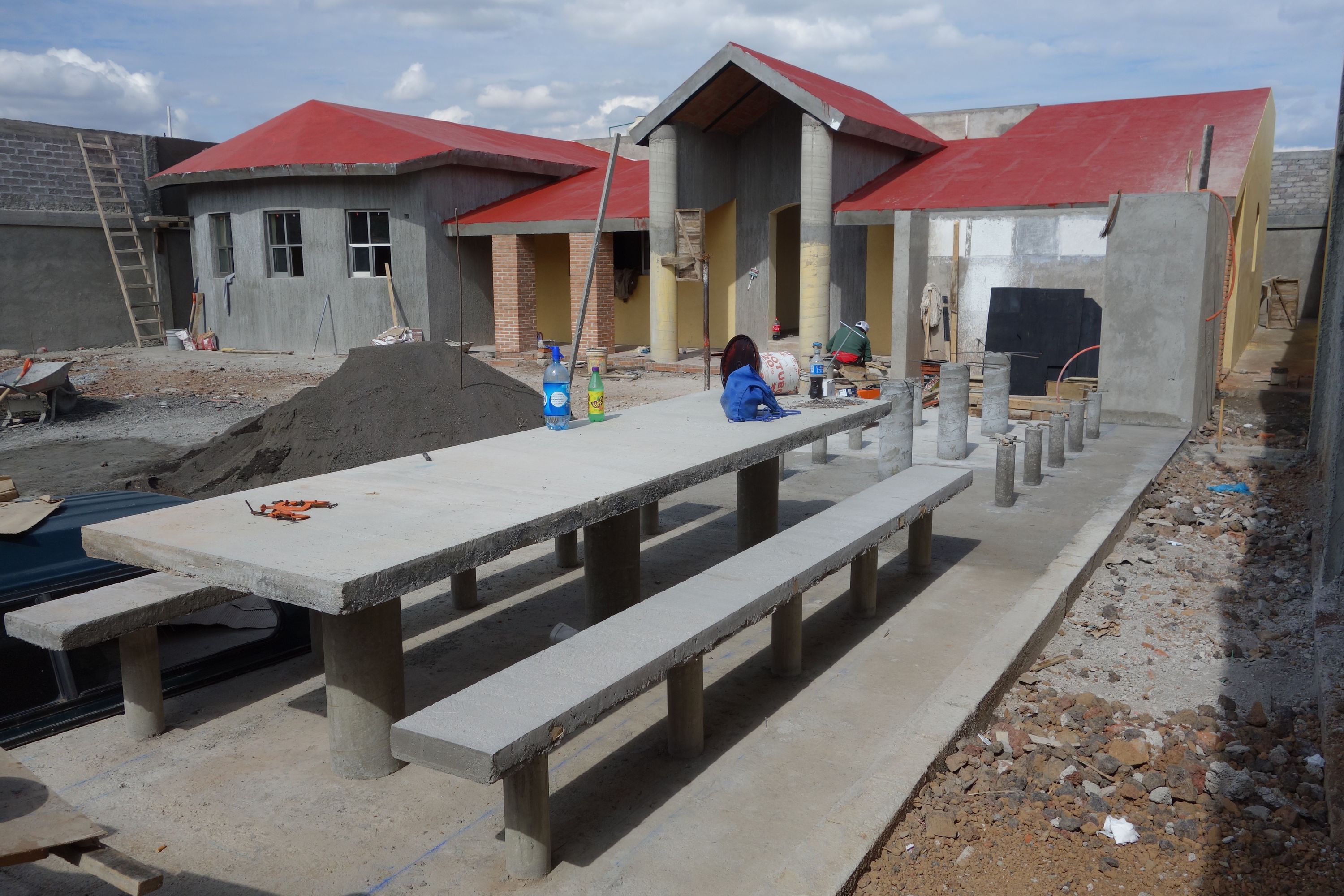 A view from by the entertainment area, showing one of the two sets of tables and benches completed in obra negra, and the other under construction. I have taken some care to make sure the benches are at a proper height and distance from the tables - this is especially important since they are not user-adjustable. Naturally, both columns and slabs are reinforced, and the two tied together. |