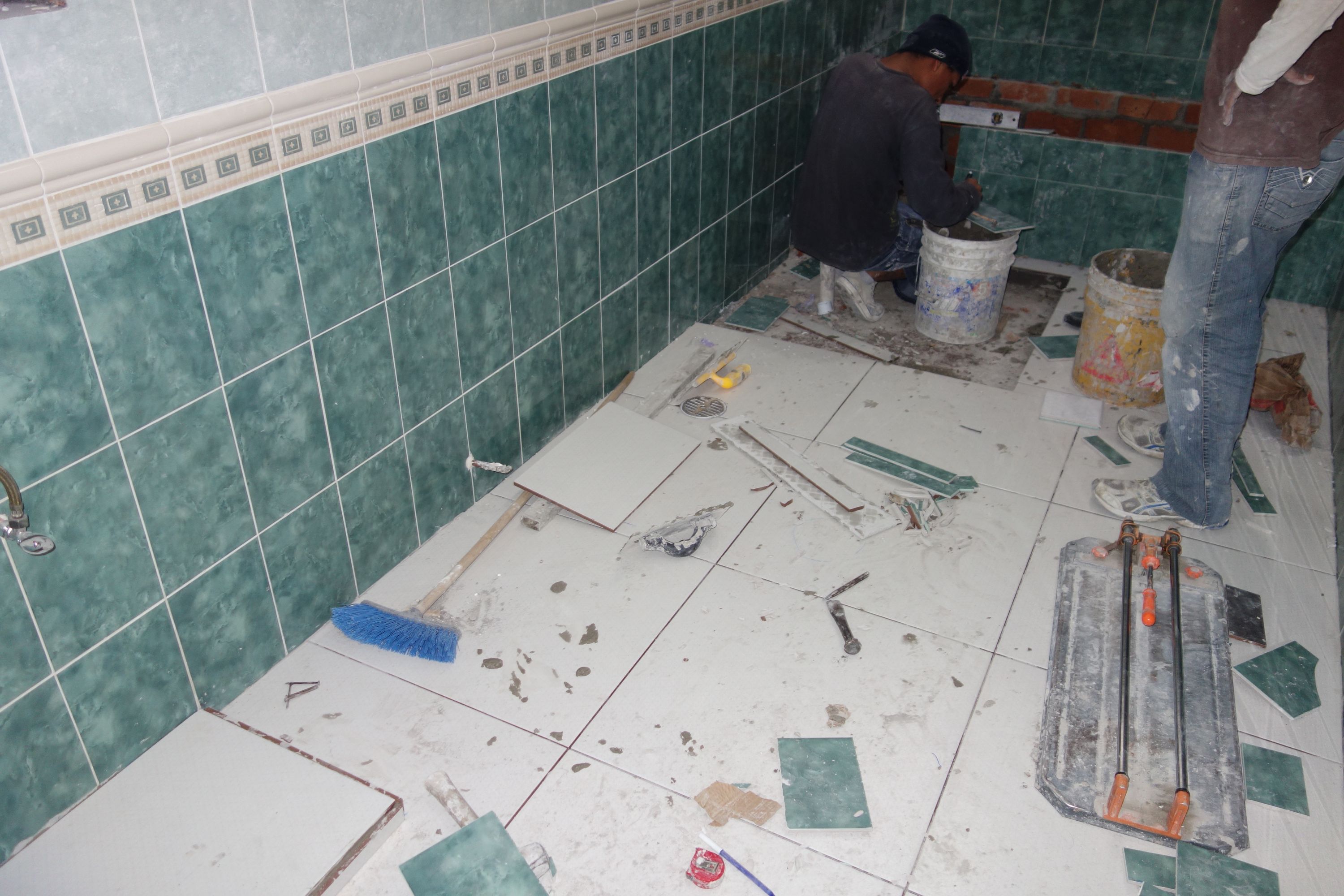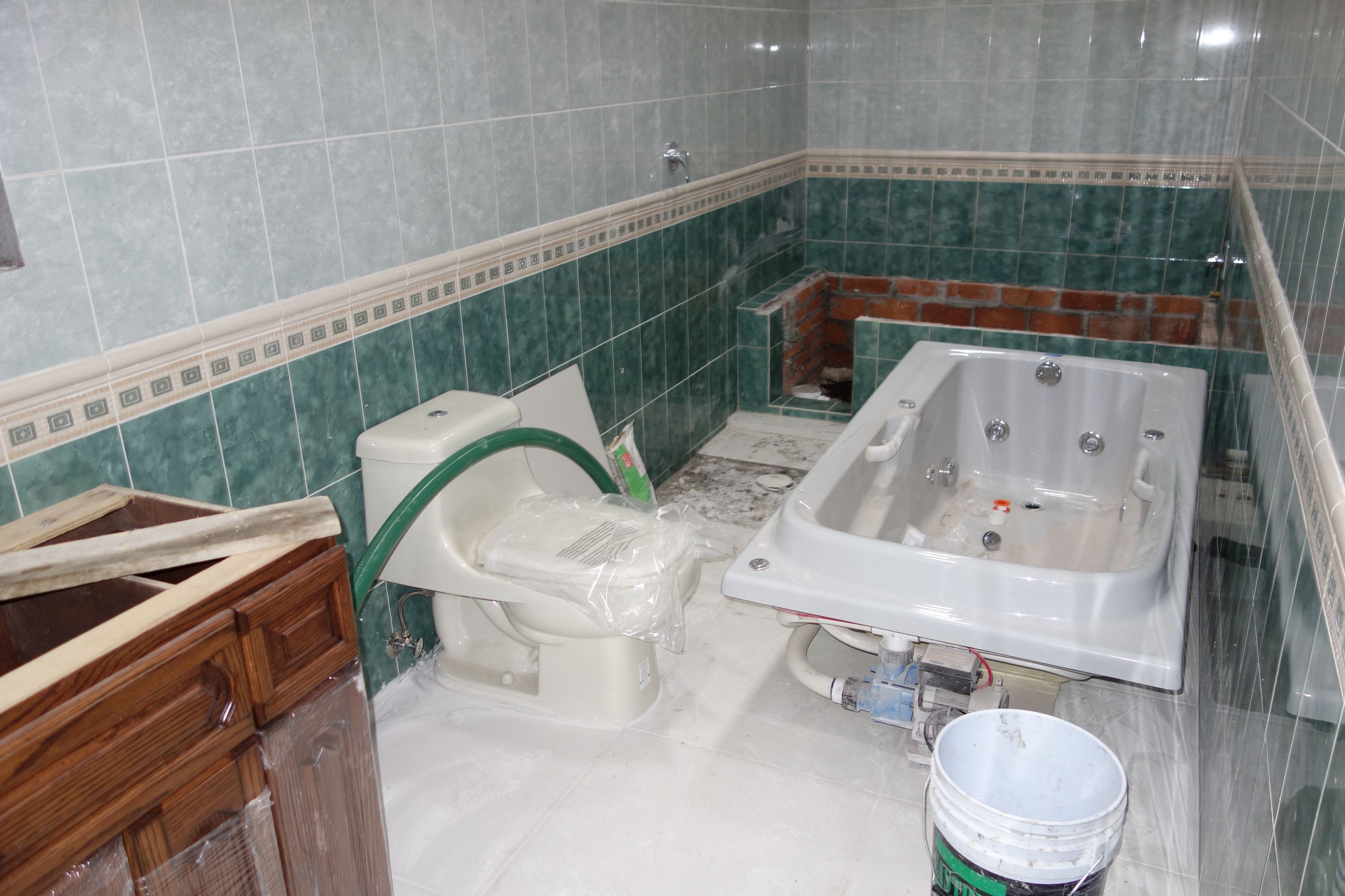 - The remaining tiling inside the house (in the main bathrooms) is done, and the bathtub fitted on a bed of sand. The carpenters have fitted the kitchen and bathroom units. Work is continuing reinforcing the boundary wall.