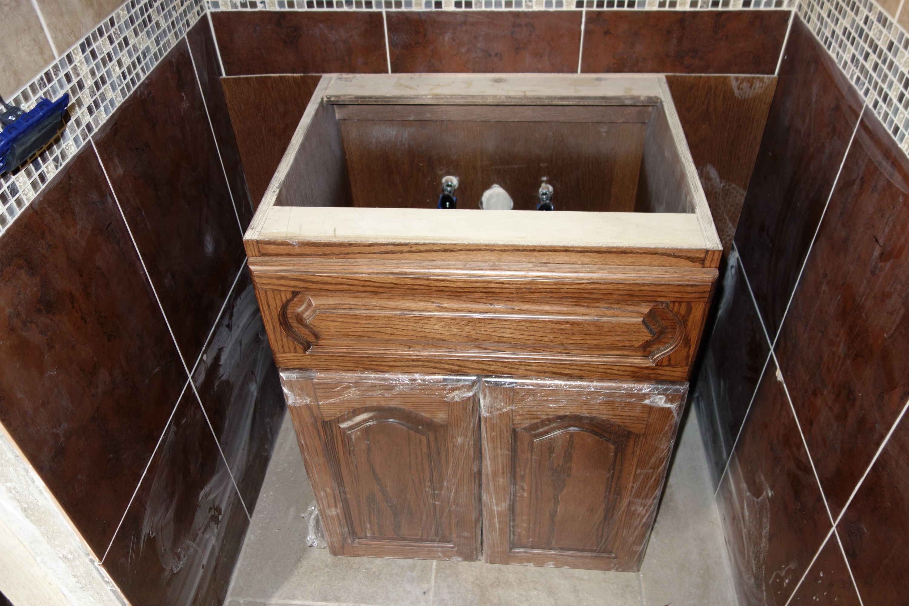 Tiling in the en-suite bathroom, looking towards where the shower cubicle will be fitted; the recess for the built-in wall cabinet is to the right. The curved wall gives an irregular (but I hope comfortable) area for showering. The three bathroom sink units are now nearly complete. |