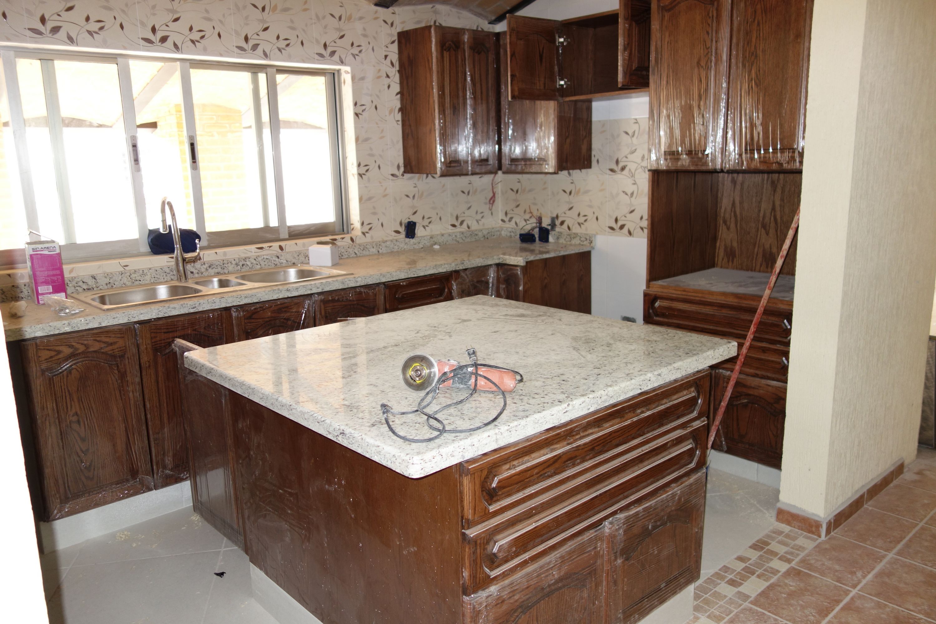 In the dining area, bar, and here in the kitchen, granite fitting is underway. The base units have now been raised and the zoclo fitted, but unfortunately there is white tile exposed by the edges of the wall-mounted units. In fact, both this problem and that of lack of space for the dishwasher are due to inaccurately-made carpentry; the base unit being too long, and the wall-mounted units being too short. The carpenters agreed to dismount the latter so that the wall tile at the edge can be replaced by what is left of the decorative style. The lack of availability of this has made a difficult task still more difficult. Another worry is that the granite at the end of the unit overhangs, reducing the 80cm width I allowed for the stove to 77cm. We hope that it will fit anyway. I am also concerned that the granite has been cut such that two large joins to the sides will be required, rather than one small join under the sink unit - this despite making a drawing and his agreeing that this would be done. It seems that only Rubén and Jaime are capable of following plans and making accurate measurements. |