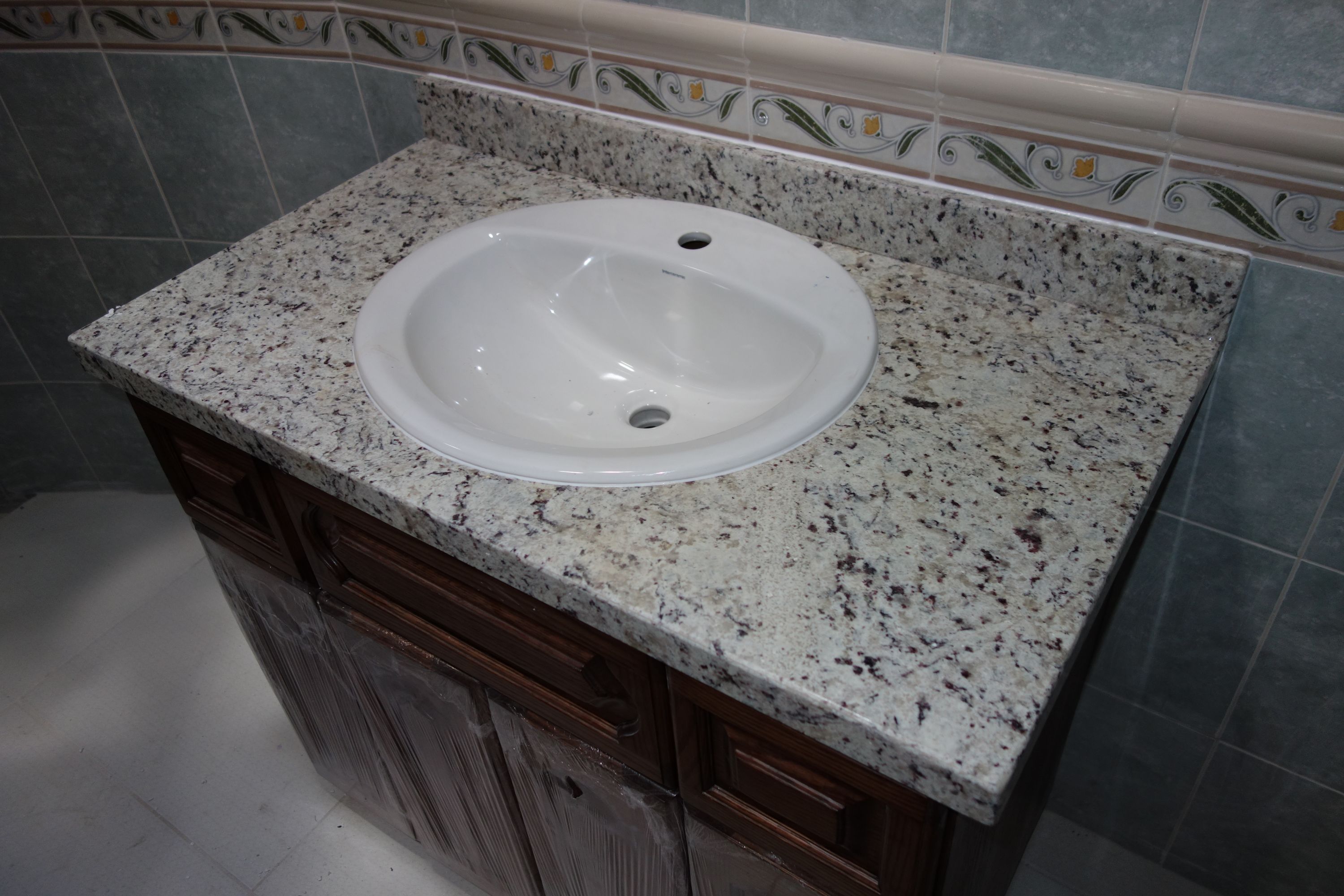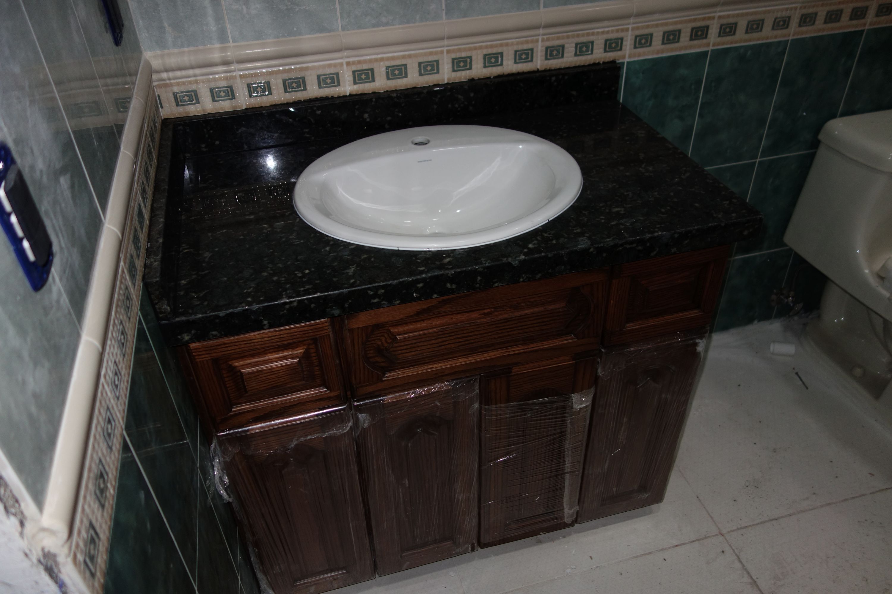 In the en-suite bathroom, we have the "White Dallas" granite, as we didn't have enough of the dark granite for all three bathrooms. But I think the lighter-colored granite actually works better in this bathroom with the lighter-colored wall tile. There is still a significant amount of this granite left; we plan to use this to make a coffee table for the sitting room to replace the cracked marble one we have in "El Refugio". |