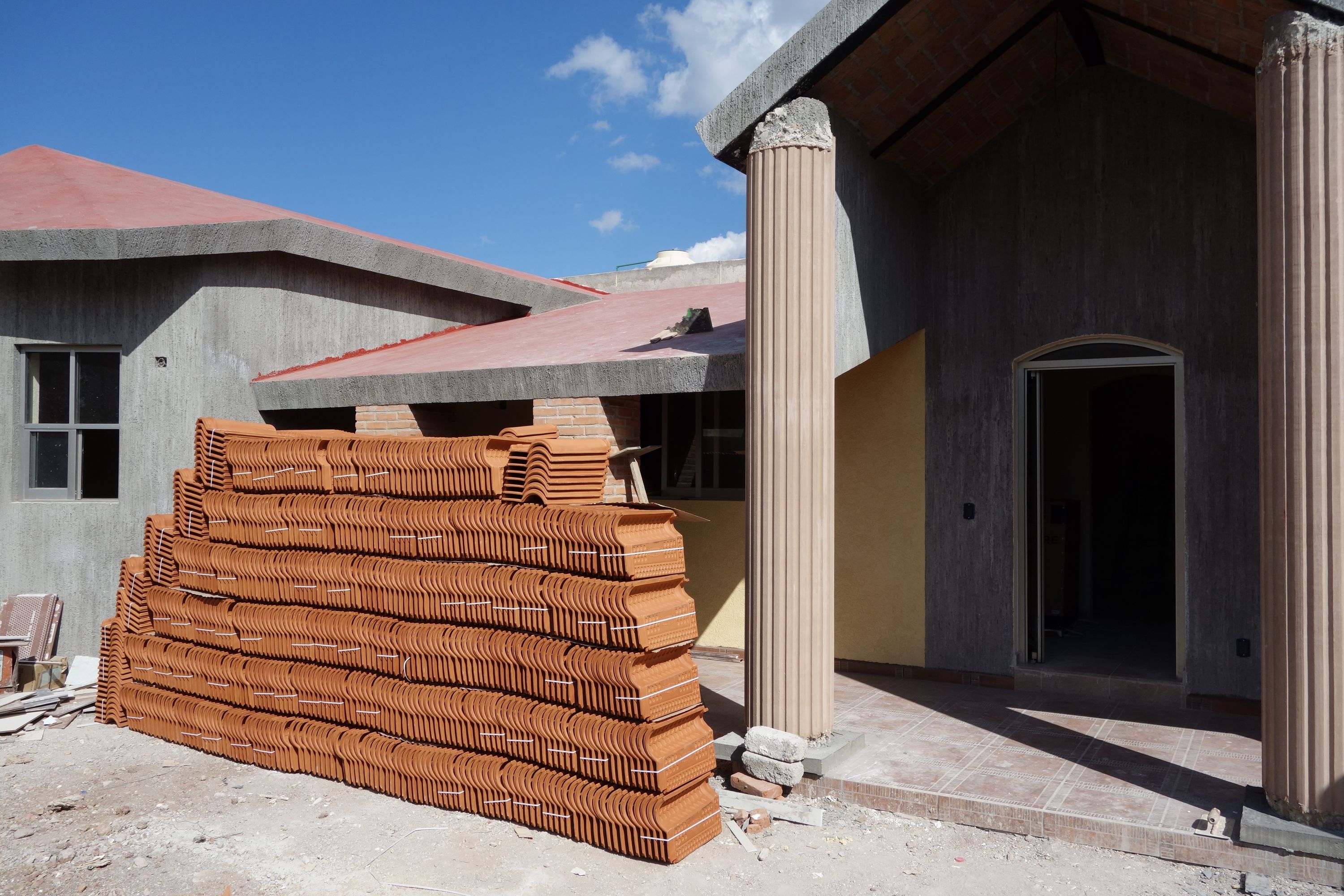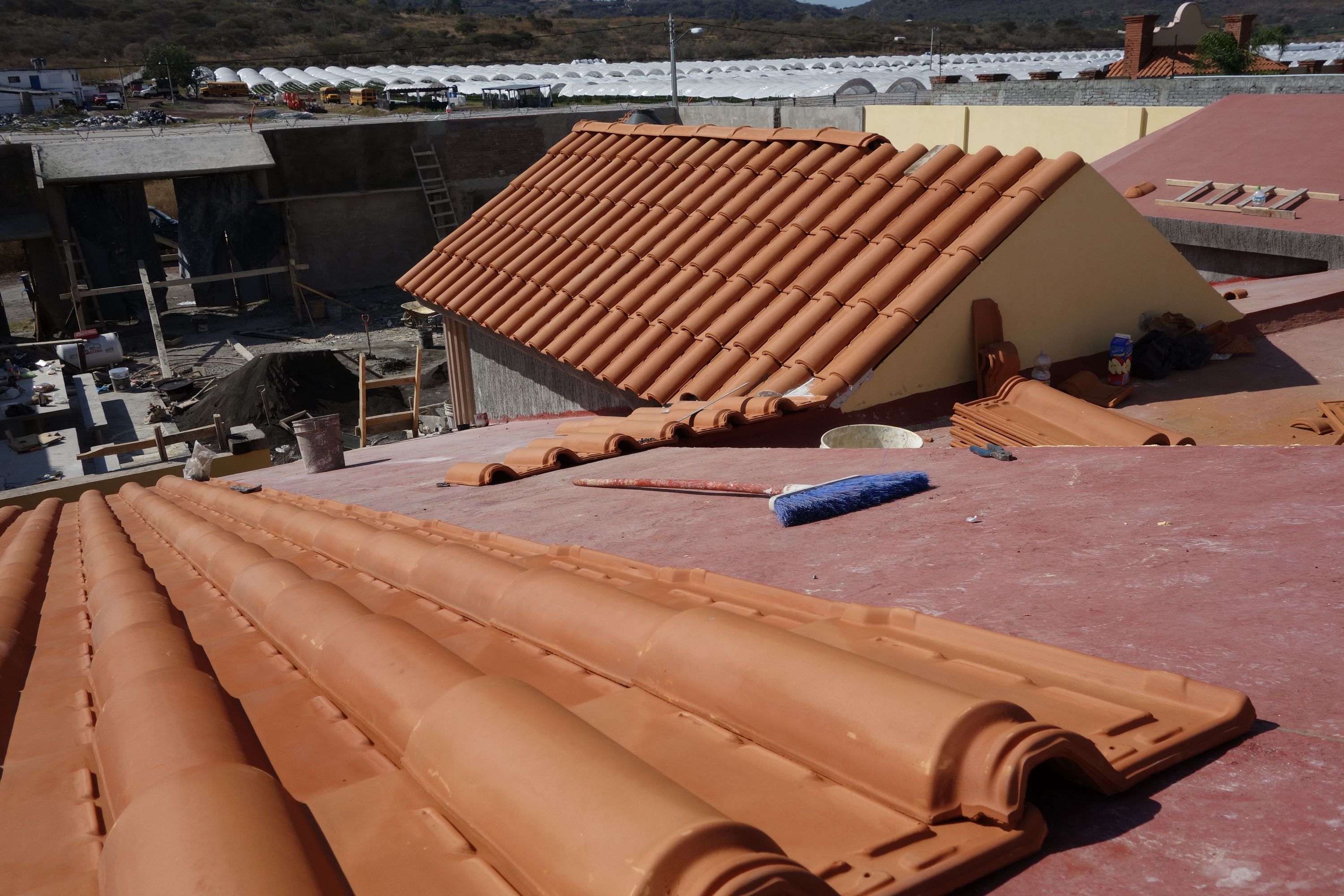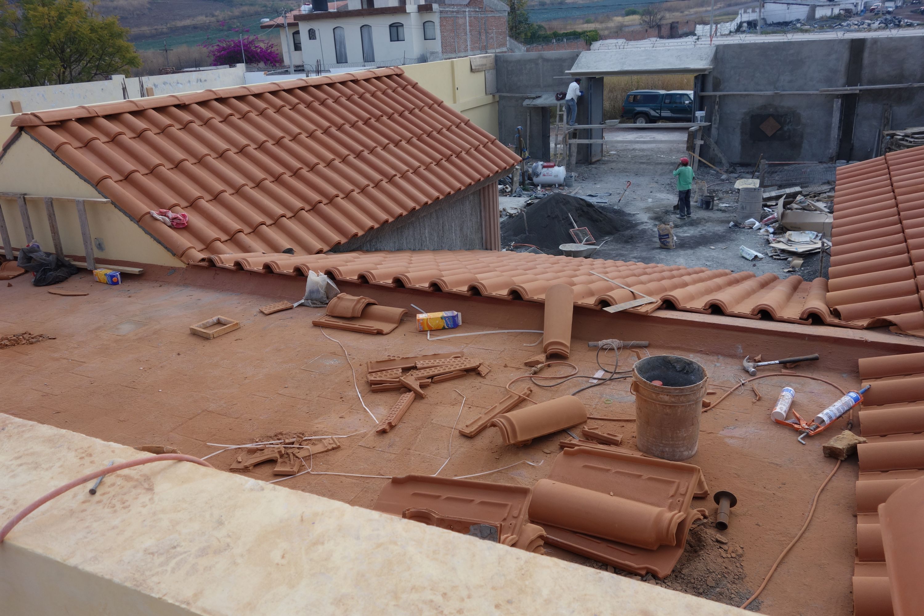 The columns are now done, and roof tiling is complete, except for the challenging area over the front of the living room. I had expected the edges of the roof underneath the tile to be white, but they seem to be grey; Verónica thinks this is OK, and I'll see whether I can live with it... |
