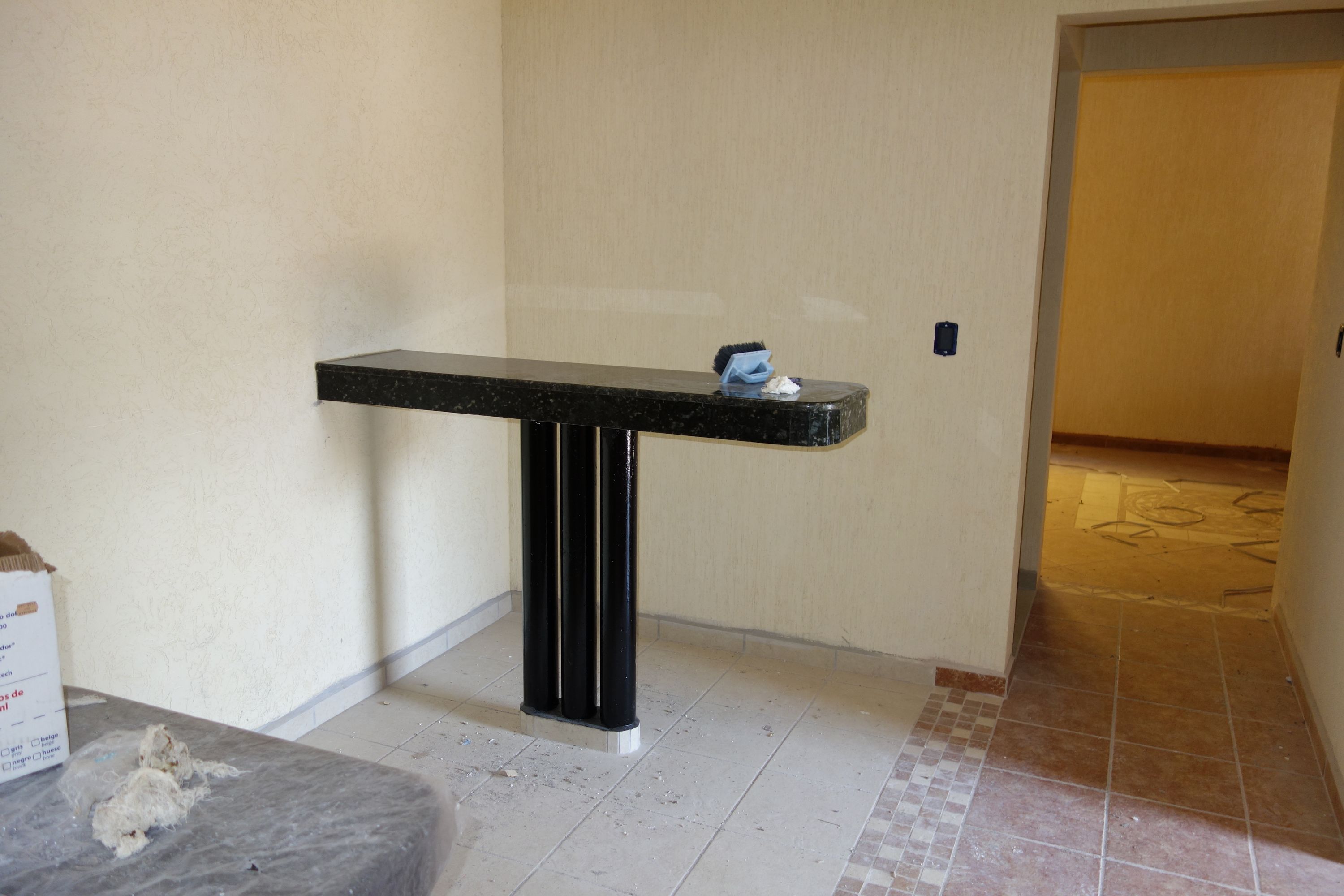 Fitting of granite here in the dining area and bar is almost complete; all that remains is some of the faldón. The dark green color is intended to complement the light-colored granite used in the kitchen. We will finish the columns in a black epoxy-resin paint. |