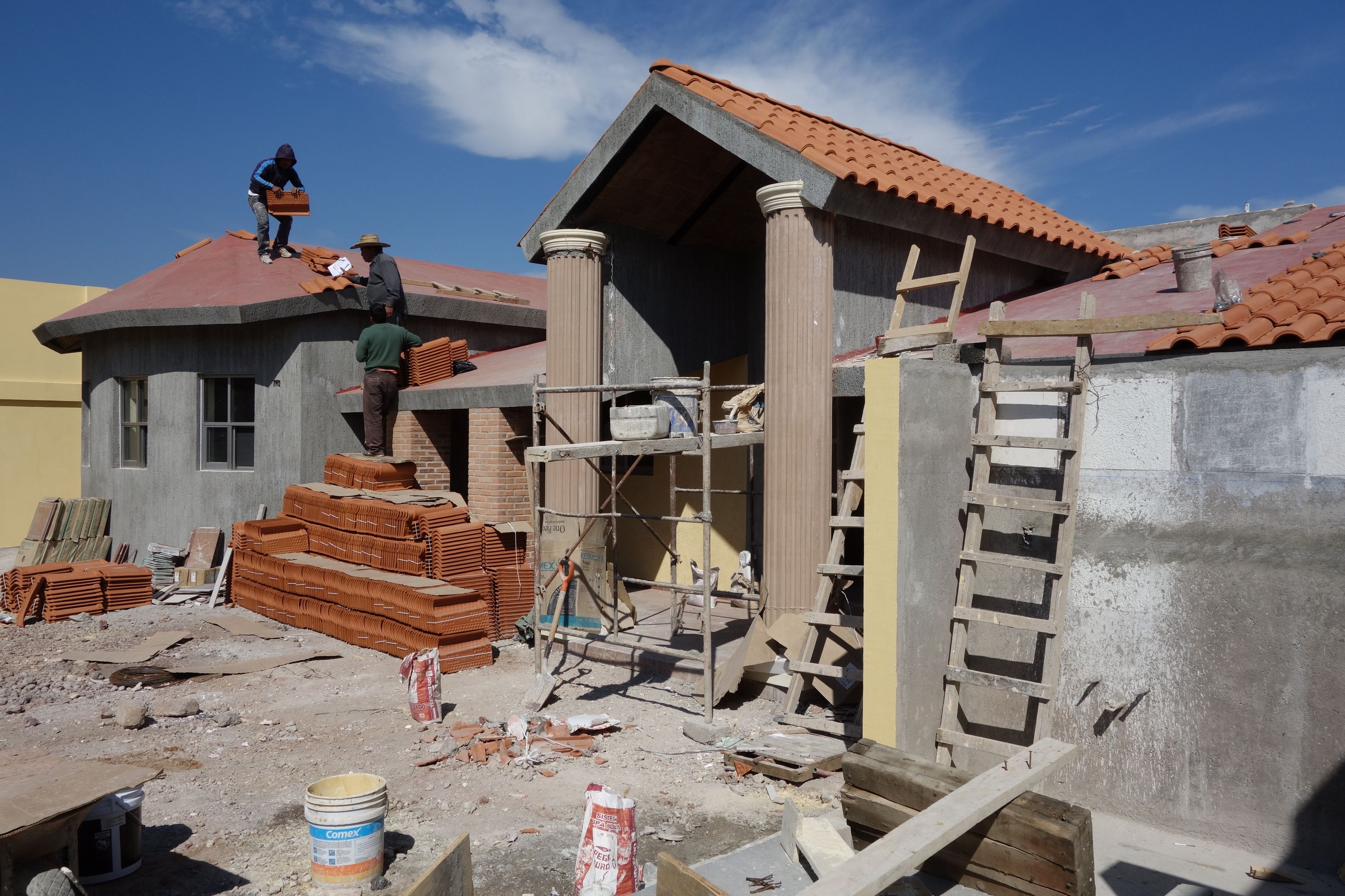 - More texture, start of tiling, and finishing the columns in the front terrace. The complex roof intersections have been finished off nicely. Also work has started reinforcing the boundary wall, impermeabilizante has been applied to the flat roofs, and the tables and seats in the entertainment area have been started.