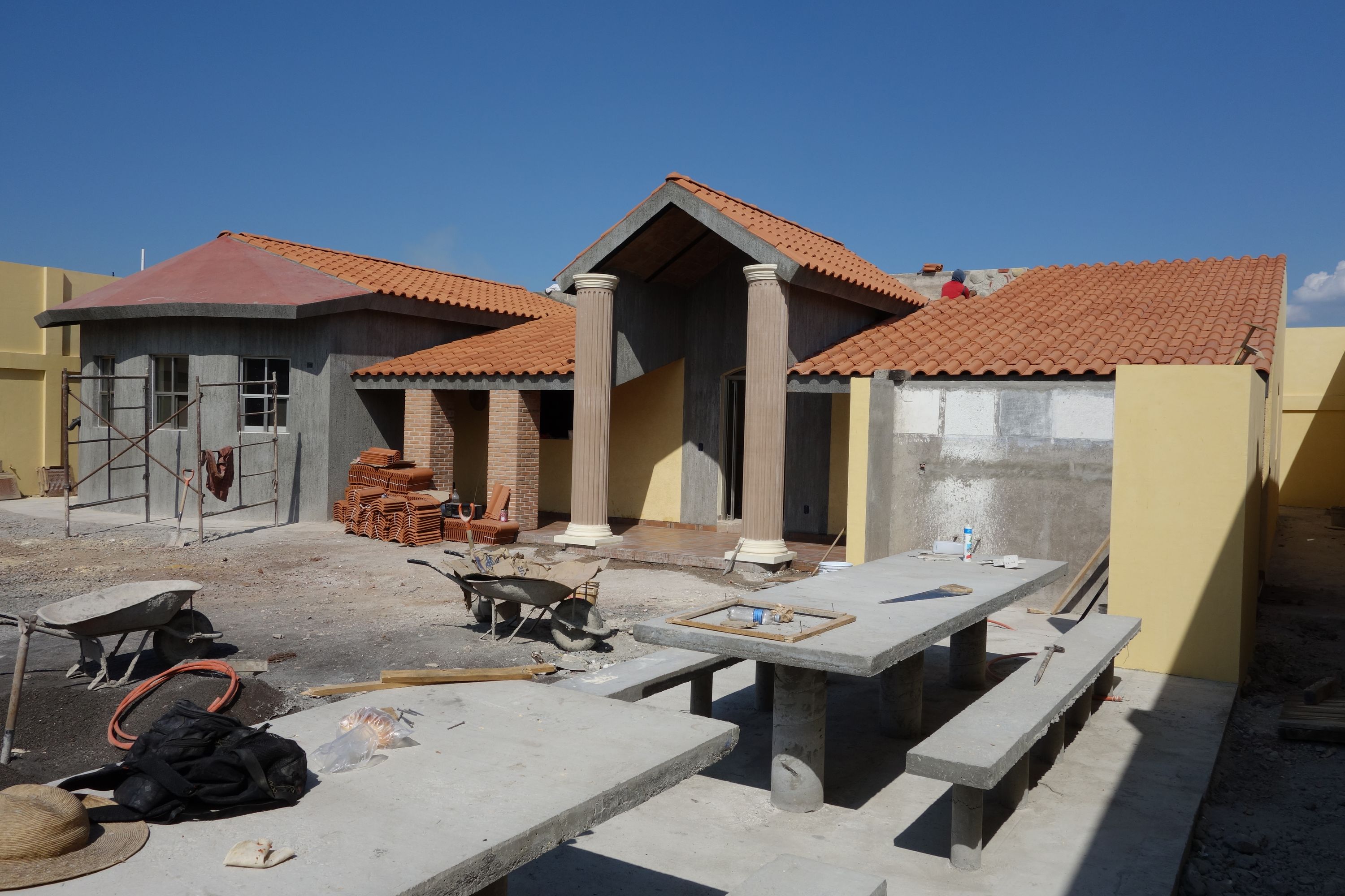 Work is continuing on the two marquesinas and the storage room. The boundary wall at the other side is being opened up so that an additional castillo can be inserted to remedy one of "maestro" X's numerous structural defects (one can just see the hole in the wall through the storage room window). |