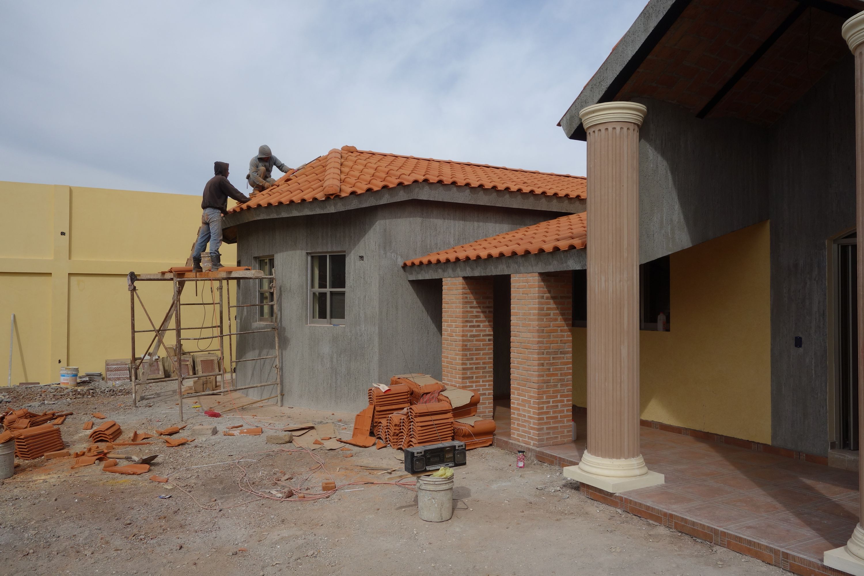 - Roof tiling is nearly complete on the house, and the marquesinas are being prepared for tiling. The carpenters have delivered some of the bedroom closets, but not much. We are very concerned about problems and lack of progress with the aluminum work. We have an artist doing some very impressive aparente work on the front roof walls.