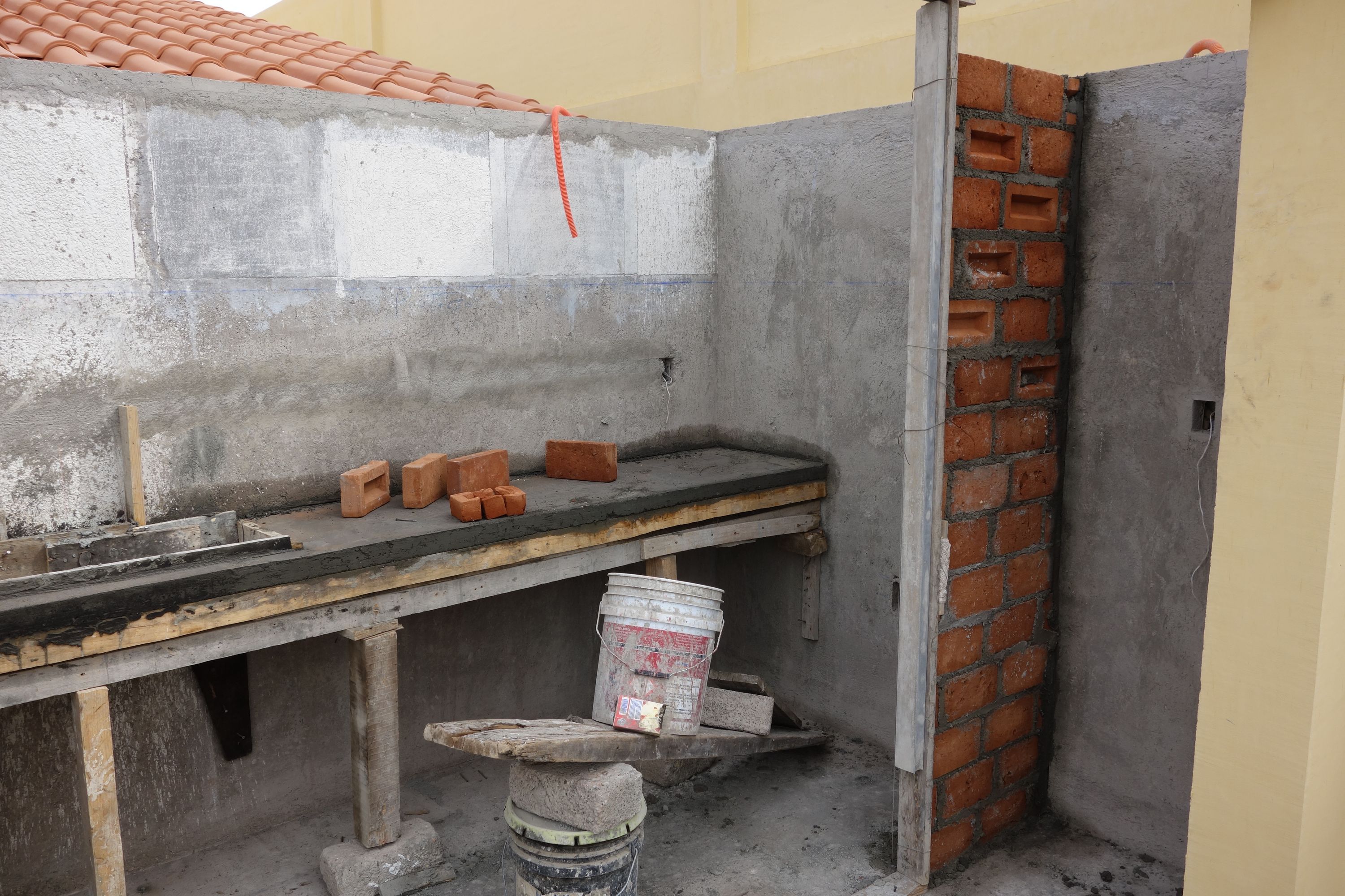 Construction of the kitchenette in the entertainment area has now started. To the right is an alcove for the refrigerator (only 65cm wide, but there are various tall and thin models that will fit). At the other side of the wall is an 80cm wide space for the cooker (we decided to have an oven as well as a stove). There is a counter with space at the left for a double sink unit (which we have already purchased). All this will be tiled (Verónica wants another granite surface, but we don't have enough left). |