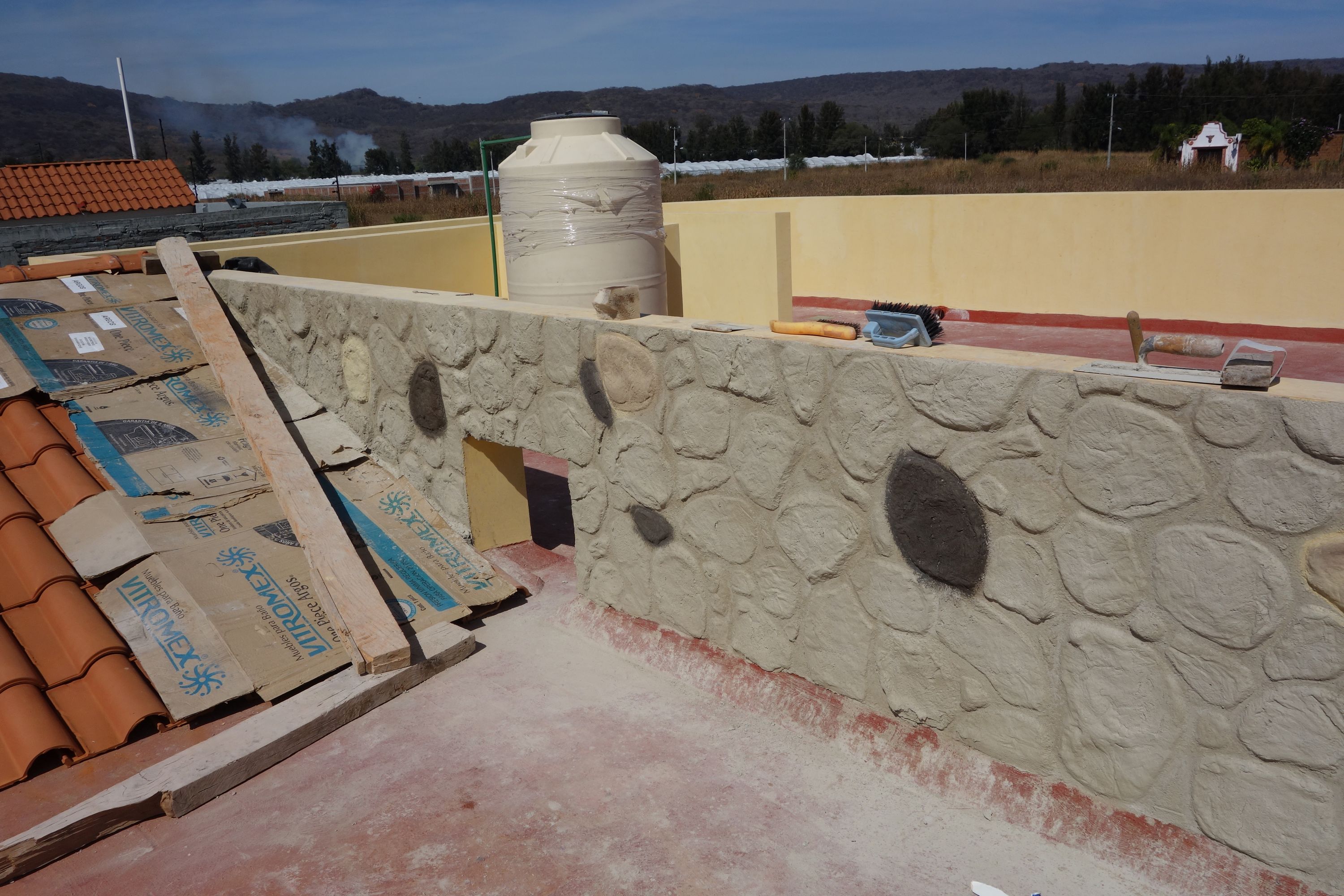 Outside, the terrace walls have been textured, and they are dealing with the boundary wall. The sloping roofs have received a second coat of impermeabilizante (this time red, but the color doesn't matter as it will be hidden by the tiles). |