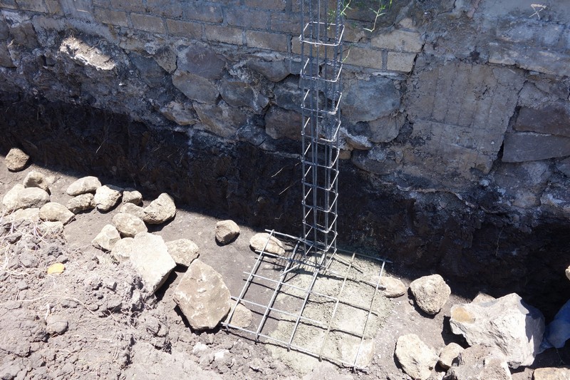 We had expected to see bent castillos by the sides of the two round columns, since some "adjustment" was required here (remember that all castillos were placed at the whim of "maestro" X without bothering to measure any distances between them, and in particular without paying any heed to the width and position we specified for the portón - see here). Rubén showed us a photo he took before he rectified them, and indeed the curvature was pretty gross. But we hadn't expected to see that all the other castillos excavated to date were also twisted and/or well off vertical - from what we have seen, he didn't put a single one in straight. Unfortunately, we were not there at the right time to note this when the work was done. As seen here, Rubén is using a substantial amount of extra reinforcement to ensure that the wall above is firmly anchored to its foundation. |