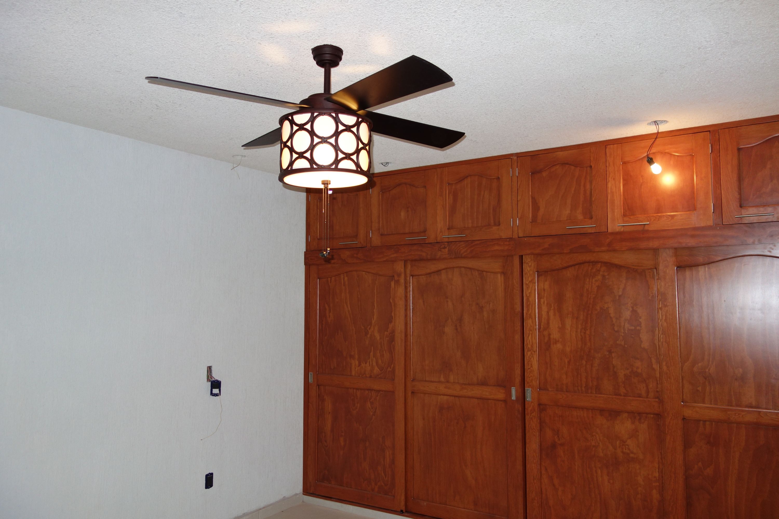 The ceiling fans are being fitted, including here in the second bedroom. In each bedroom, the ceiling fan will also serve as the main room light, with pairs of spots over the closet and bed (the latter operating via dimmers). The bedroom closets are essentially finished. |