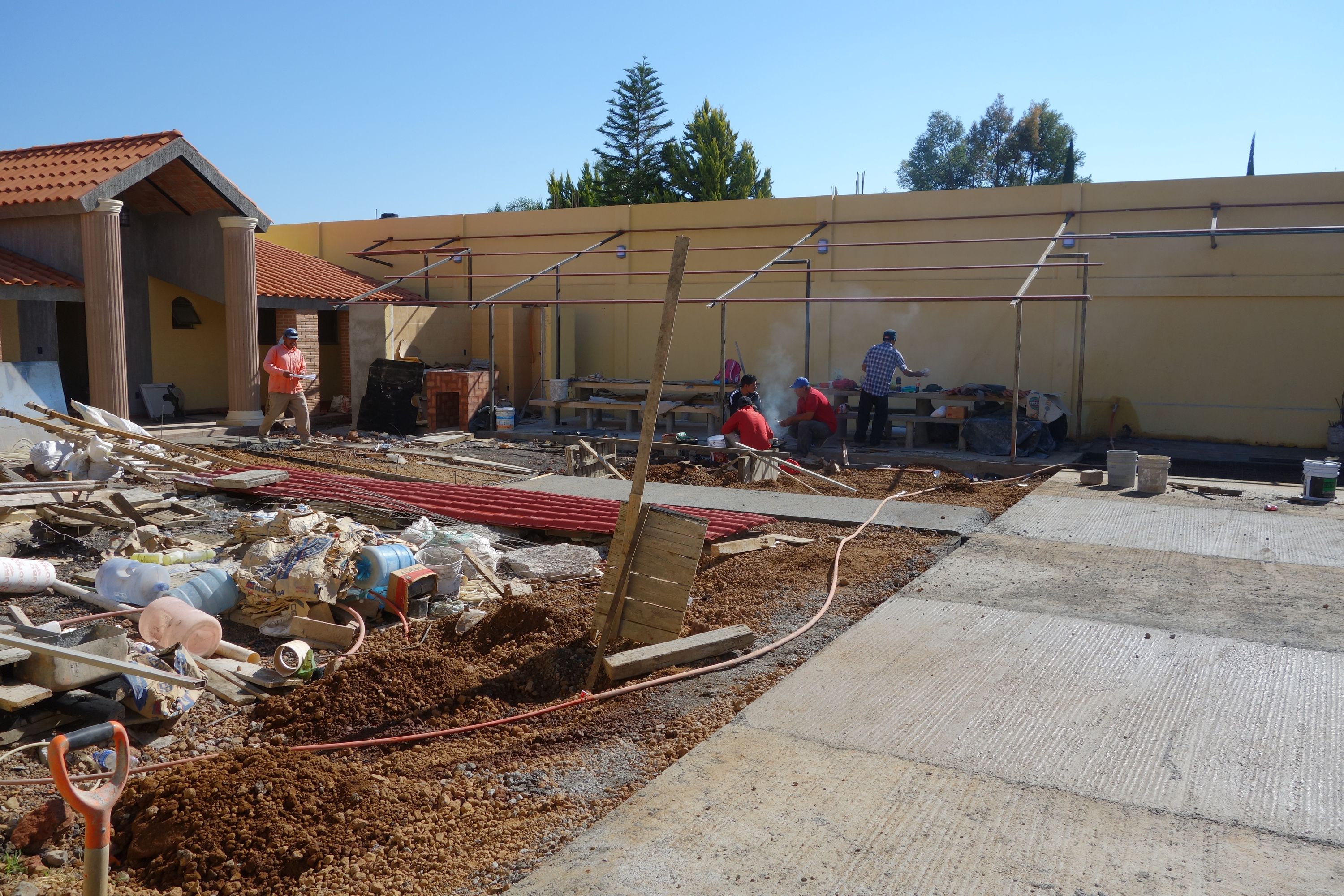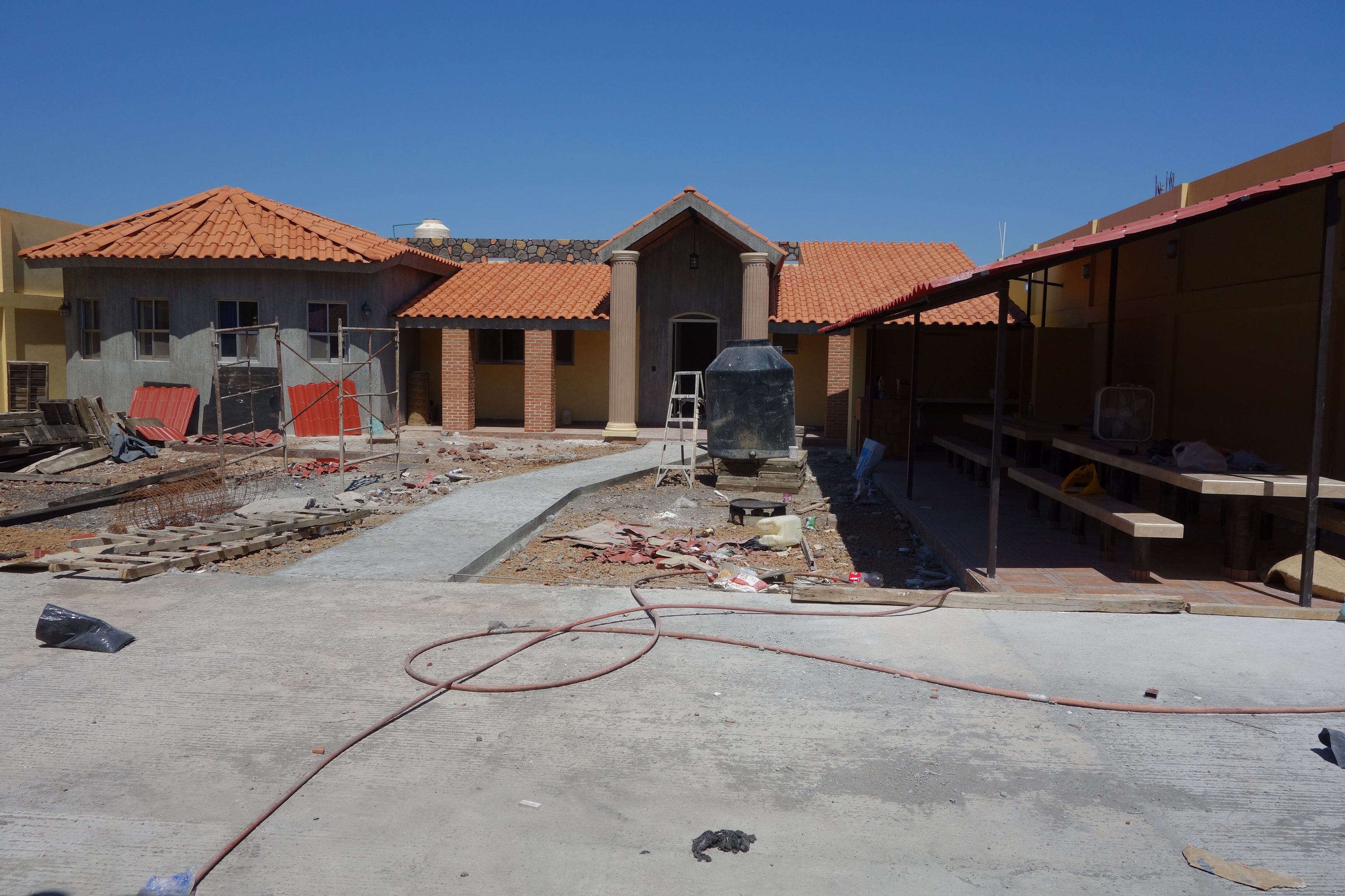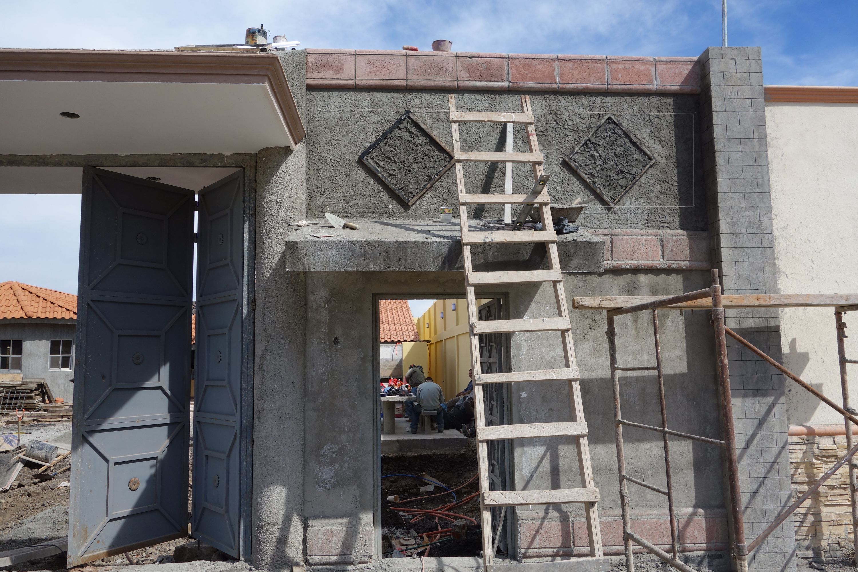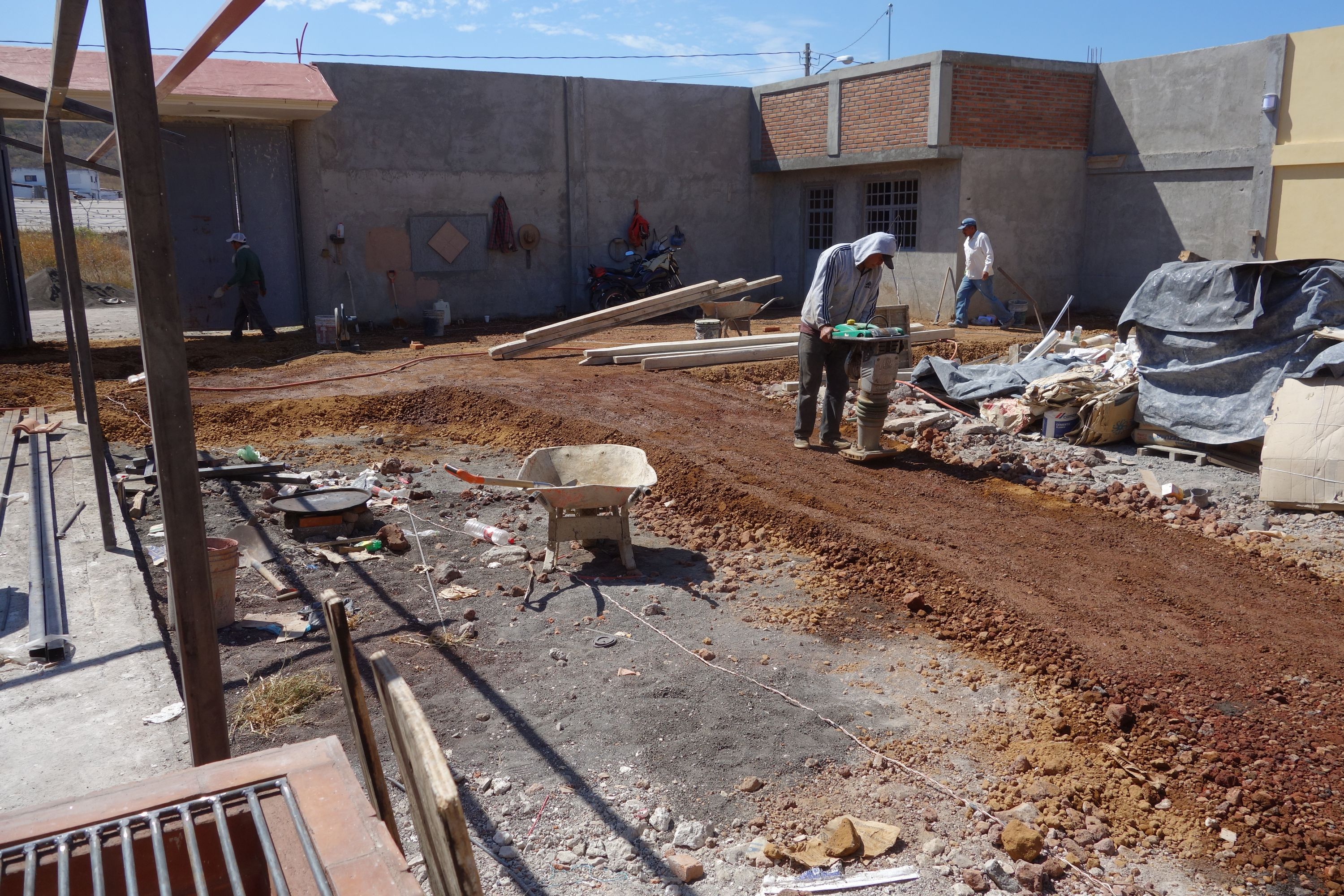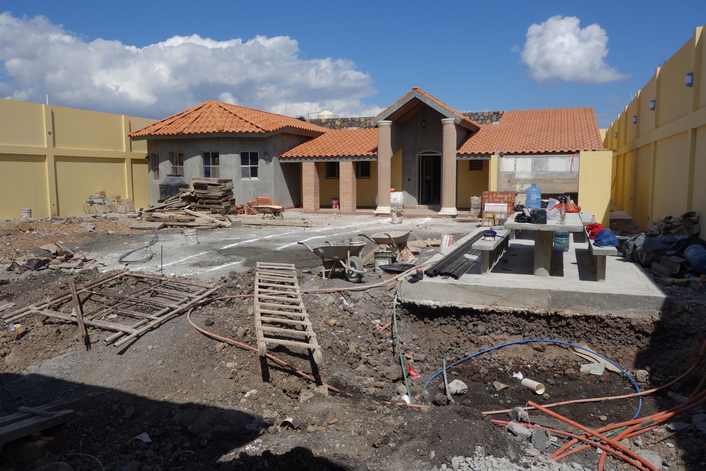 - The fachada is almost complete, firme or stones in concrete have been laid for the paths and parking area, and there is hand excavation for the banqueta. The frames for exterior roofing are mainly done.