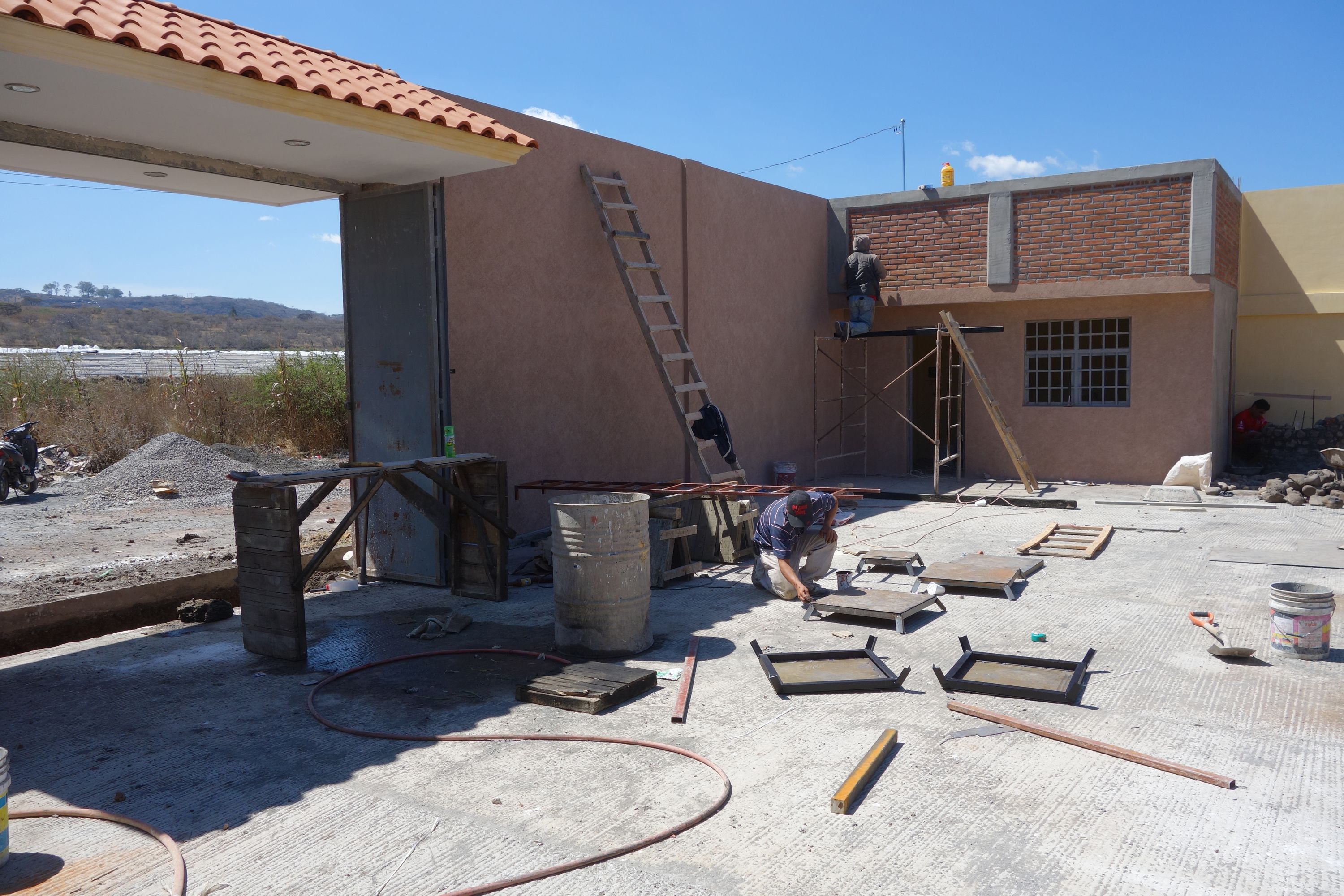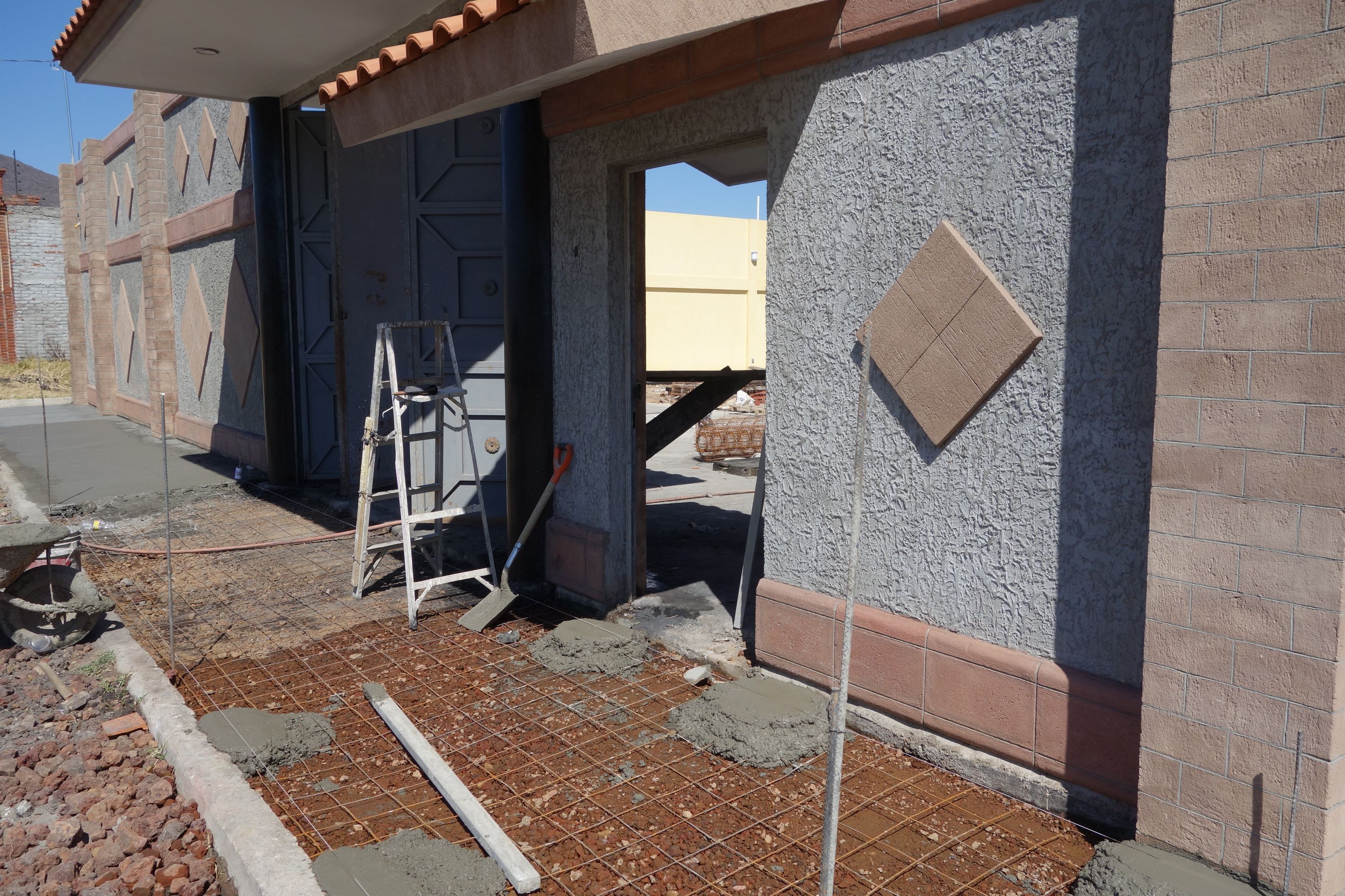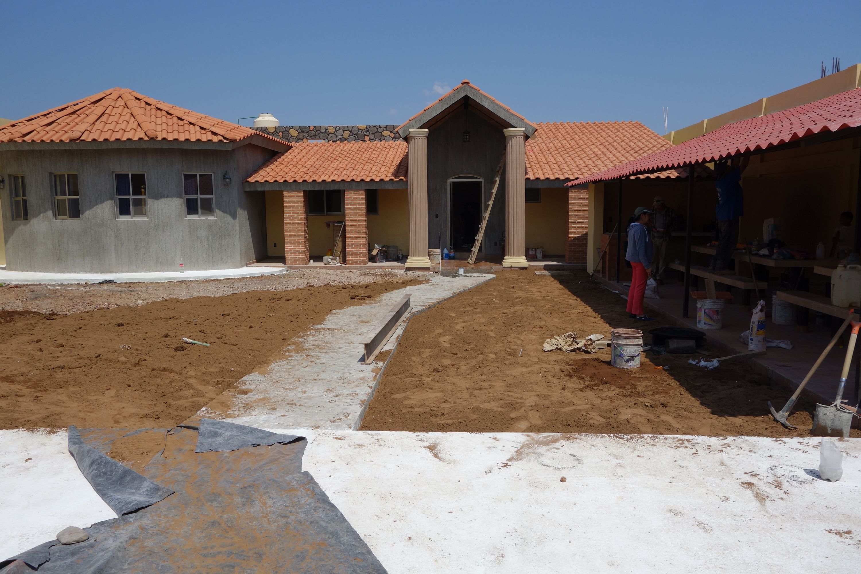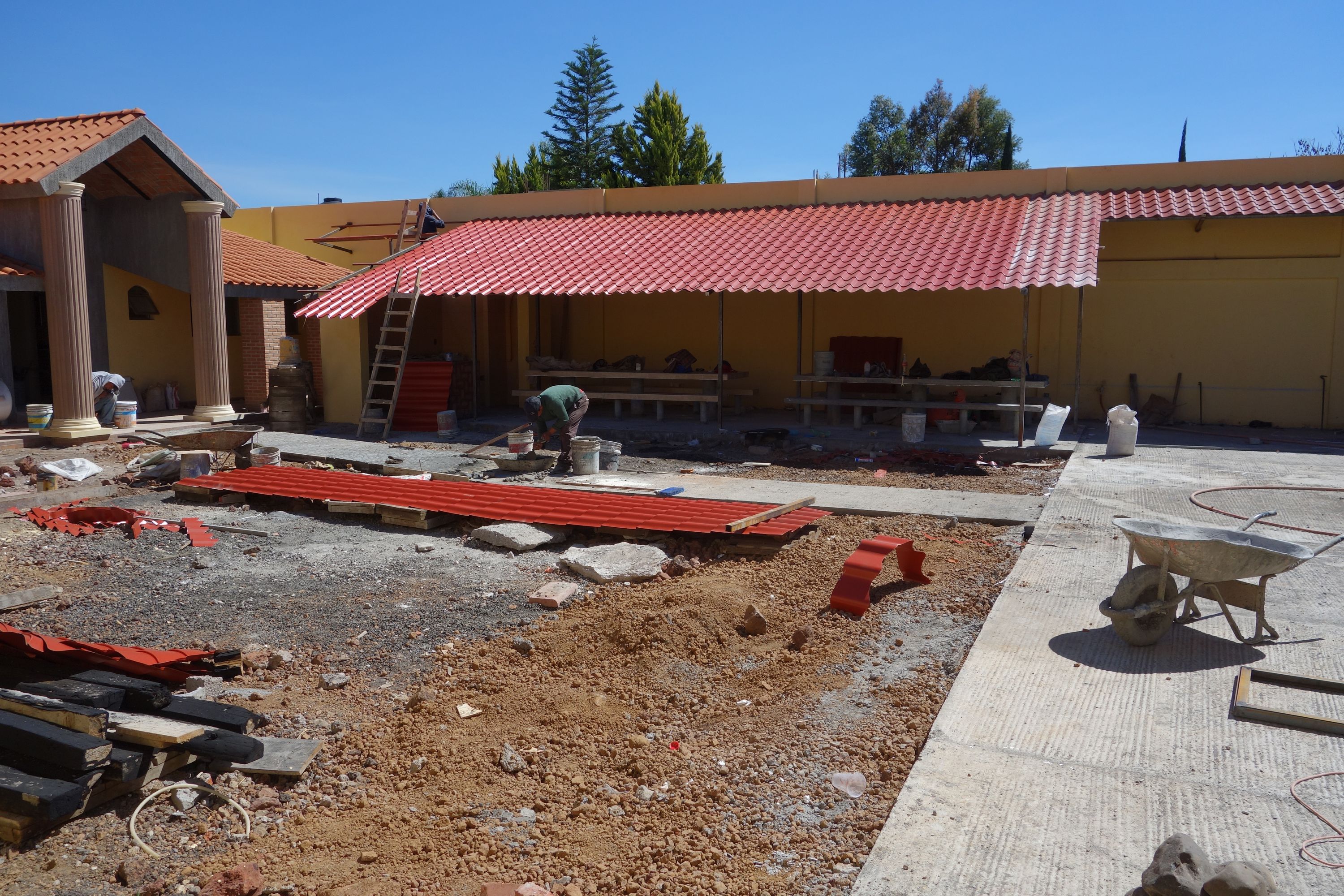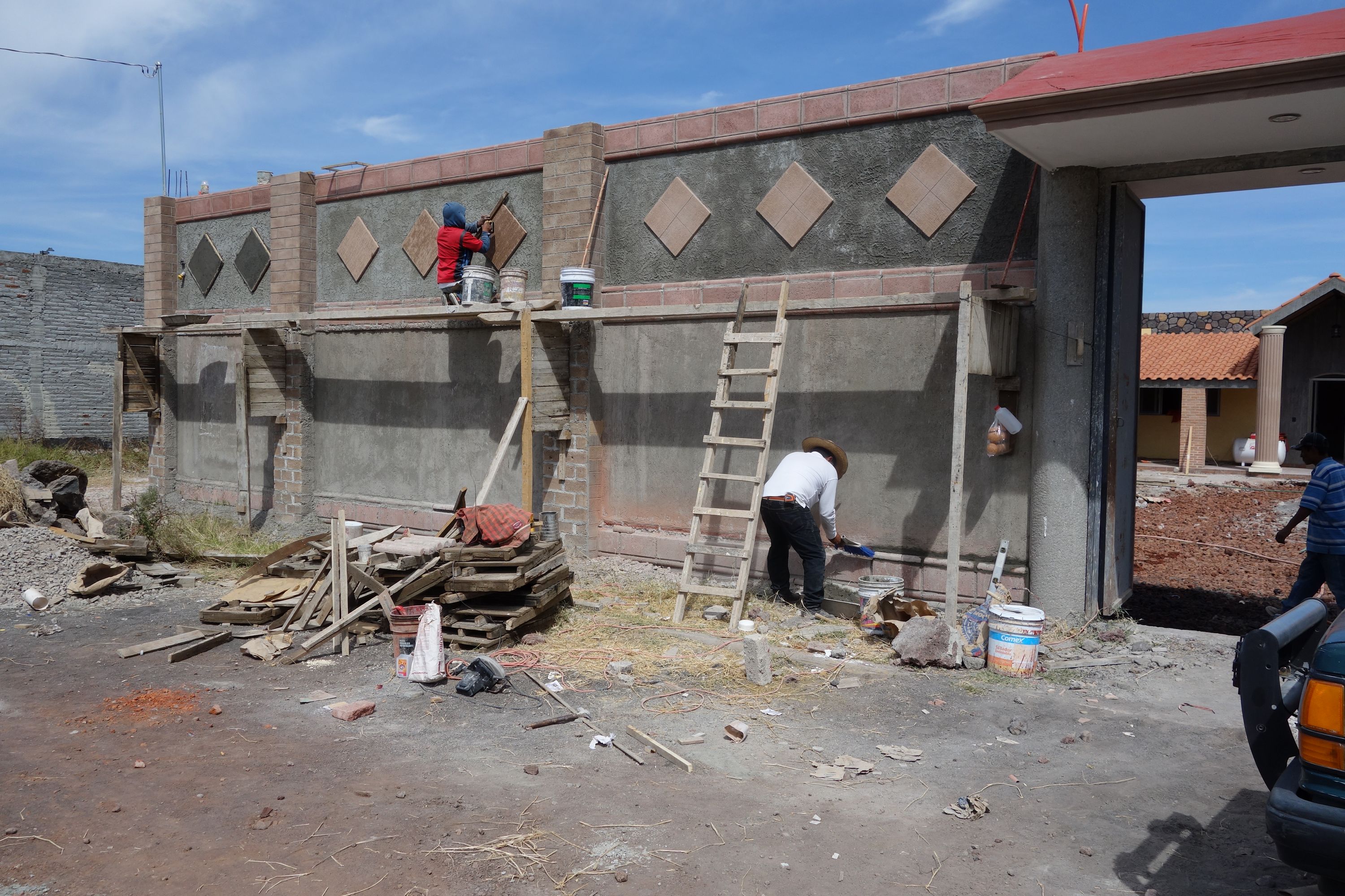 - The fachada is almost complete, firme or stones in concrete have been laid for the paths and parking area, and there is hand excavation for the banqueta. The frames for exterior roofing are mainly done.