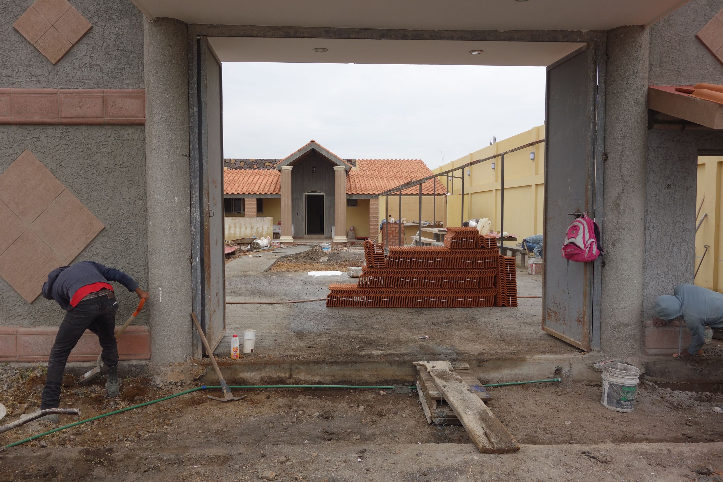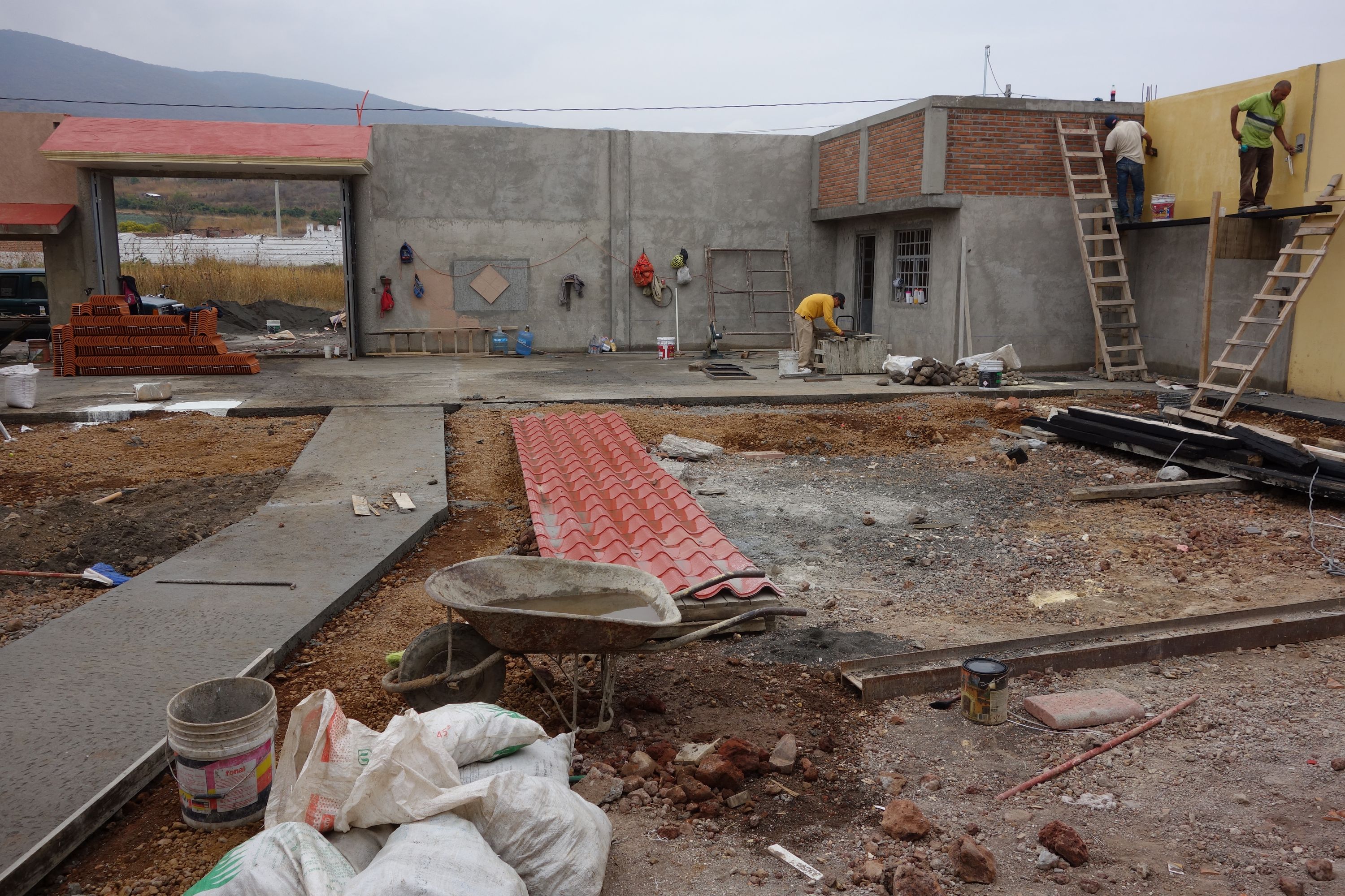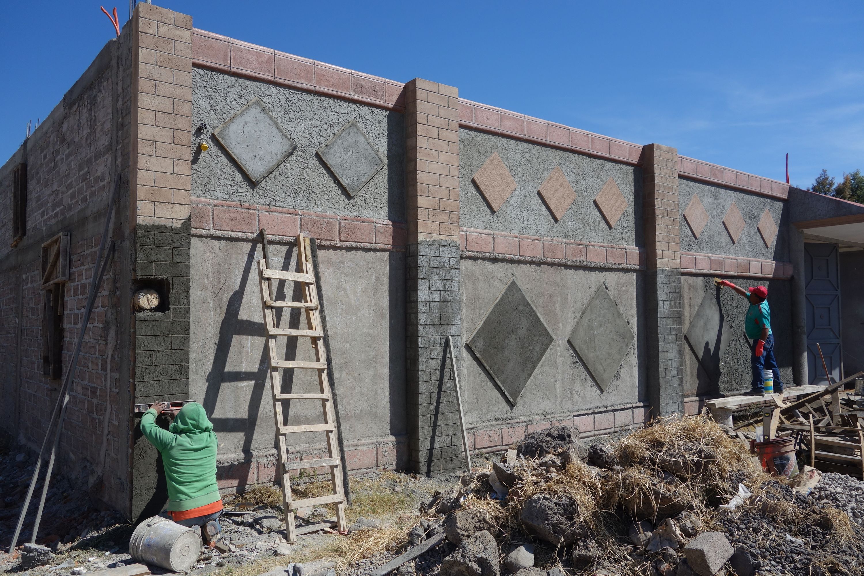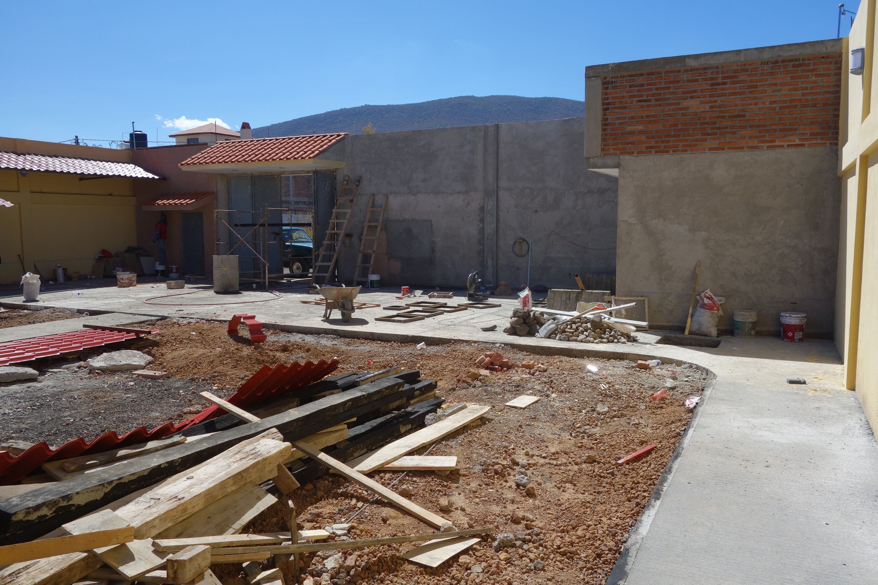 - The fachada is almost complete, firme or stones in concrete have been laid for the paths and parking area, and there is hand excavation for the banqueta. The frames for exterior roofing are mainly done.