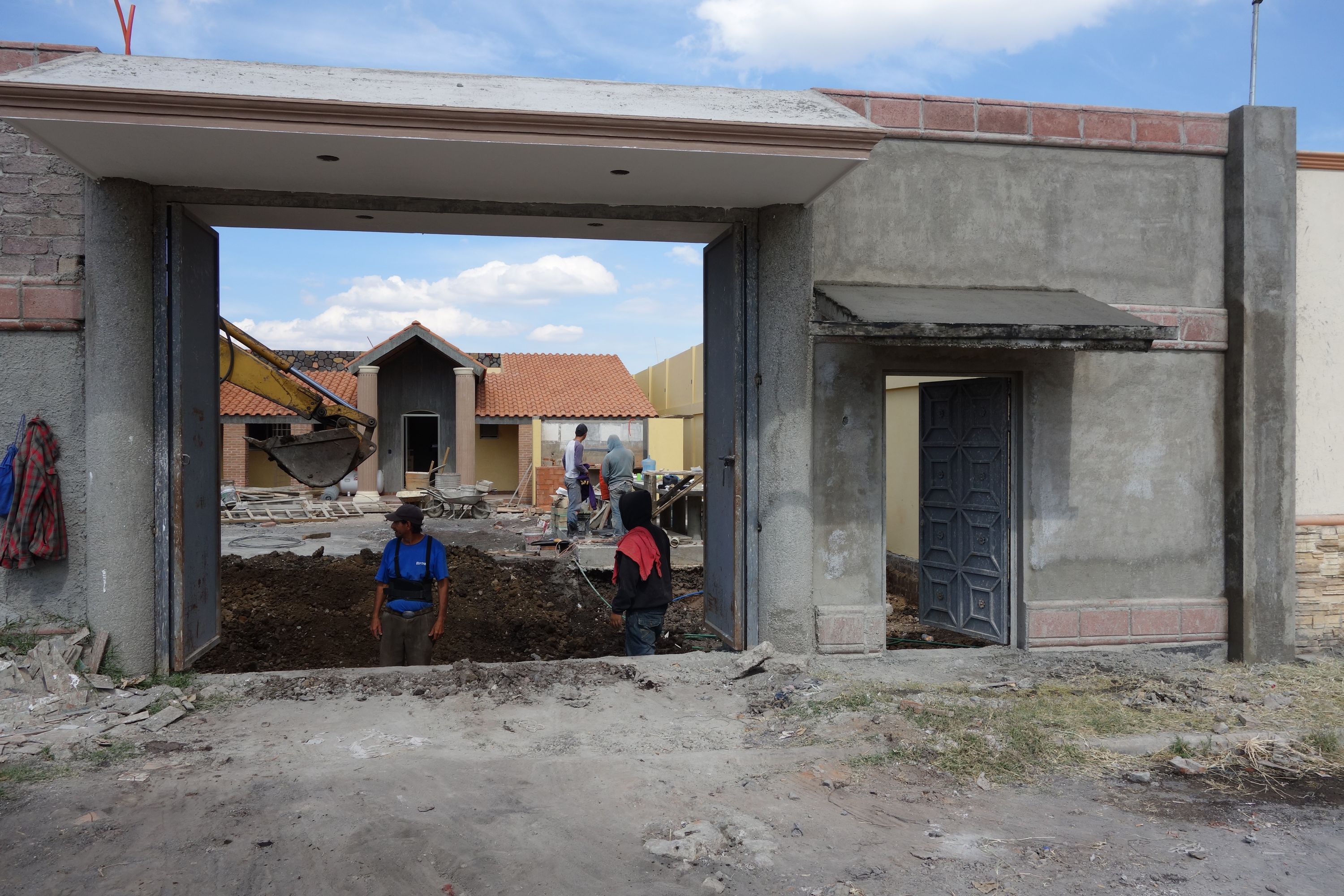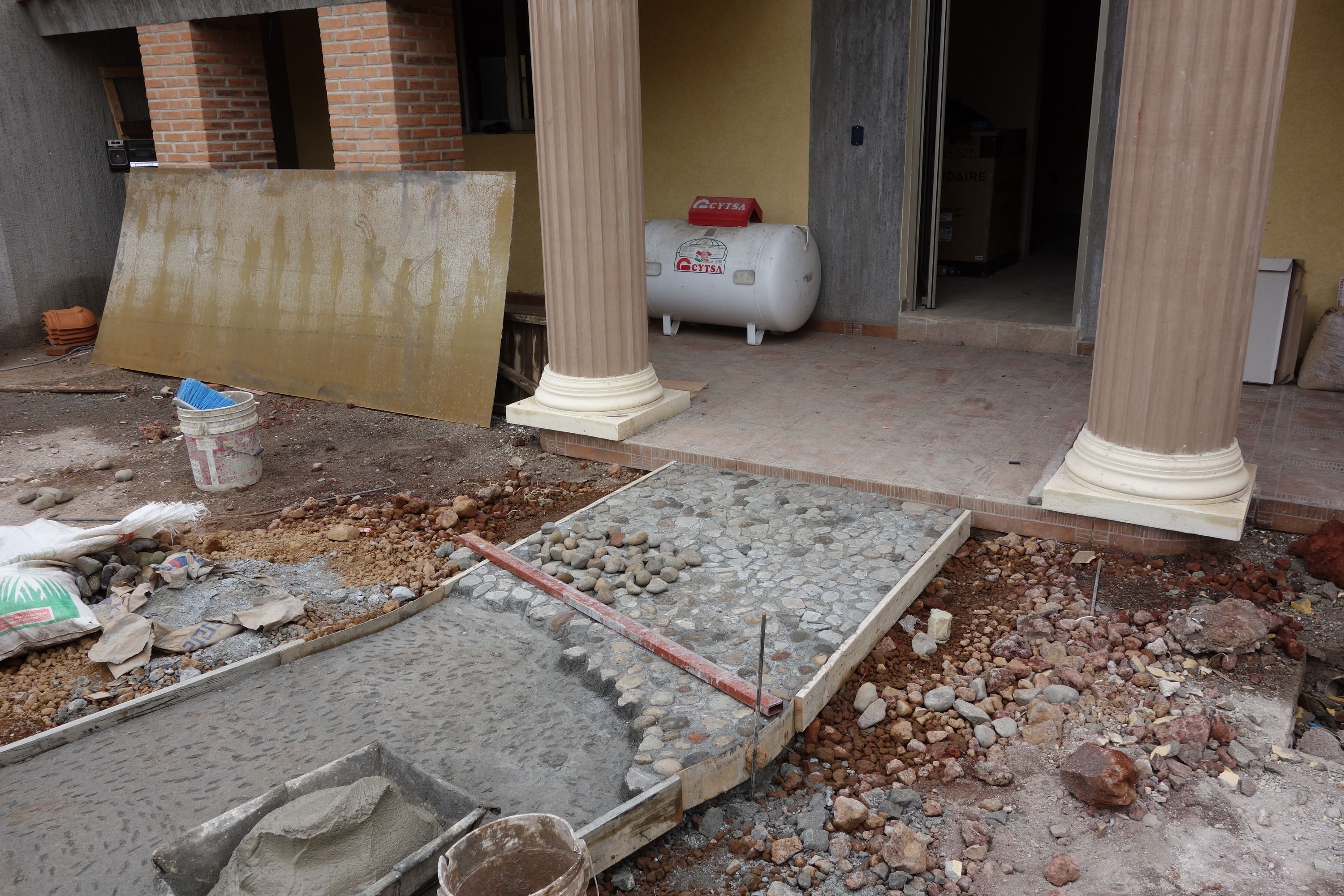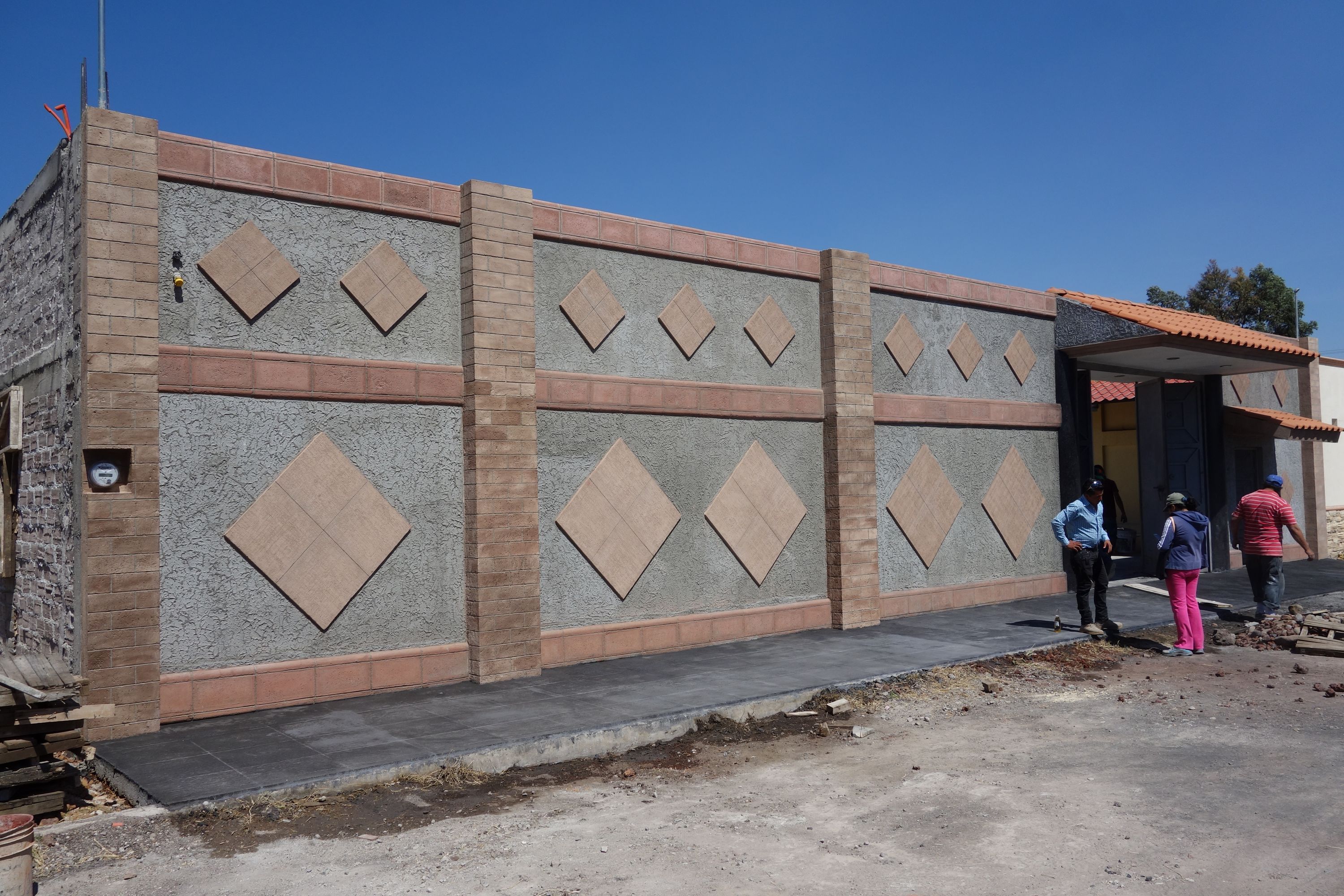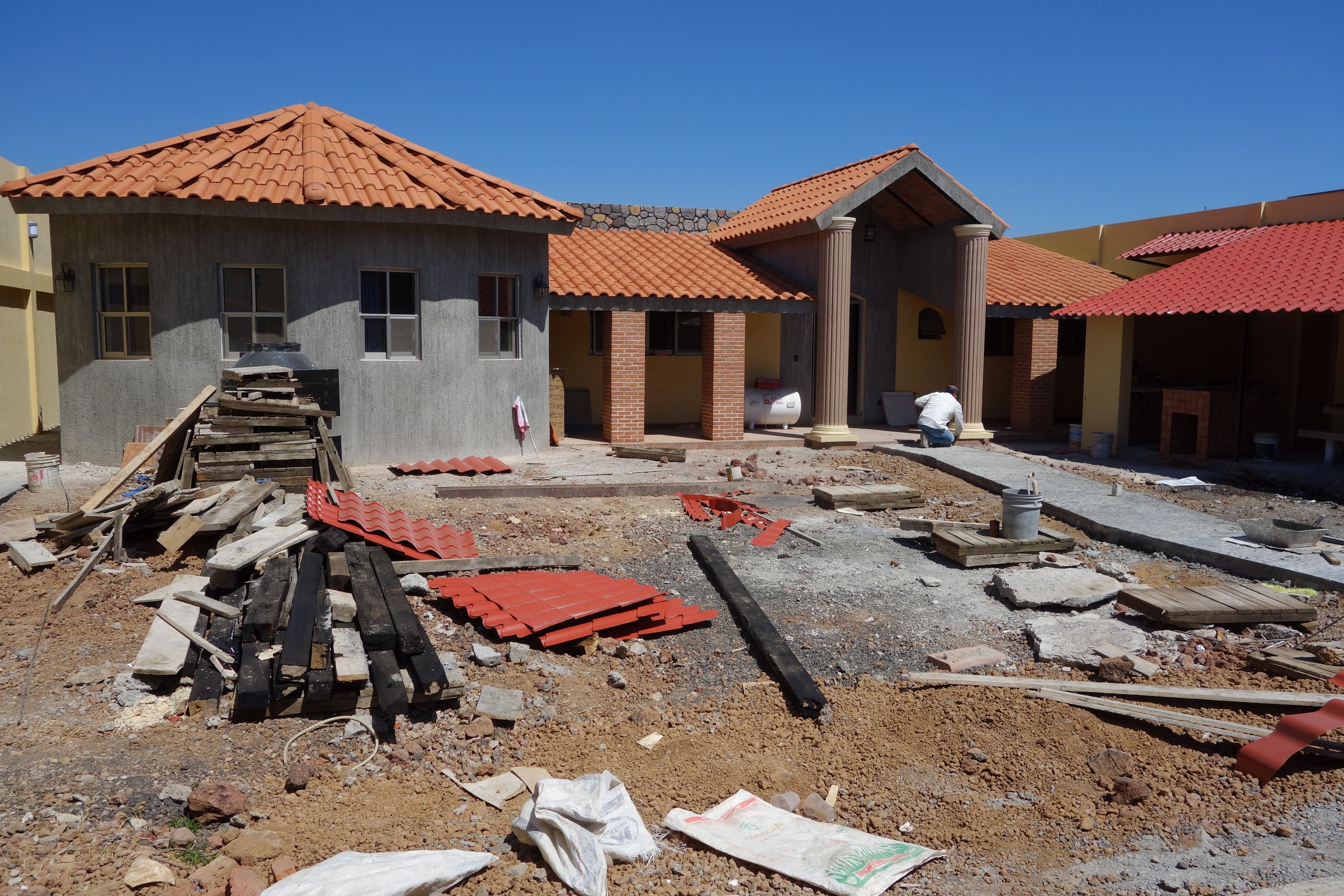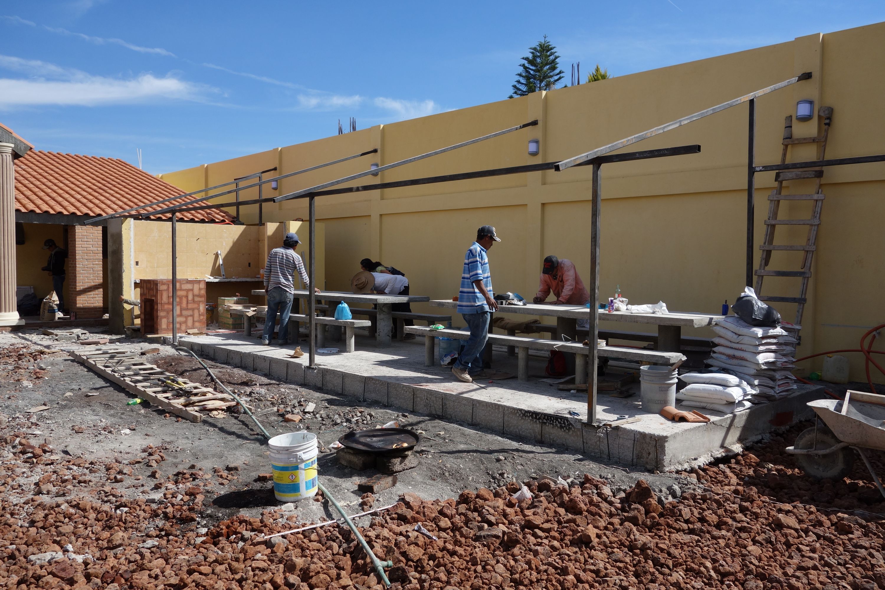 - The fachada is almost complete, firme or stones in concrete have been laid for the paths and parking area, and there is hand excavation for the banqueta. The frames for exterior roofing are mainly done.