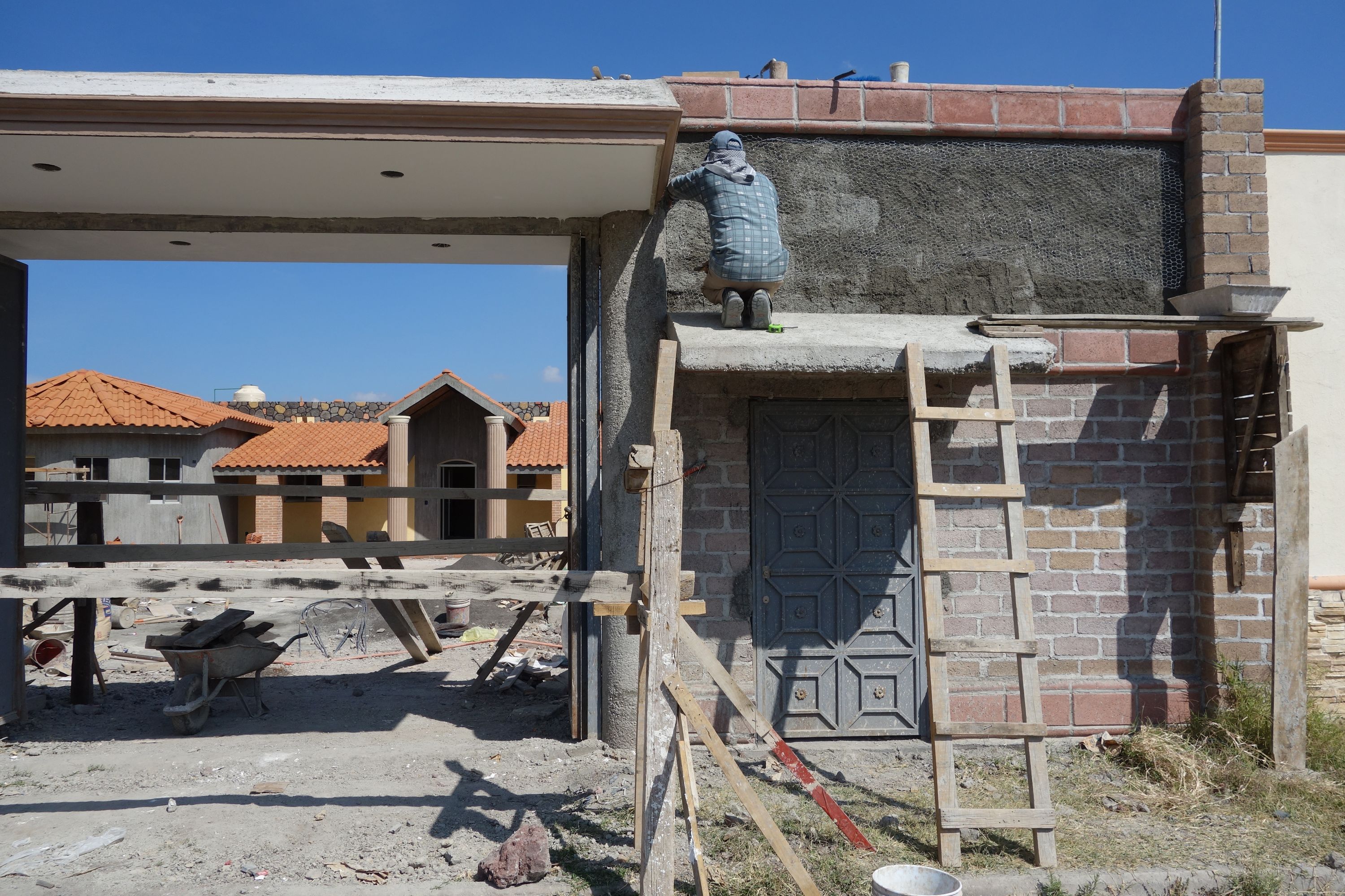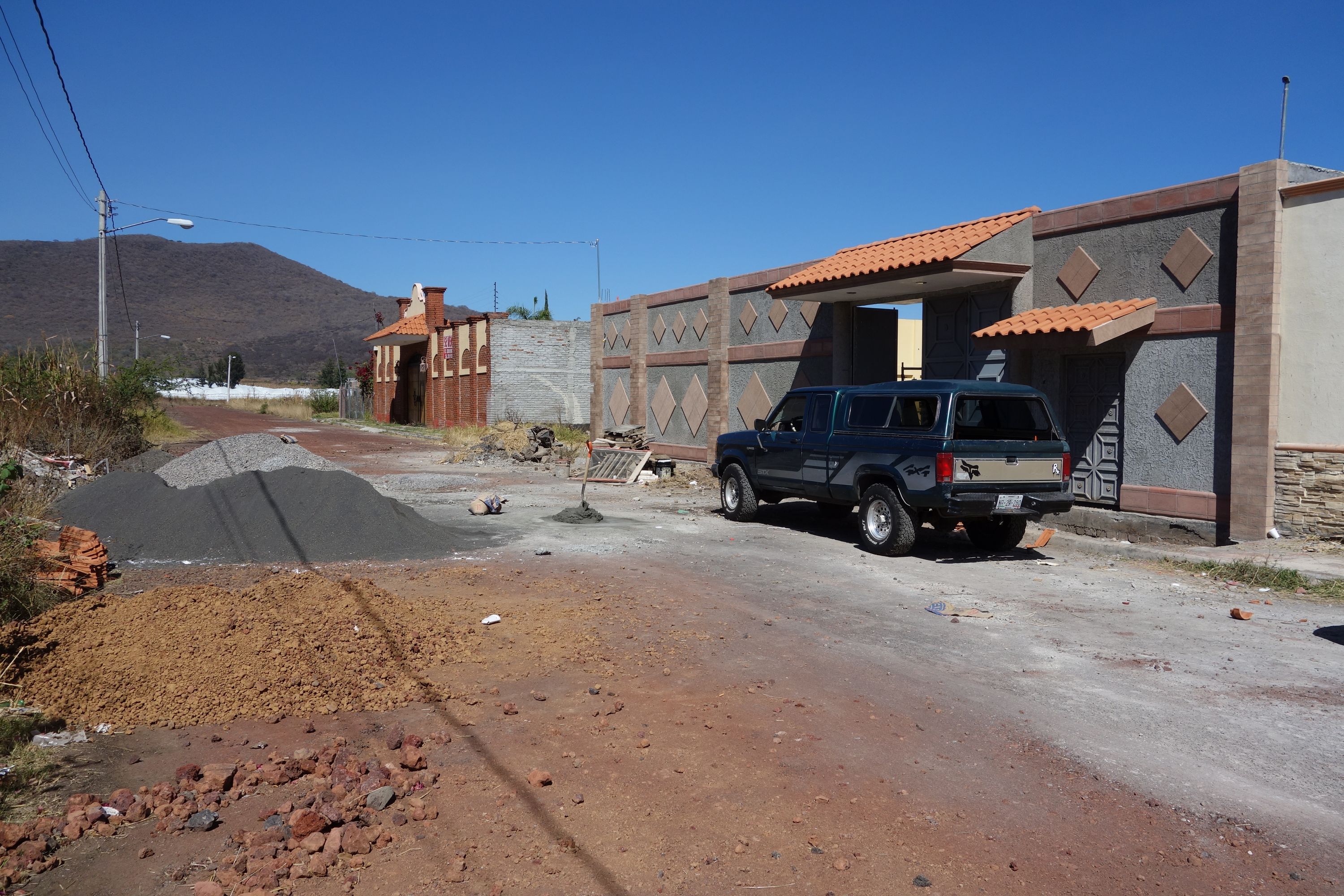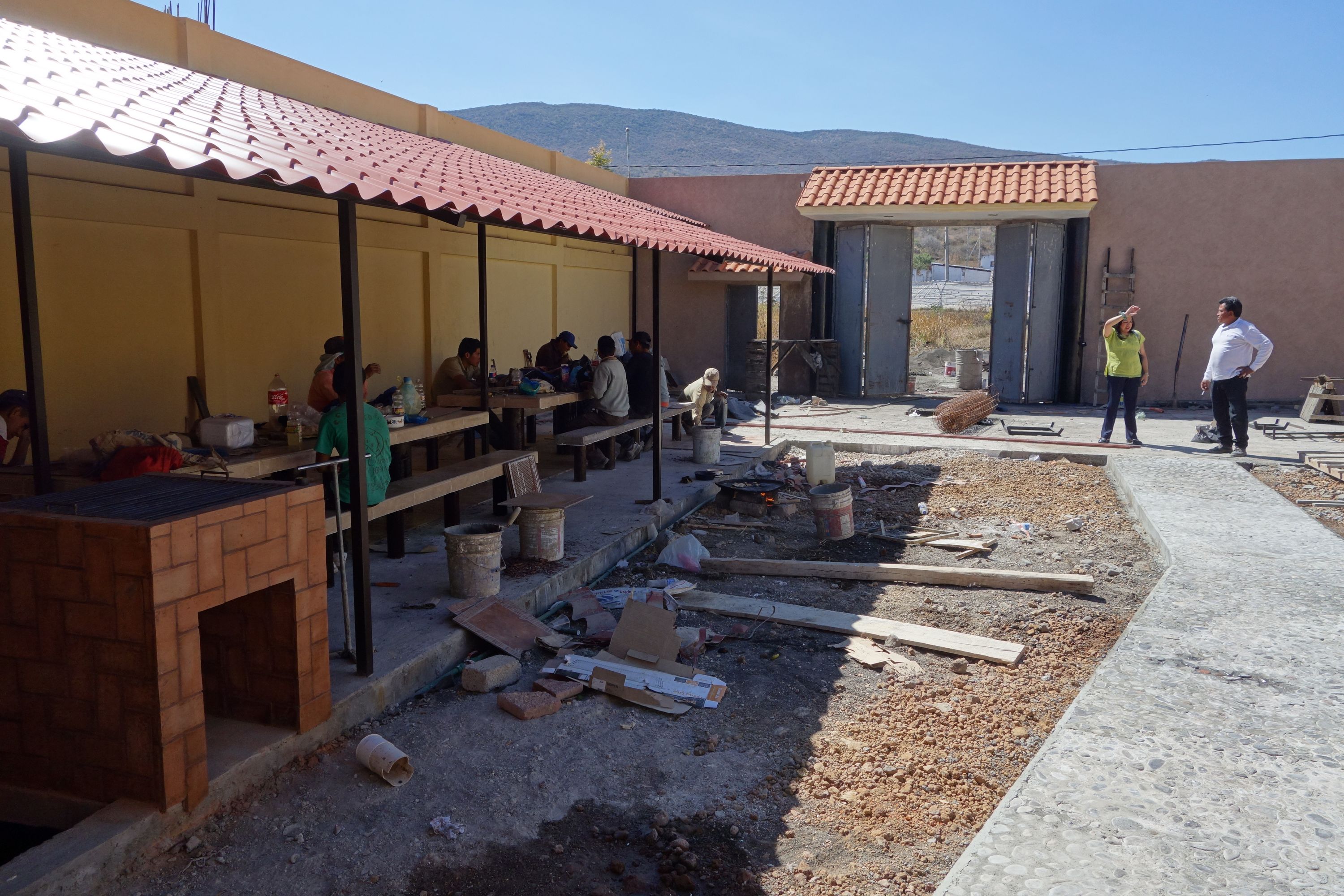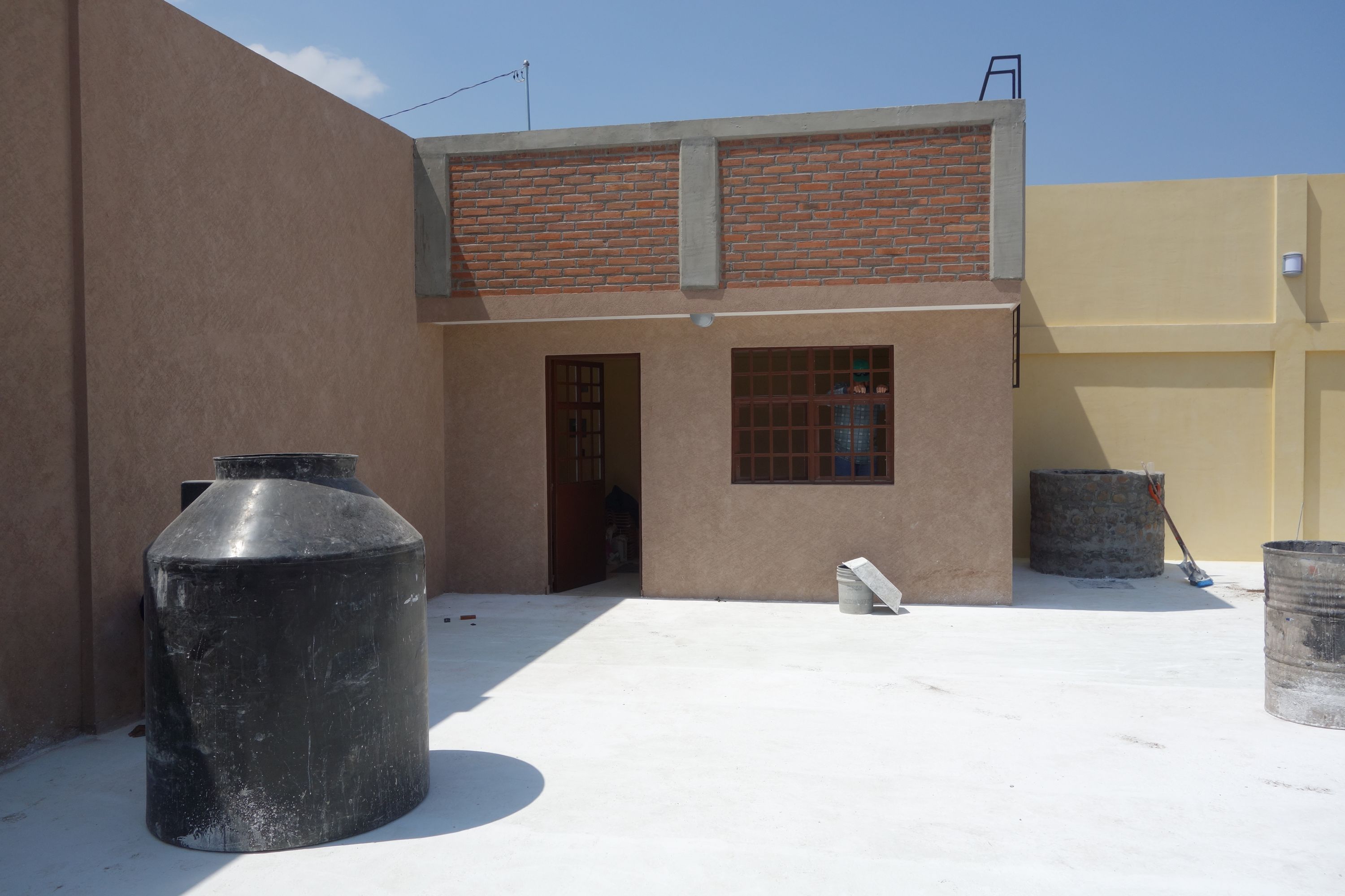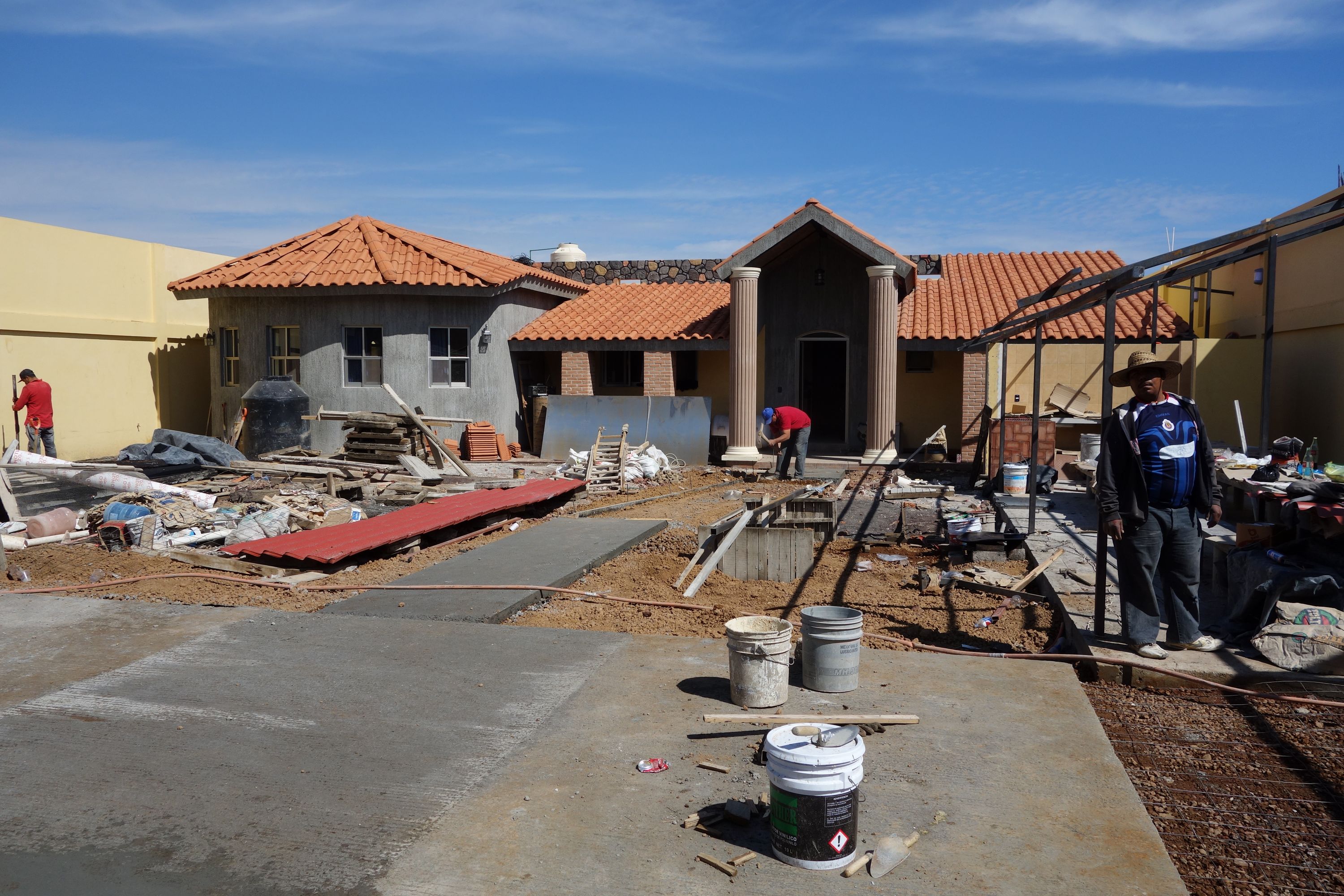 - The fachada is almost complete, firme or stones in concrete have been laid for the paths and parking area, and there is hand excavation for the banqueta. The frames for exterior roofing are mainly done.