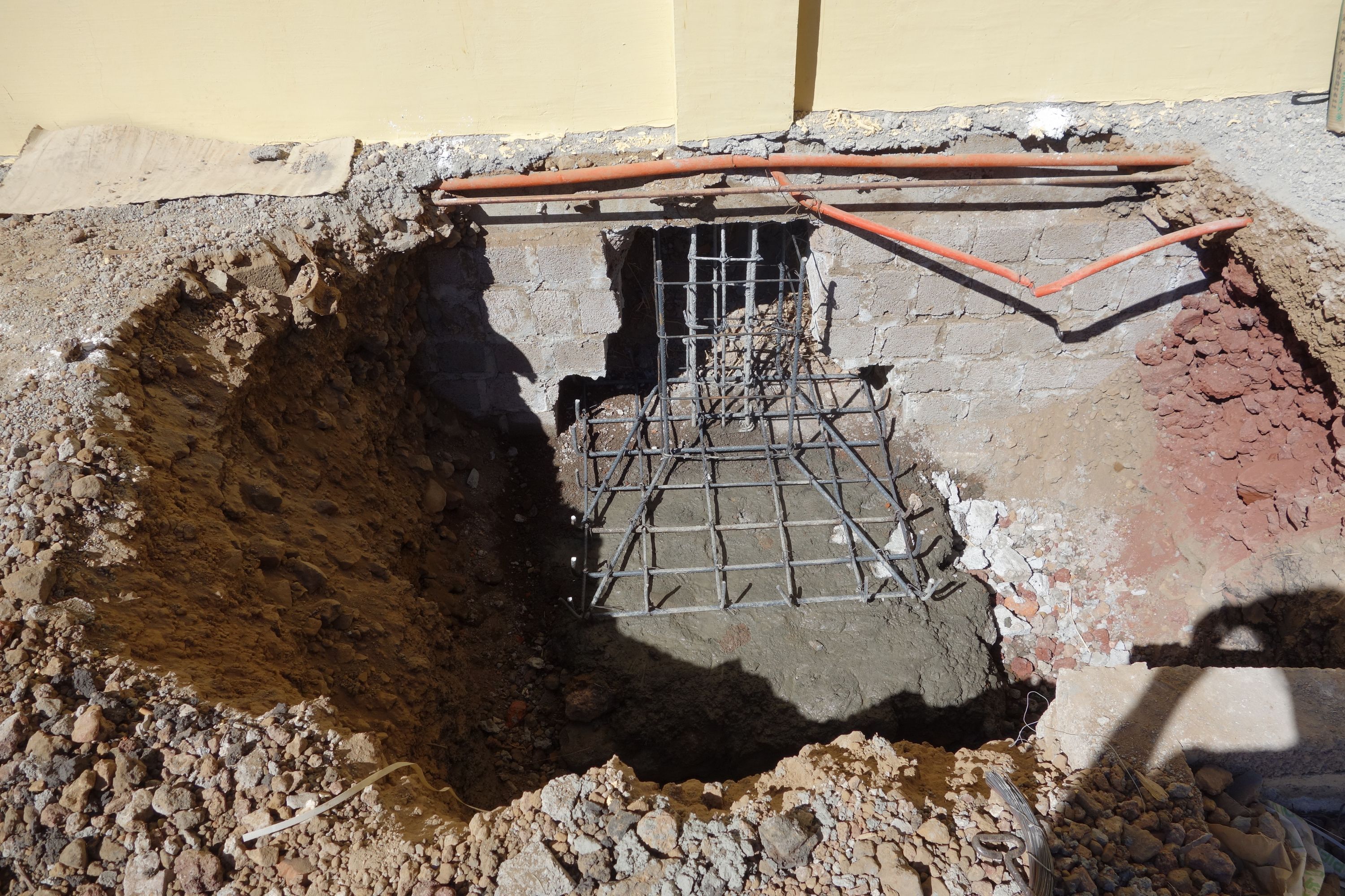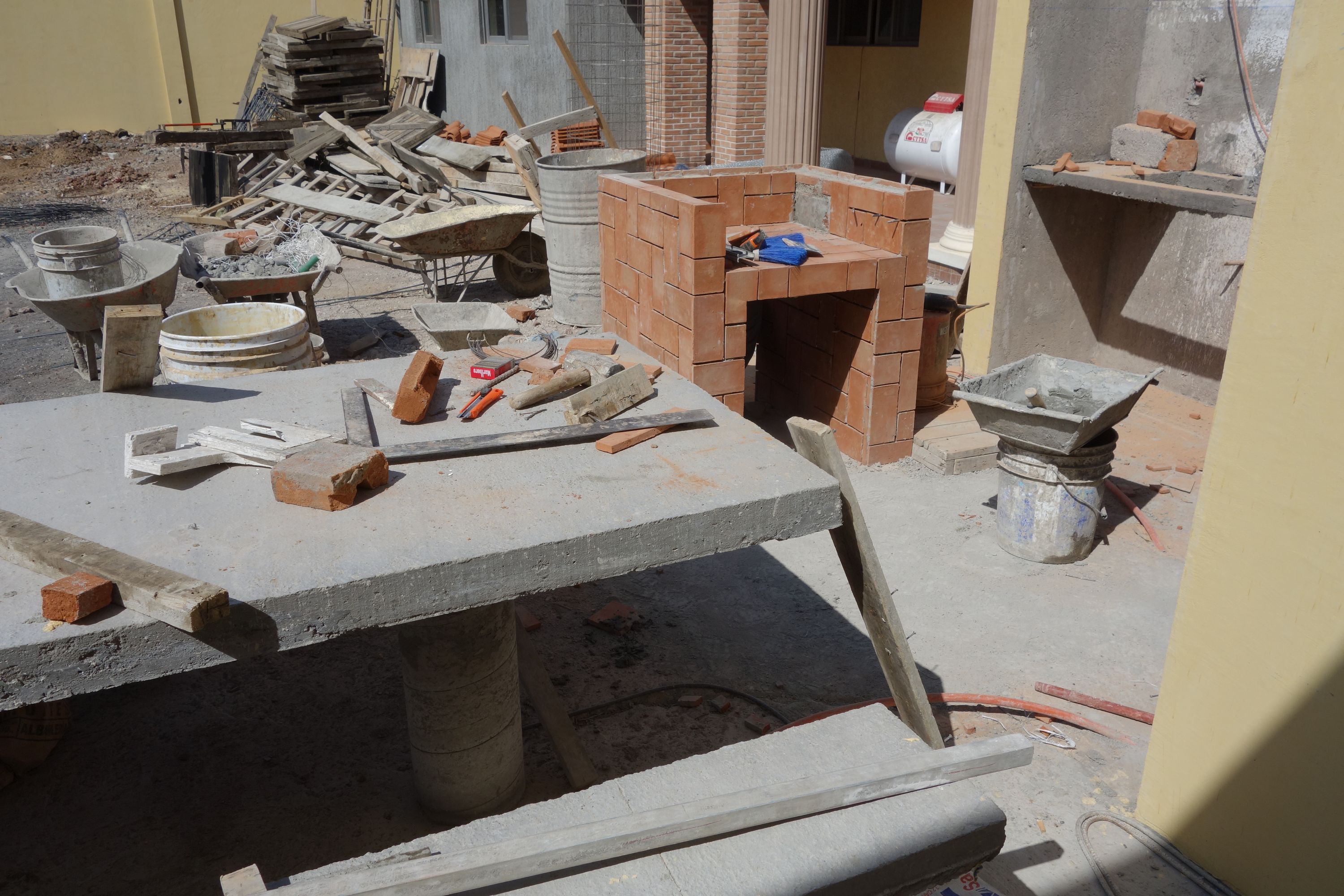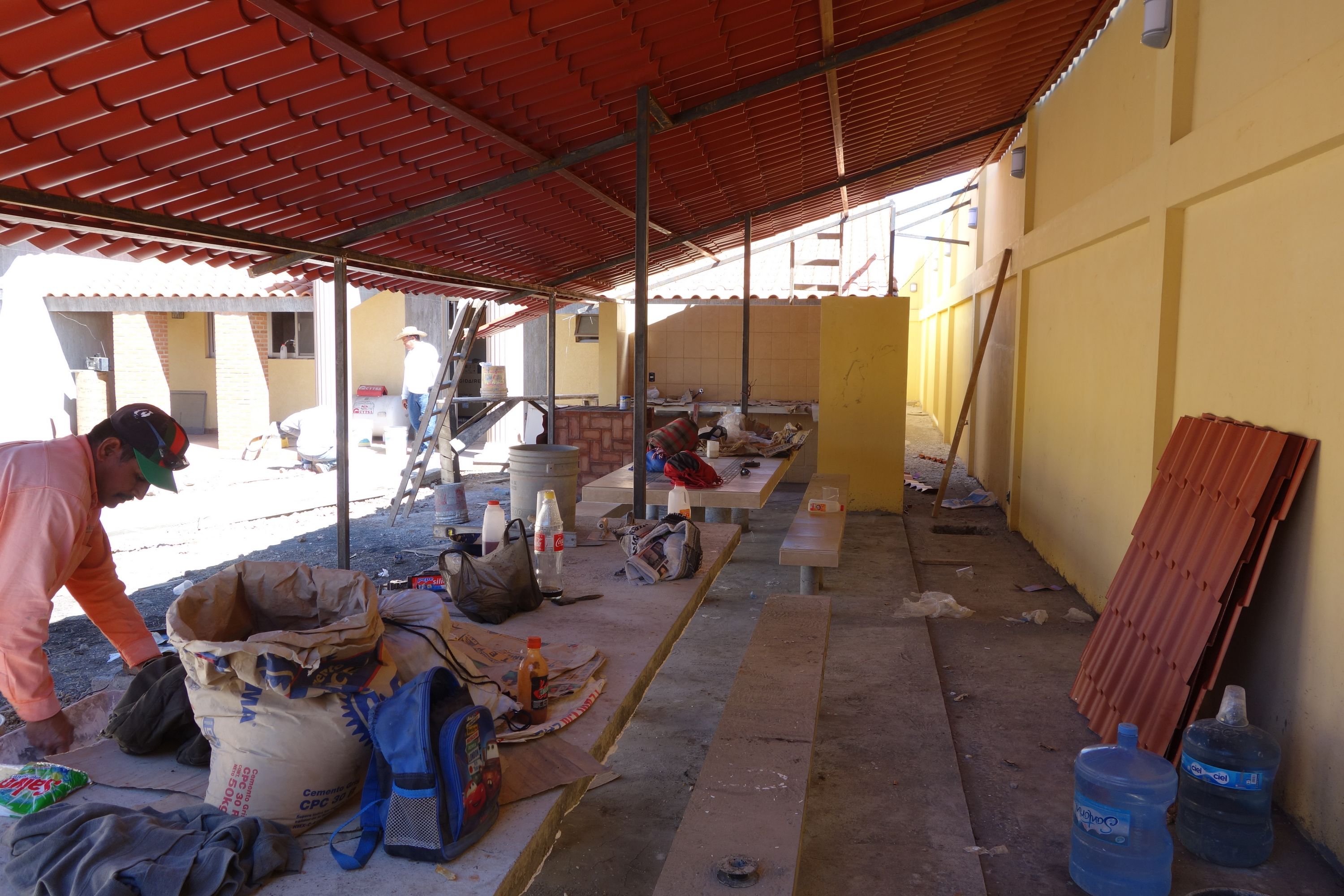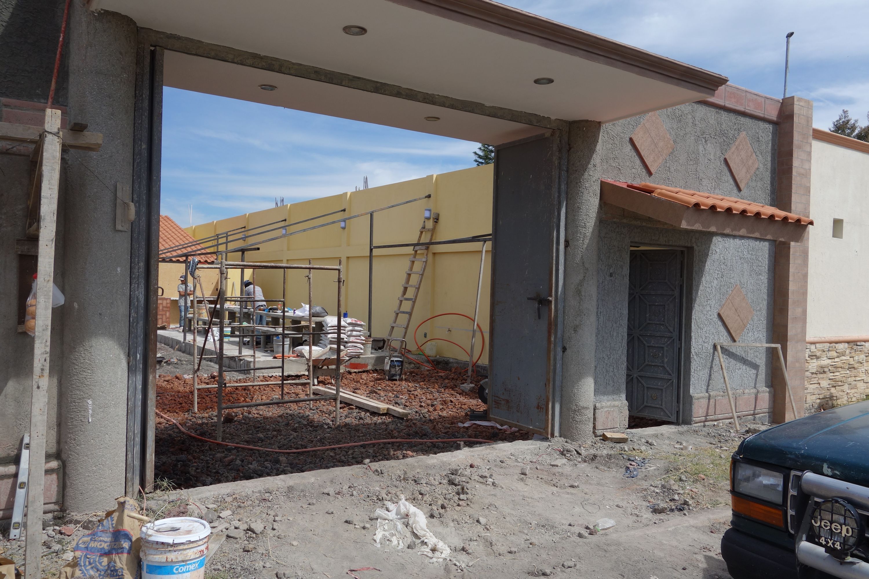 - The main work is on the boundary wall, especially the fachada, which is being reinforced both inside and outside prior to providing an elegant finish. In this and other areas, inadequate plantillas from "maestro" X are being replaced. We also organized the steel roofing for the entertainment area. Inside, ceiling fans and shower cubicles have been fitted.