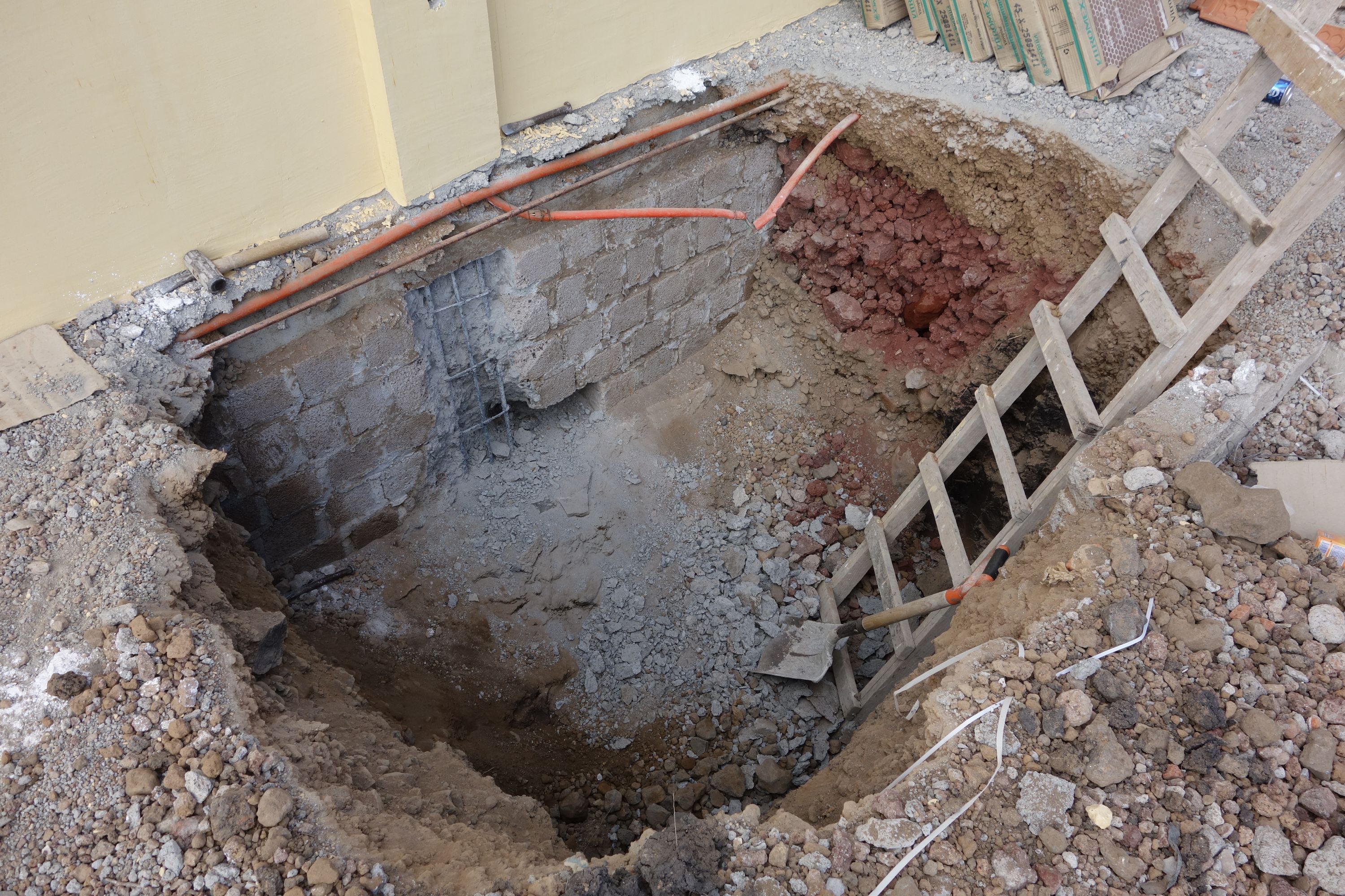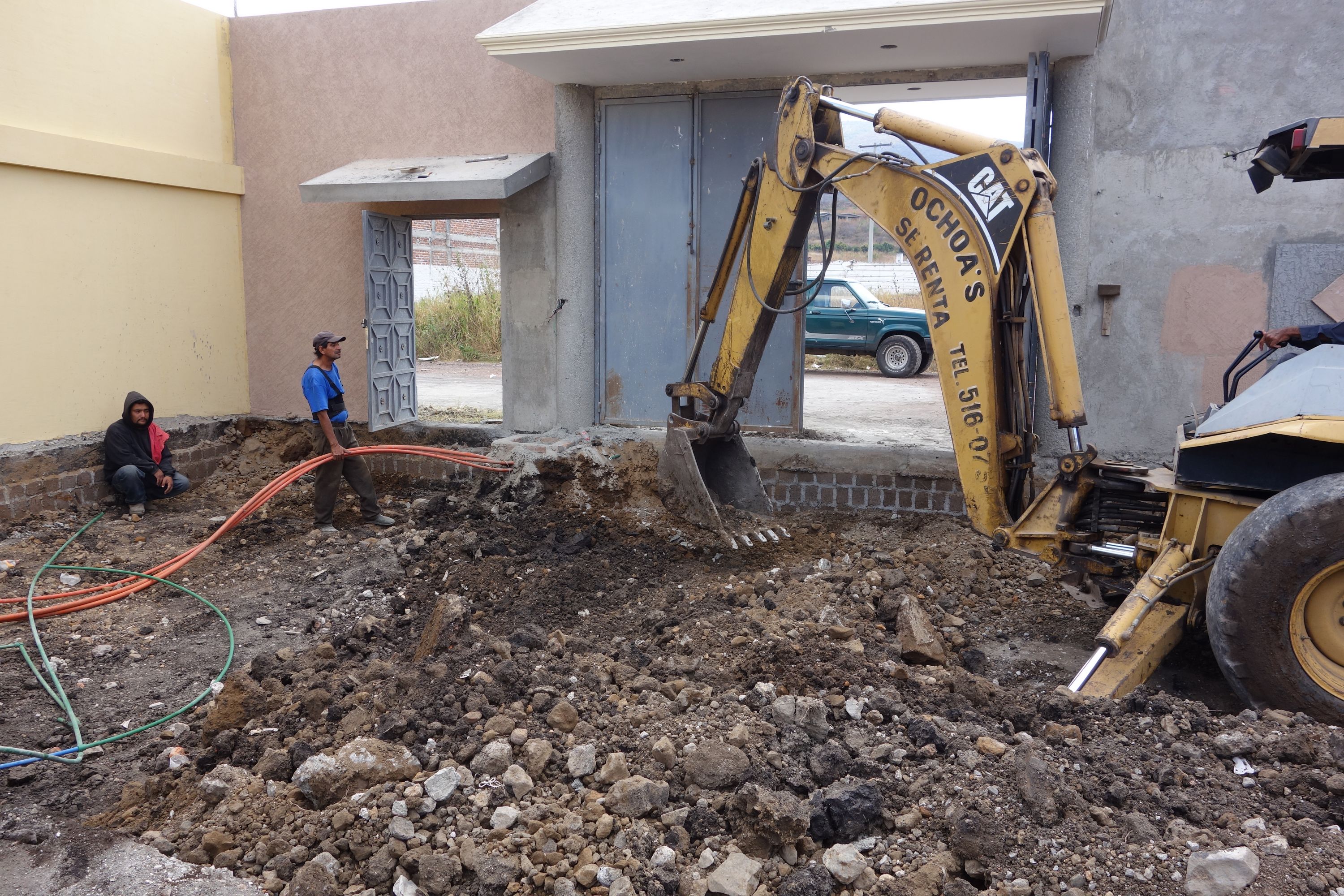A view from the other side. Care must be taken with the water pipes and manguera for electrical cables that Jaime previously installed. As can be seen, the excavator has already put a ding in the large marquesina; elsewhere, the sewage pipe to the septic tank is broken (probably unavoidably), and there is also a broken manguera (although the cable inside thankfully seems OK). |