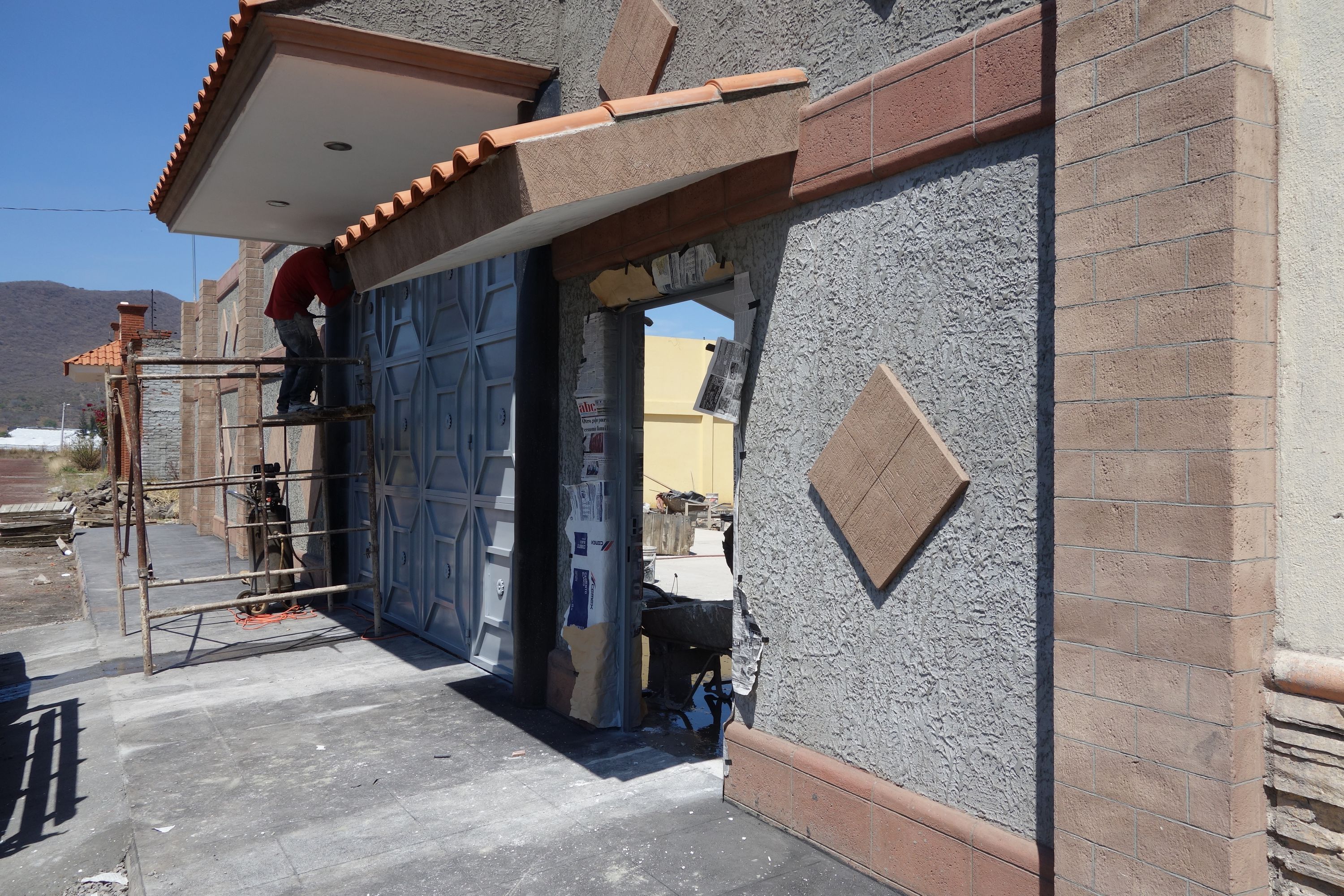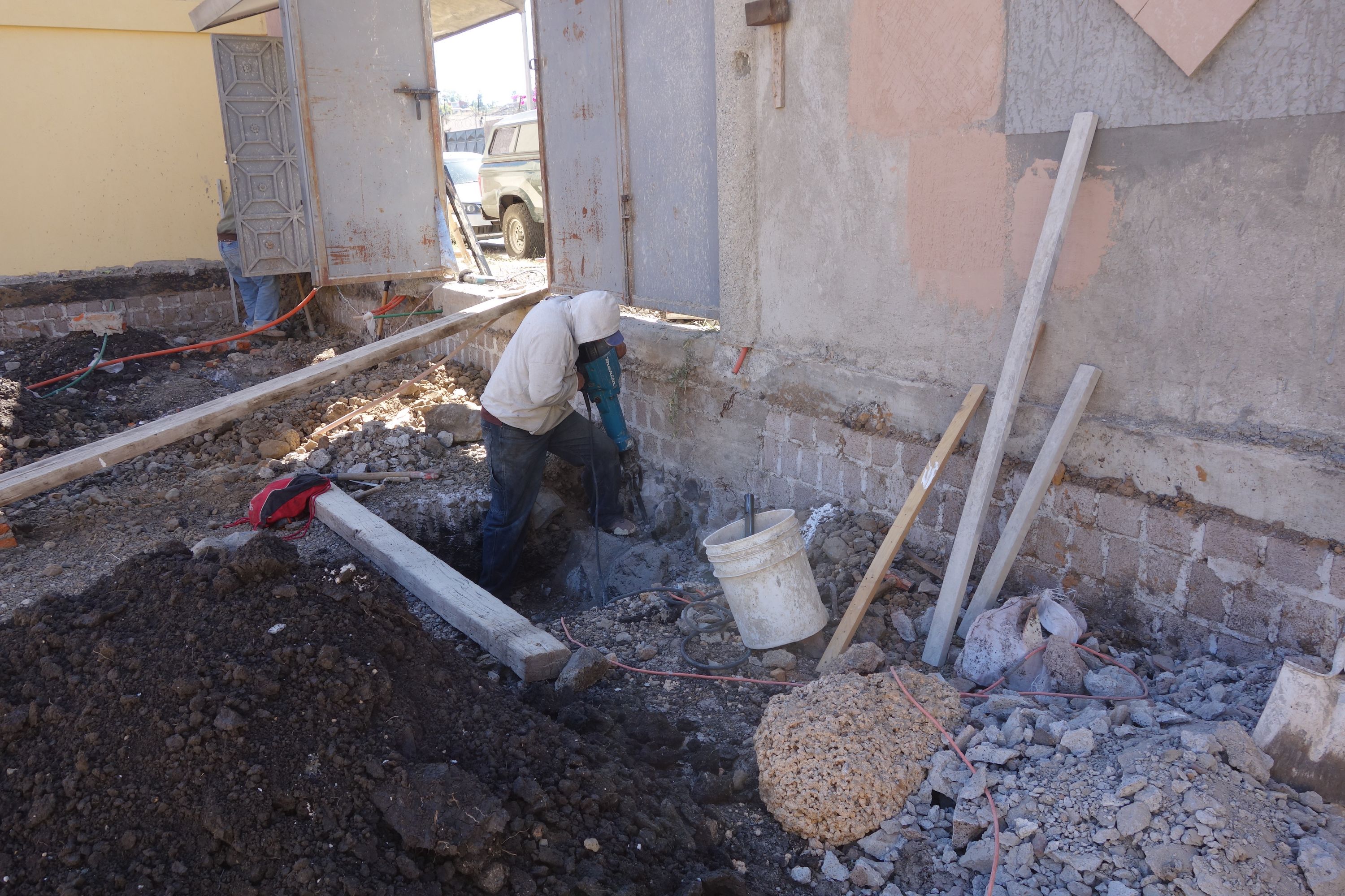 They are having to rent a jackhammer in their attempts to remedy the dreadful structural shortcomings from "maestro" X. This is not being done without good reason; apart from the numerous structural problems already noted, the doors of the portón will again not close properly - this can only be due to movement in the fachada wall. |