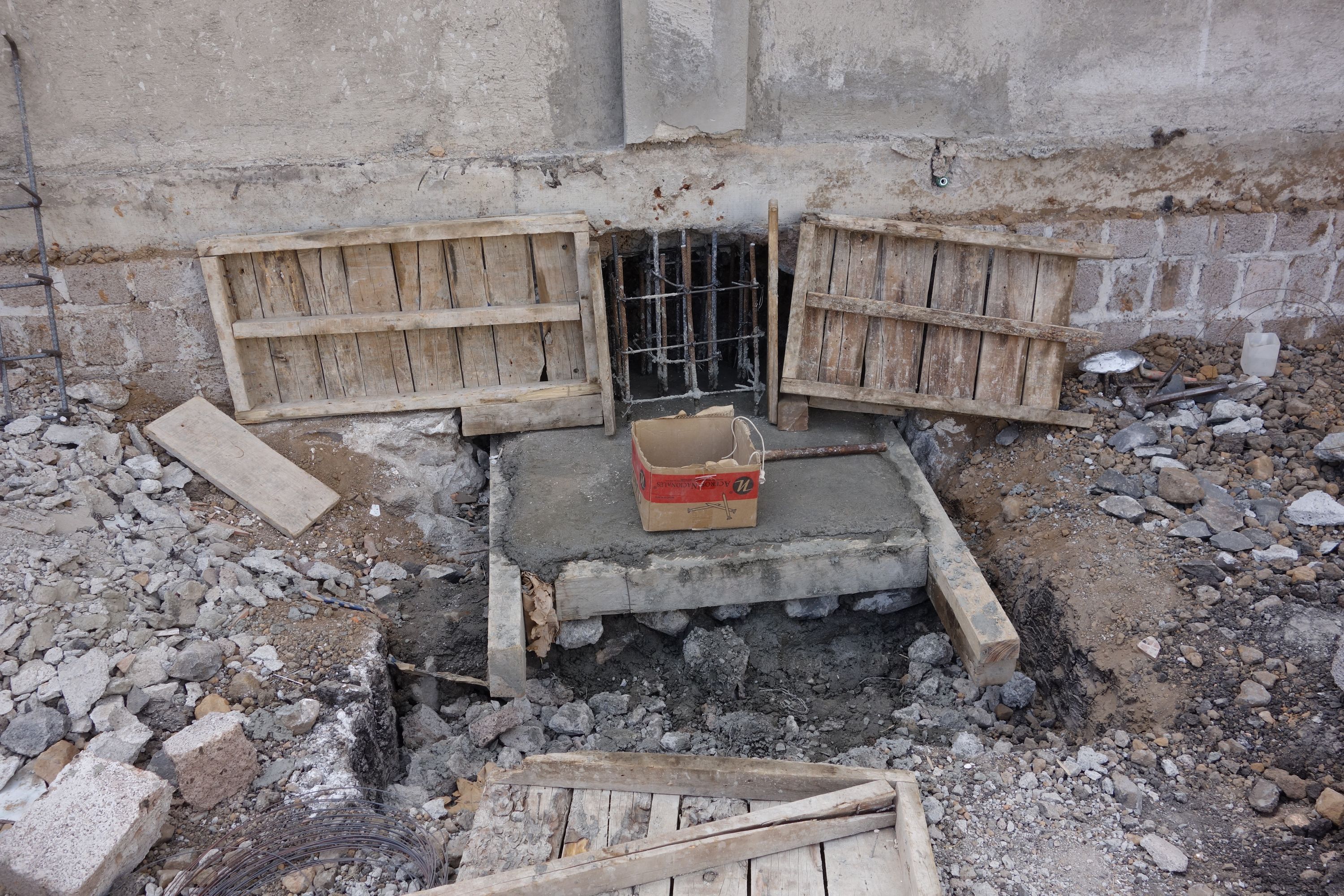 In addition to the excavation in the area of the fachada, holes are being opened by the castillos of the barda in areas away from the house. This is to fit replacement zapatas to prevent likely collapse of the wall, since those of "maestro" X are either absent, or hopelessly inadequate. We used the house foundation to support the wall by the house, but this is obviously not possible here. |