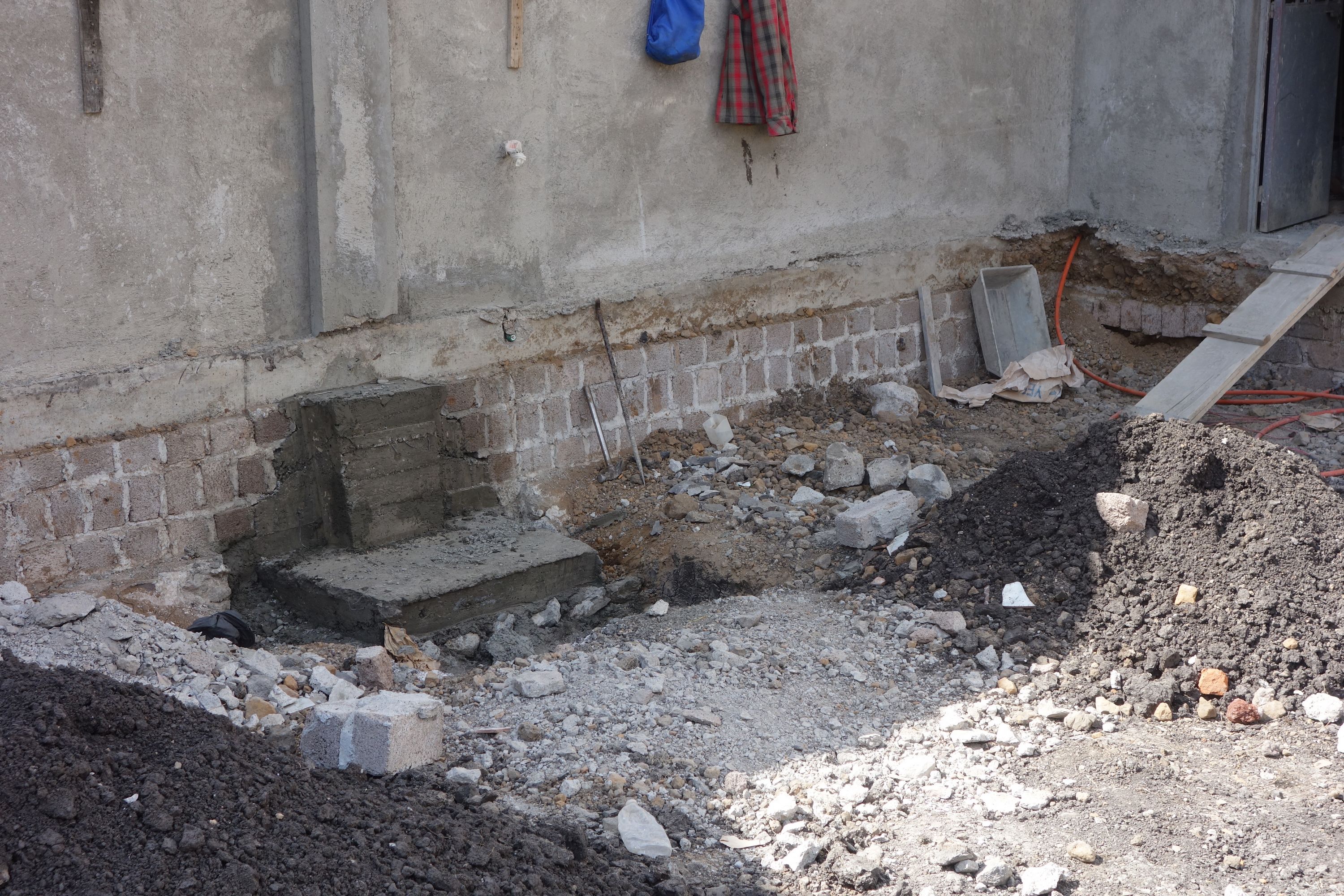 Another area of serious concern is the construction of the septic tank and storage room. We cannot yet see exactly what issues there are with the septic tank; but we do know that it is being used as the foundation of the storage room. This issue is all the more worrying as we are also pretty sure that "maestro" X did not consider it necessary to reinforce its base (despite our clear instructions and photos). However, toward the right of the photo is revealed what "maestro" X did consider necessary to support the storage room between the septic tank and boundary wall: five loose bricks... |
