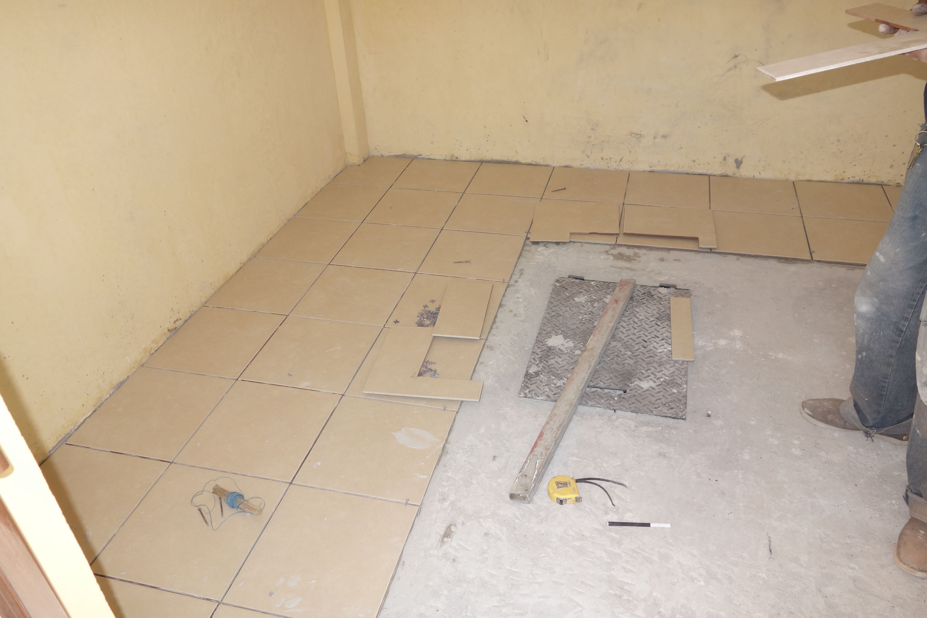 Tiling is being done in the storage room, using the cheapo tile we bought. The covers of the registros will be flush with the tile. |